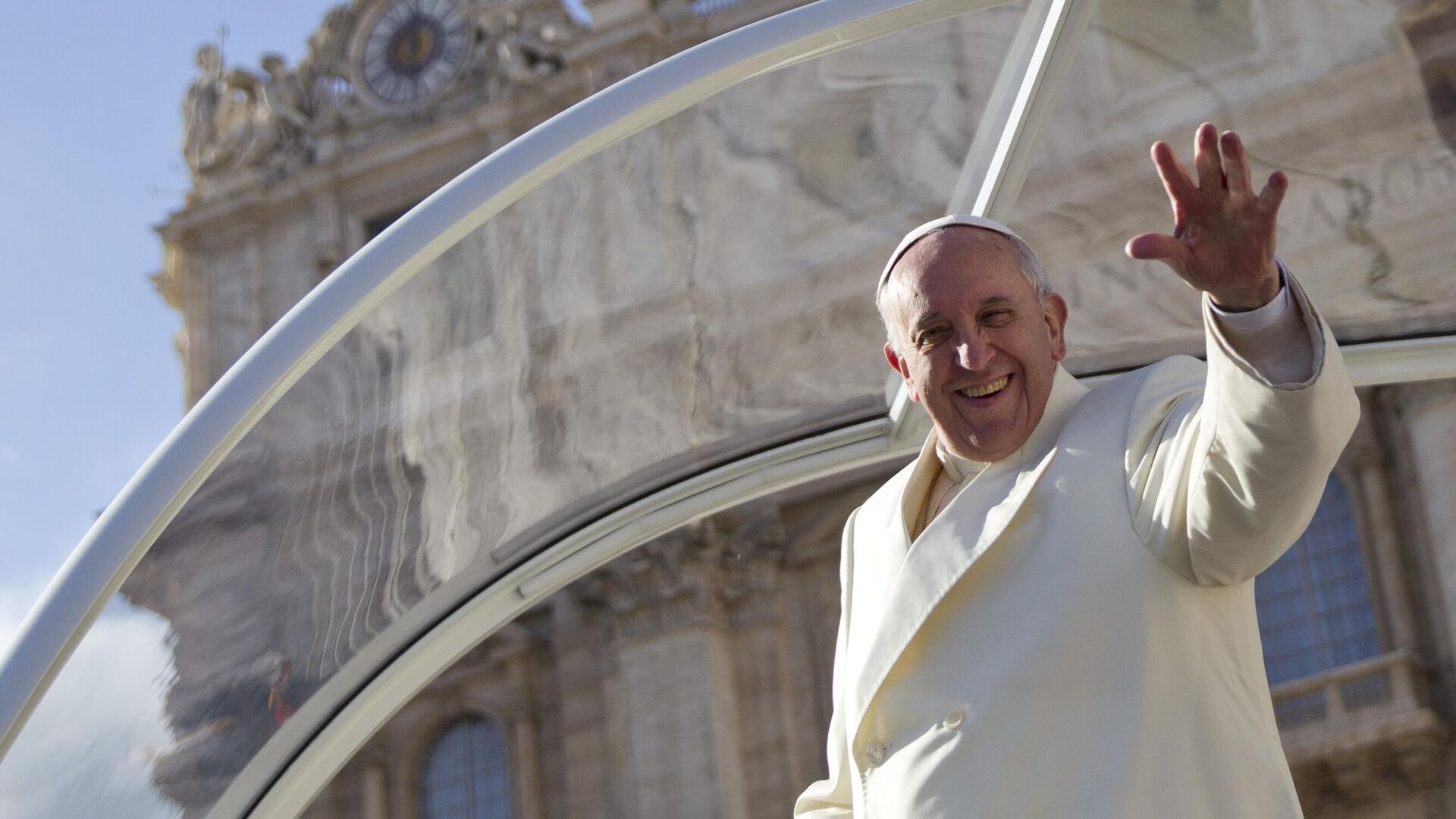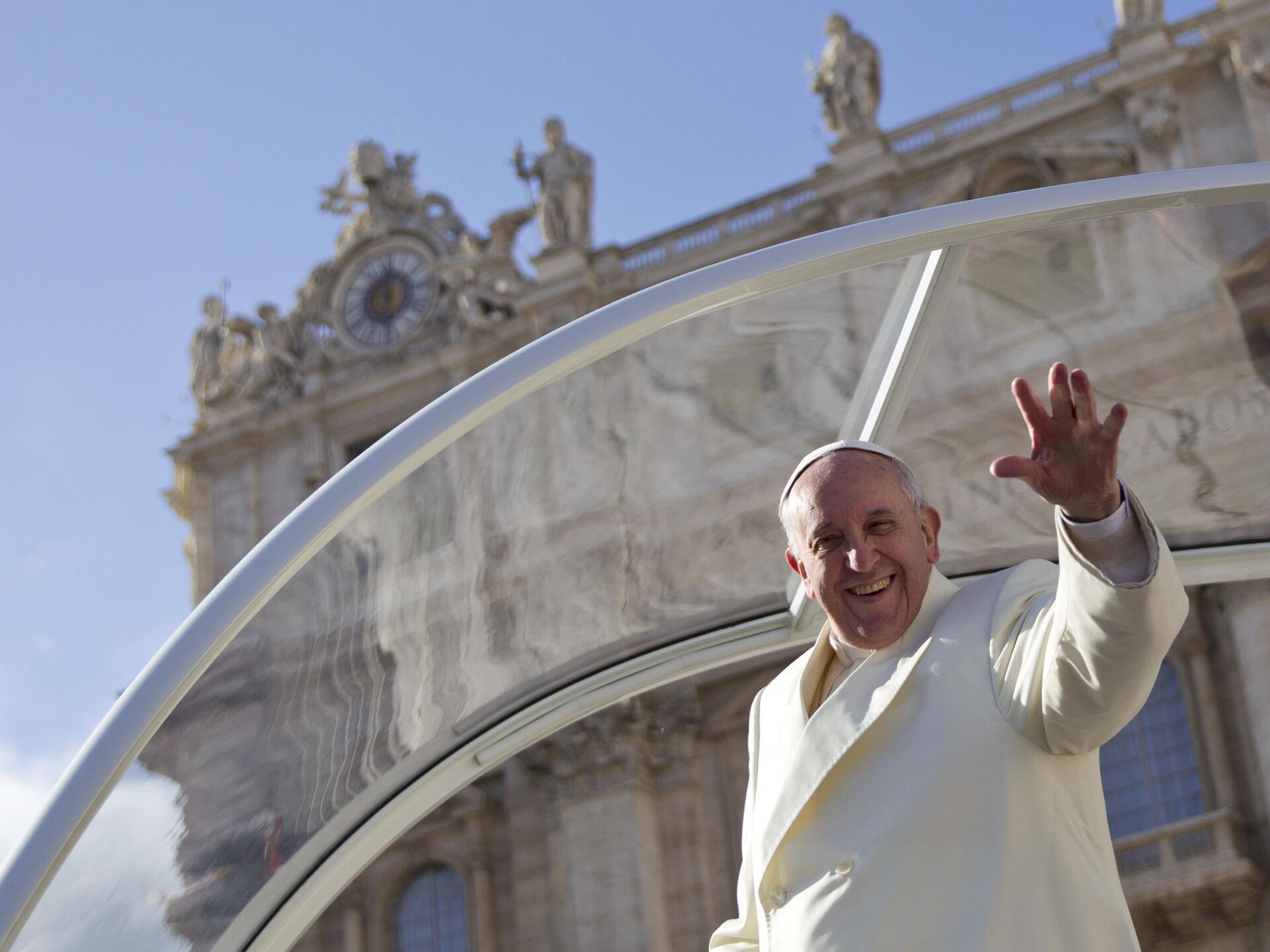© AP Photo / Andrew Medichini البابا فرنسيس يلوح بيده من سيارته البابوية في ساحة القديس بطرس، في الفاتيكان.