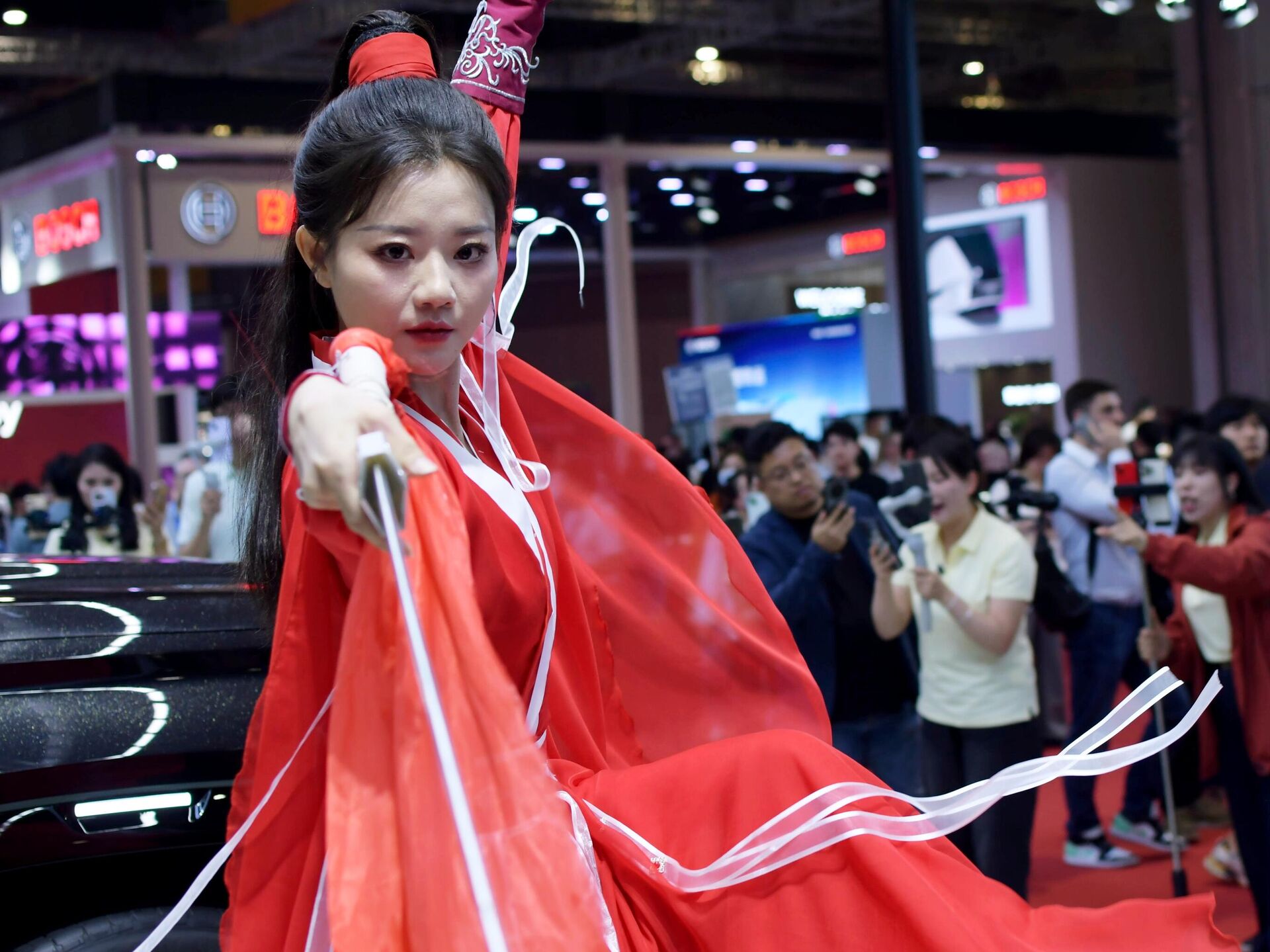 فتاة صينية تقدم عرضا بالسيف أثناء افتتاح معرض شنغهاي للسيارات 2025.