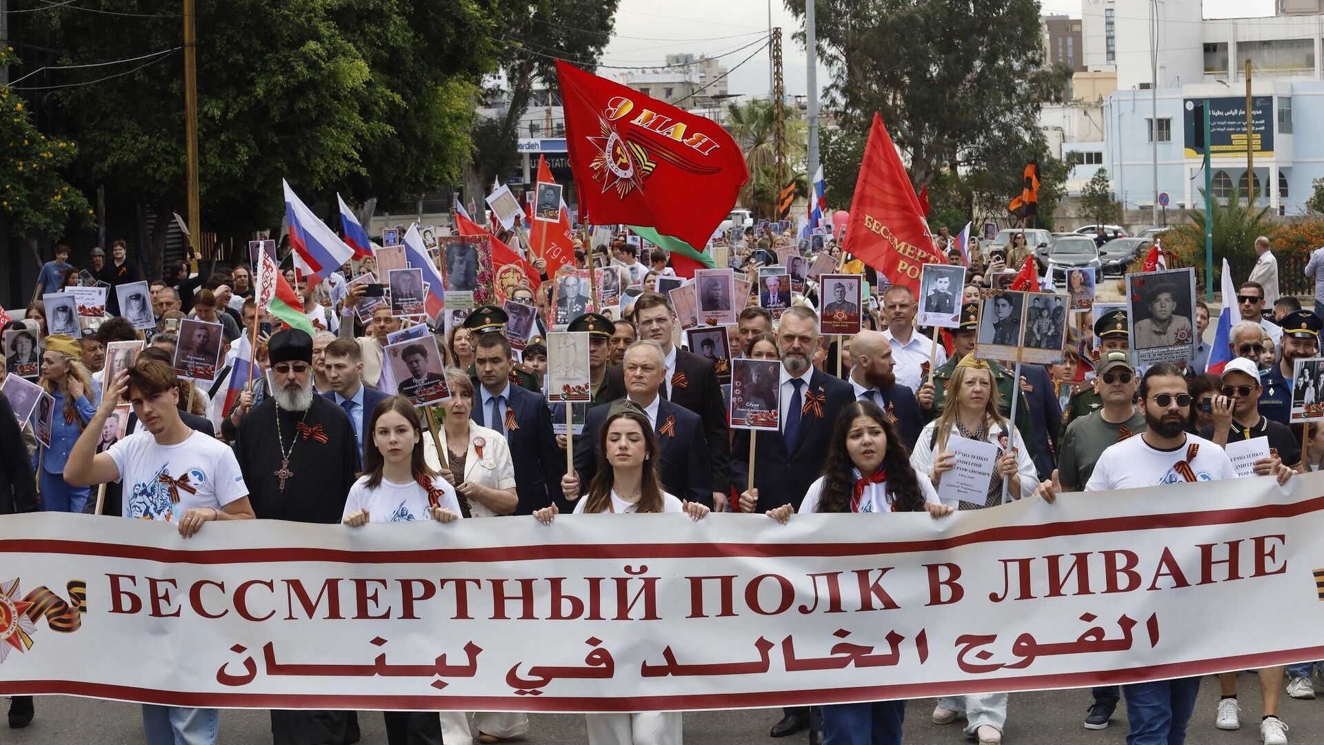 وشارك مئات الأشخاص في المسيرة، تقدمهم السفير الروسي في لبنان ألكسندر روداكوف، ومواطنون روس.