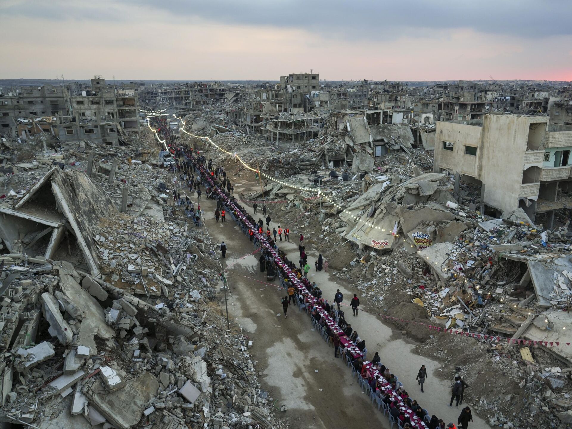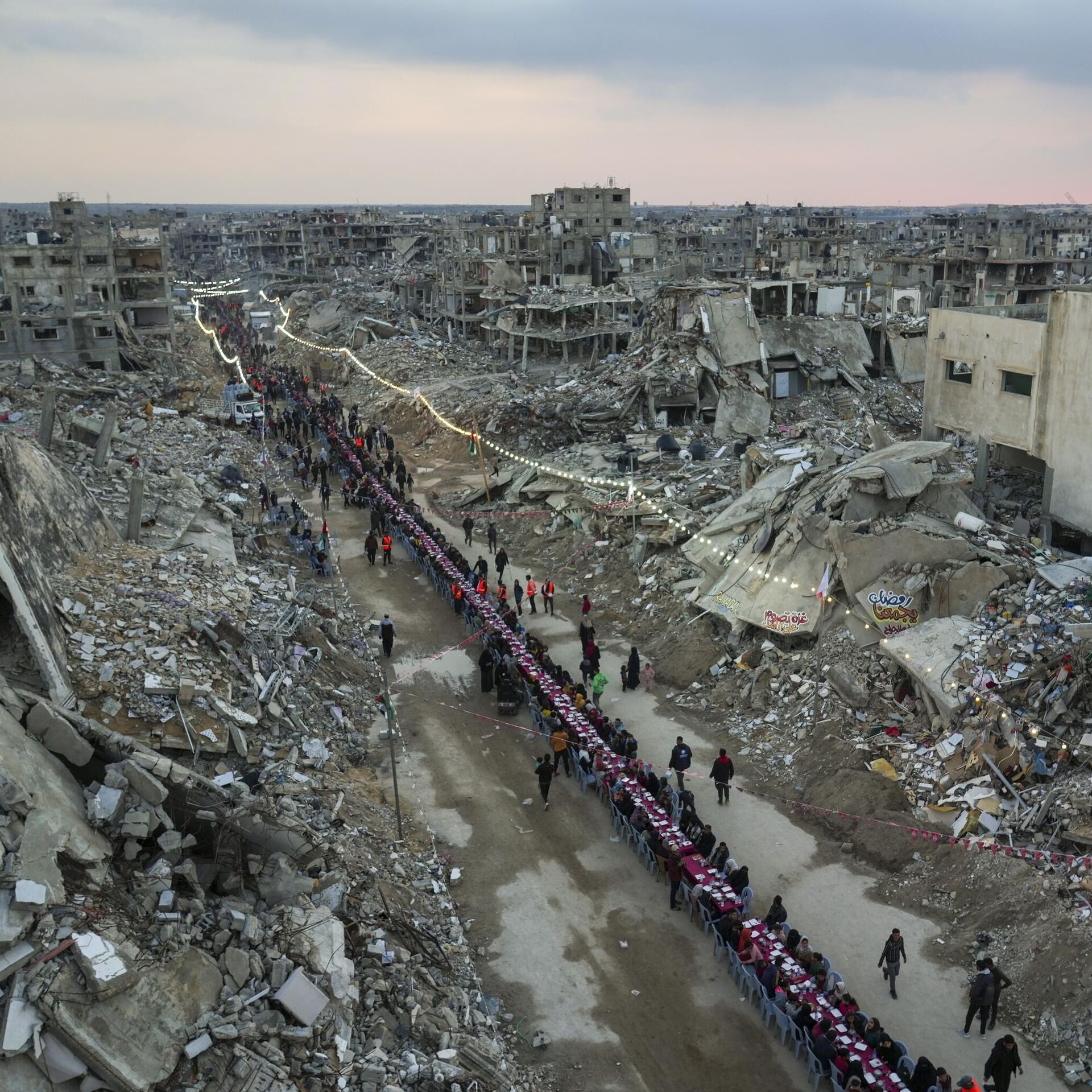 © AP Photo / Abdel Kareem Hanaمع غروب الشمس، يجلس فلسطينيون على طاولة كبيرة محاطة بأنقاض المنازل والمباني المدمرة أثناء تجمعهم لتناول وجبة الإفطار في اليوم الأول من شهر رمضان في رفح، جنوب قطاع غزة، السبت 1 مارس 2025.