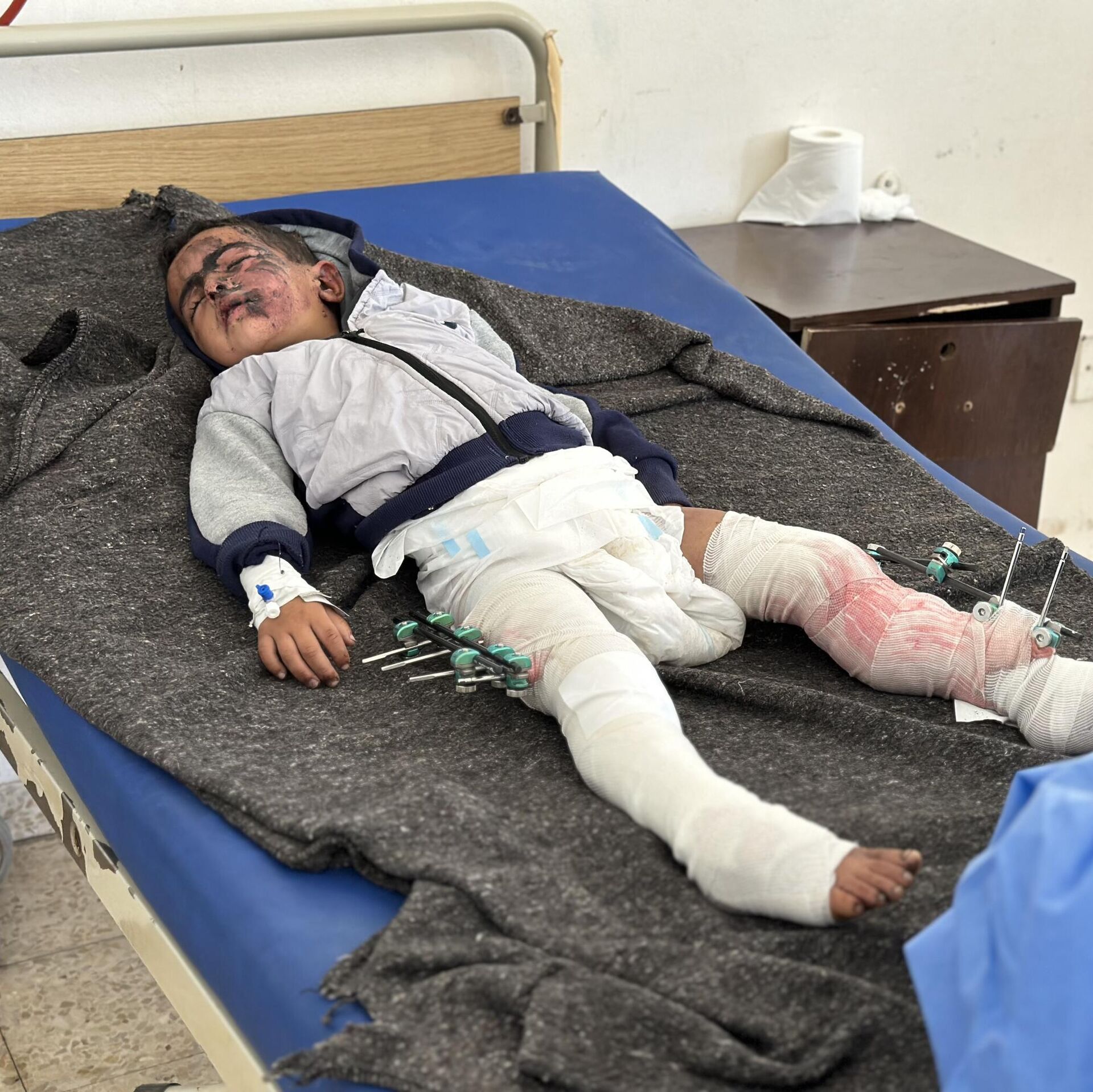 وحسب العرجاني، " يعاني الطفل من حروق في مناطق مختلفة من الجسم، بالإضافة إلى كسر في الفخذ الأيمن والقدم اليسرى، وهي كسور معقدة، ويعاني من إصابة في العين اليسرى، تتم معالجتها حاليا".