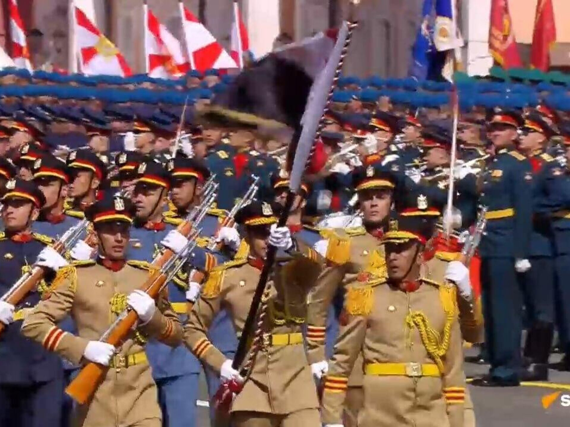 ووقف الرئيس المصري عبد الفتاح السيسي خلال عبور الوحدات المصرية لساحة العرض، حيث يتواجد الزعيم المصري على المنصة المخصصة للضيوف الزعماء الذين حضروا الحفل، وجلسوا إلى جانب الرئيس الروسي فلاديمير بوتين.