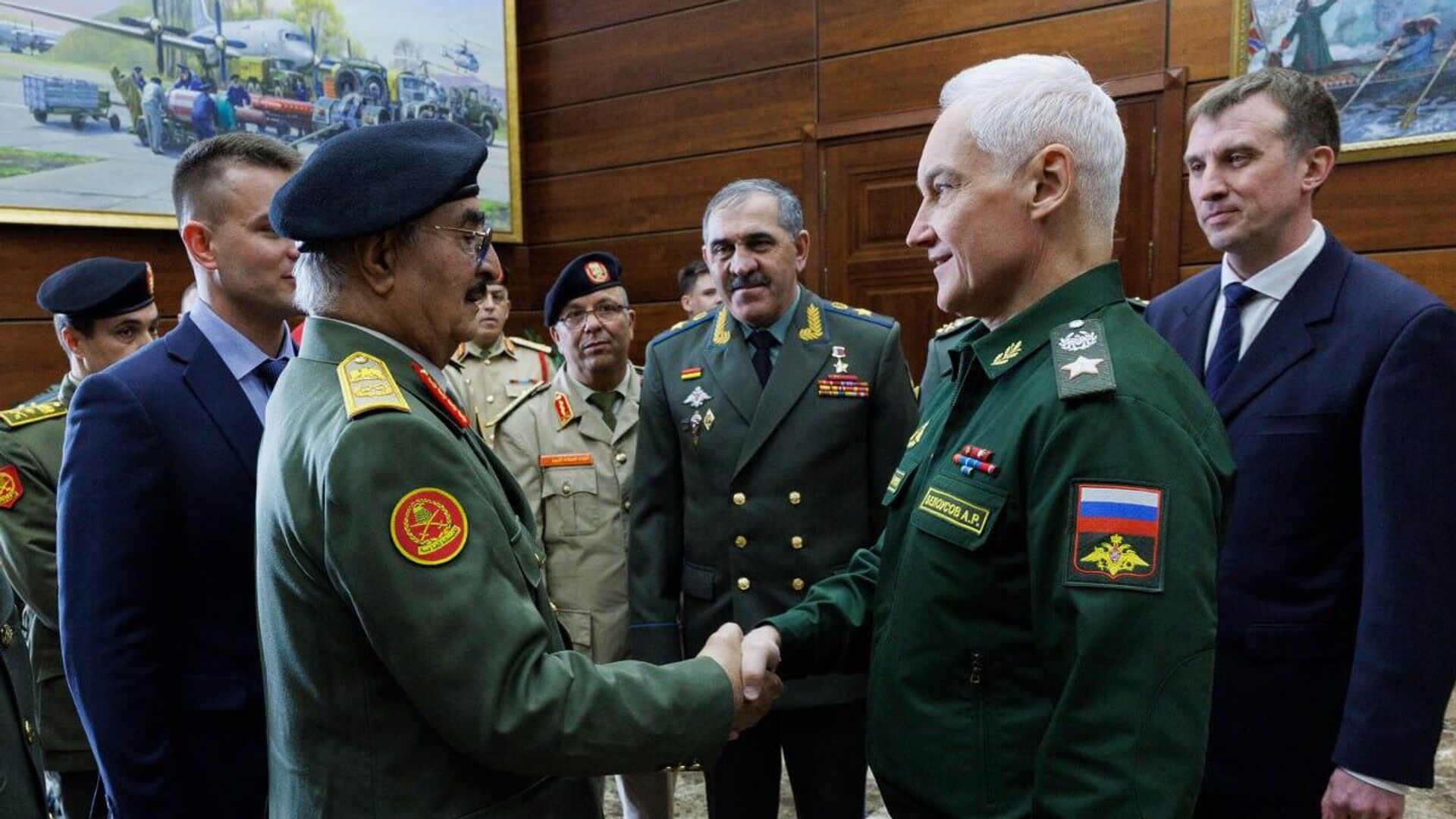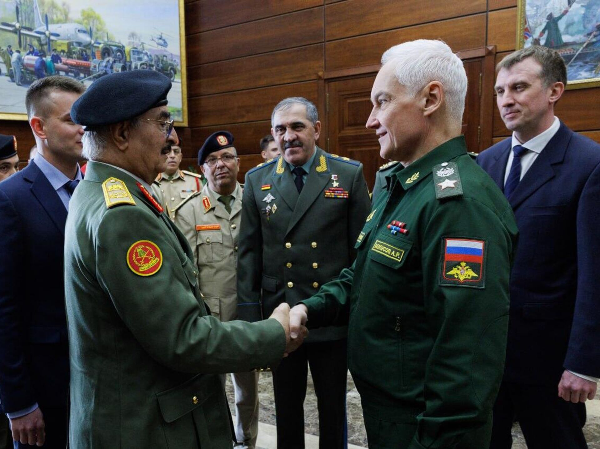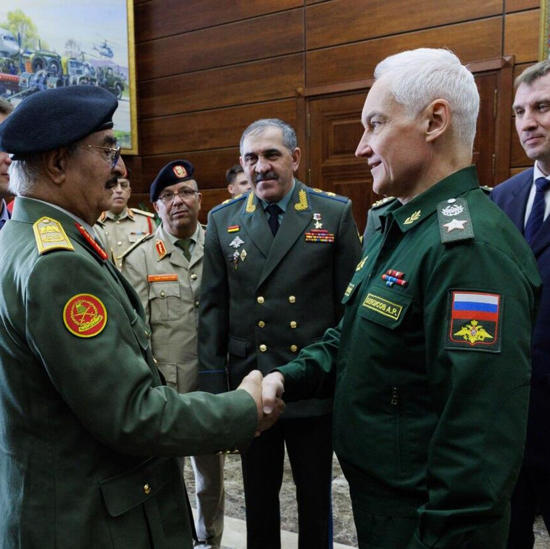 وناقش قائد الجيش الوطني الليبي، المشير خليفة حفتر، ووزير الدفاع الروسي، أندريه بيلاوسوف، تعزيز التعاون العسكري بين البلدين.