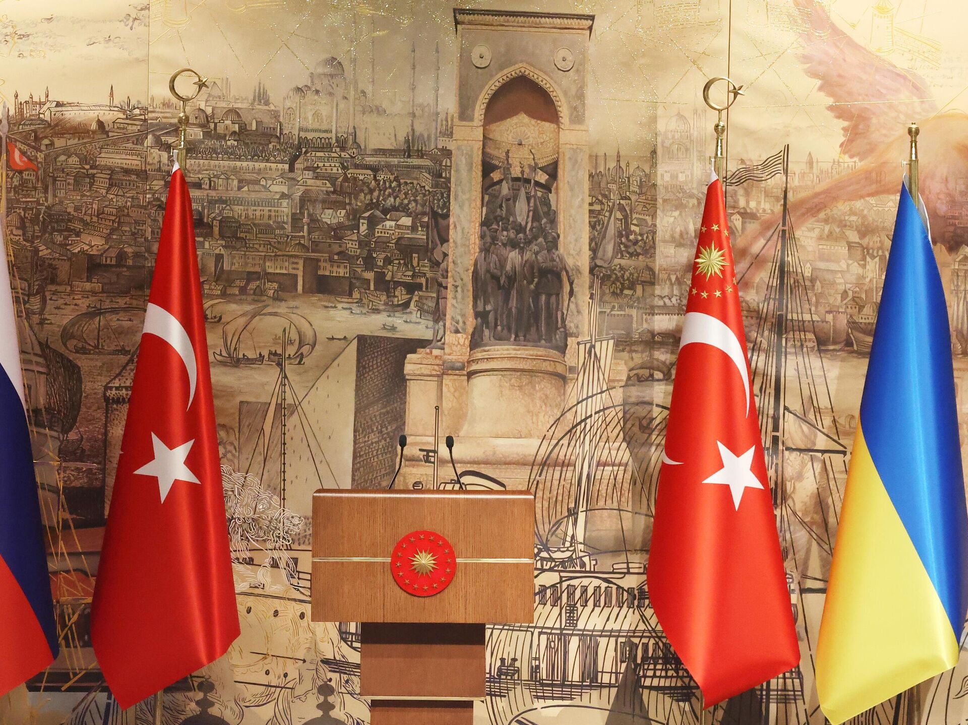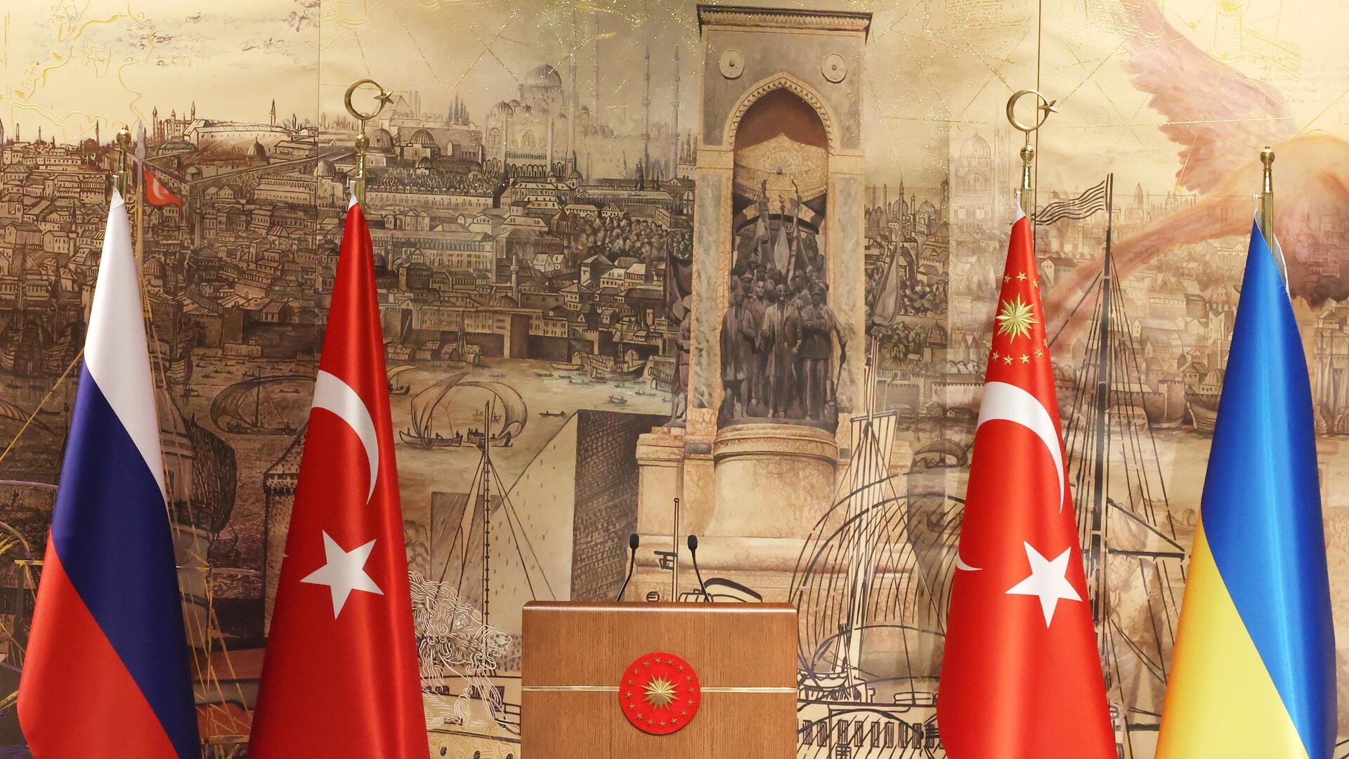 © Sputnik . POOL / الانتقال إلى بنك الصورالأعلام الروسية والتركية والأوكرانية في المفاوضات في اسطنبول