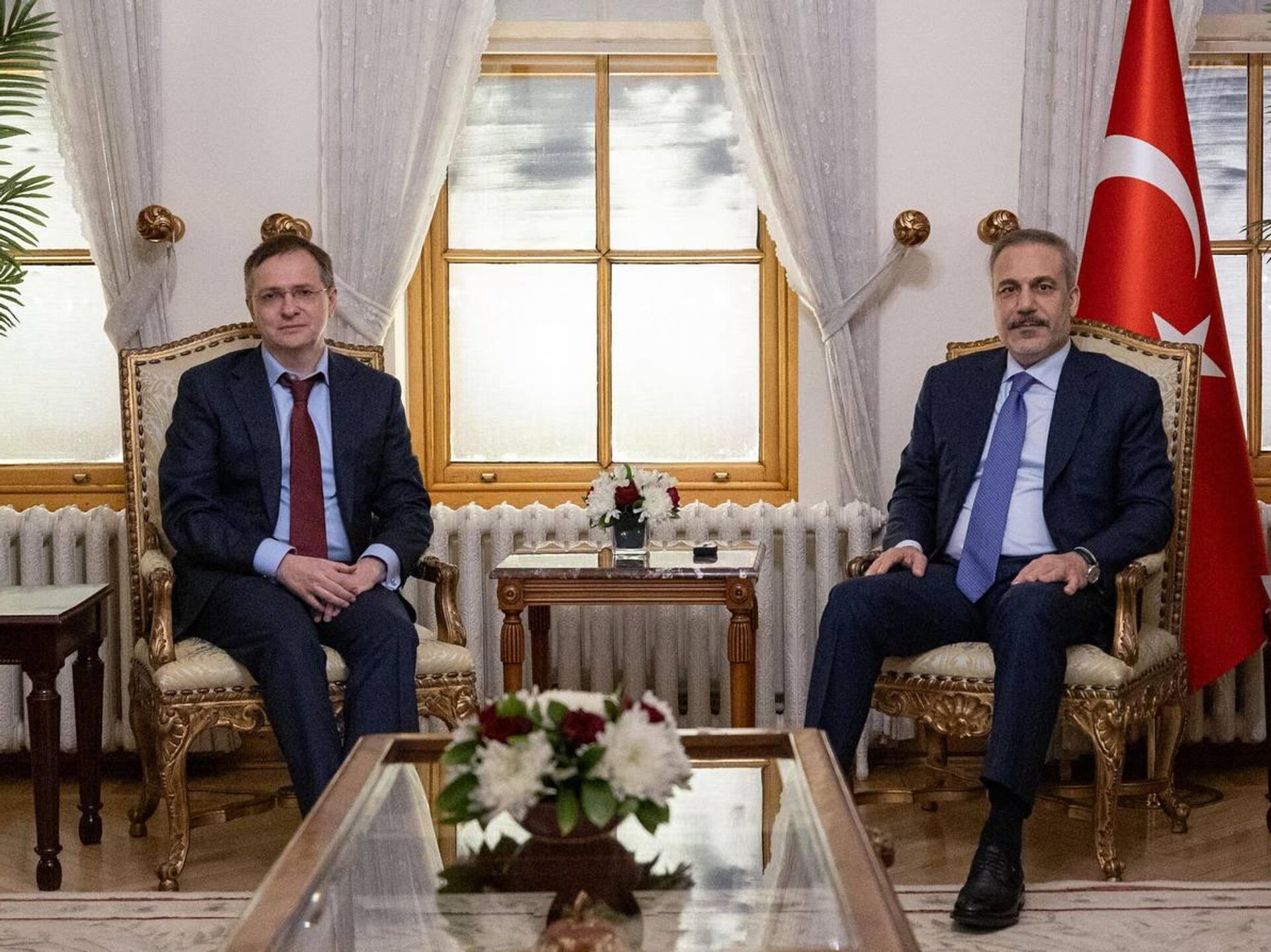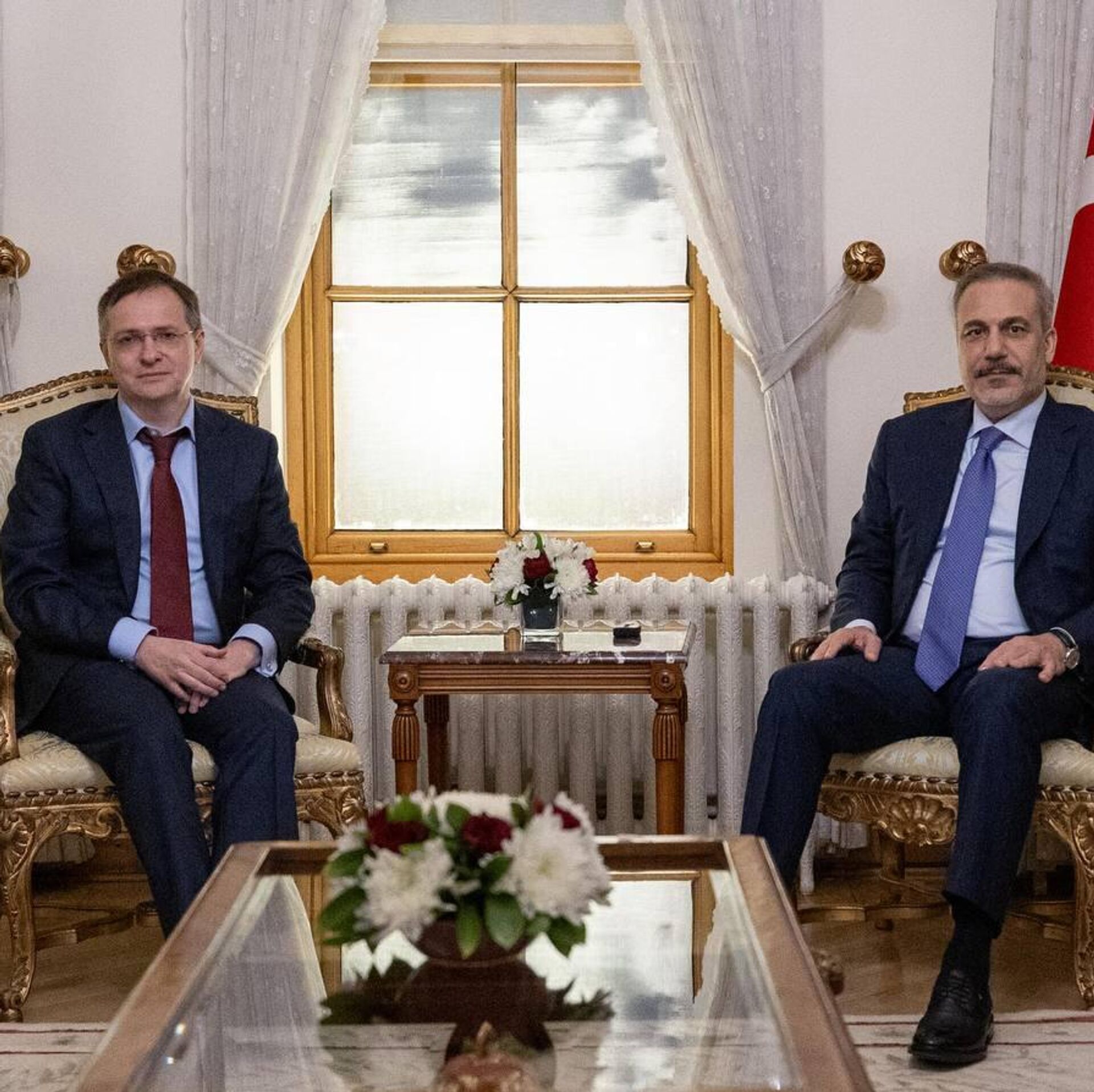 © Sputnikوزير الخارجية التركي، هاكان فيدان، ورئيس الوفد الروسي المفاوض فلاديمير ميدينسكي
