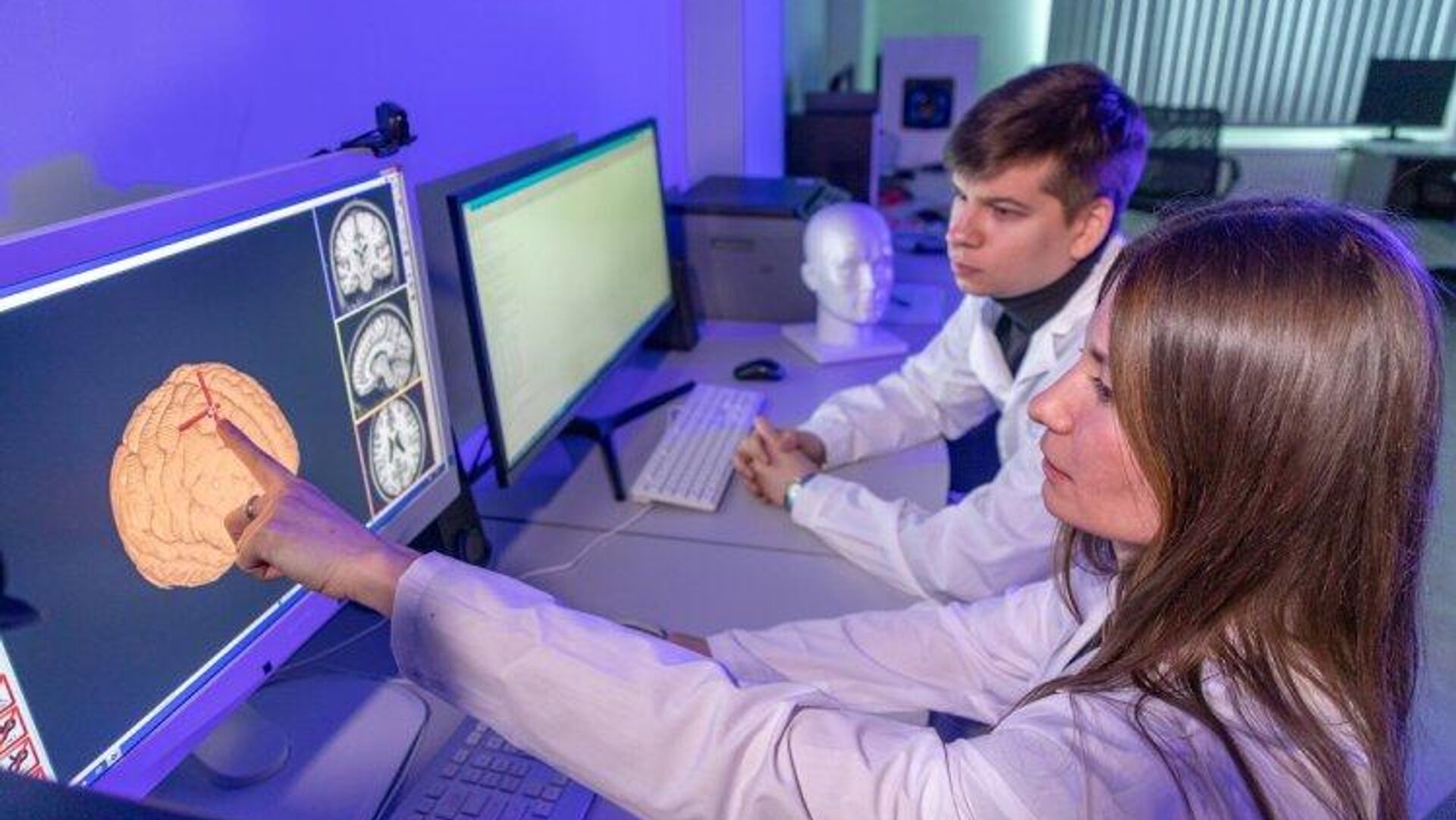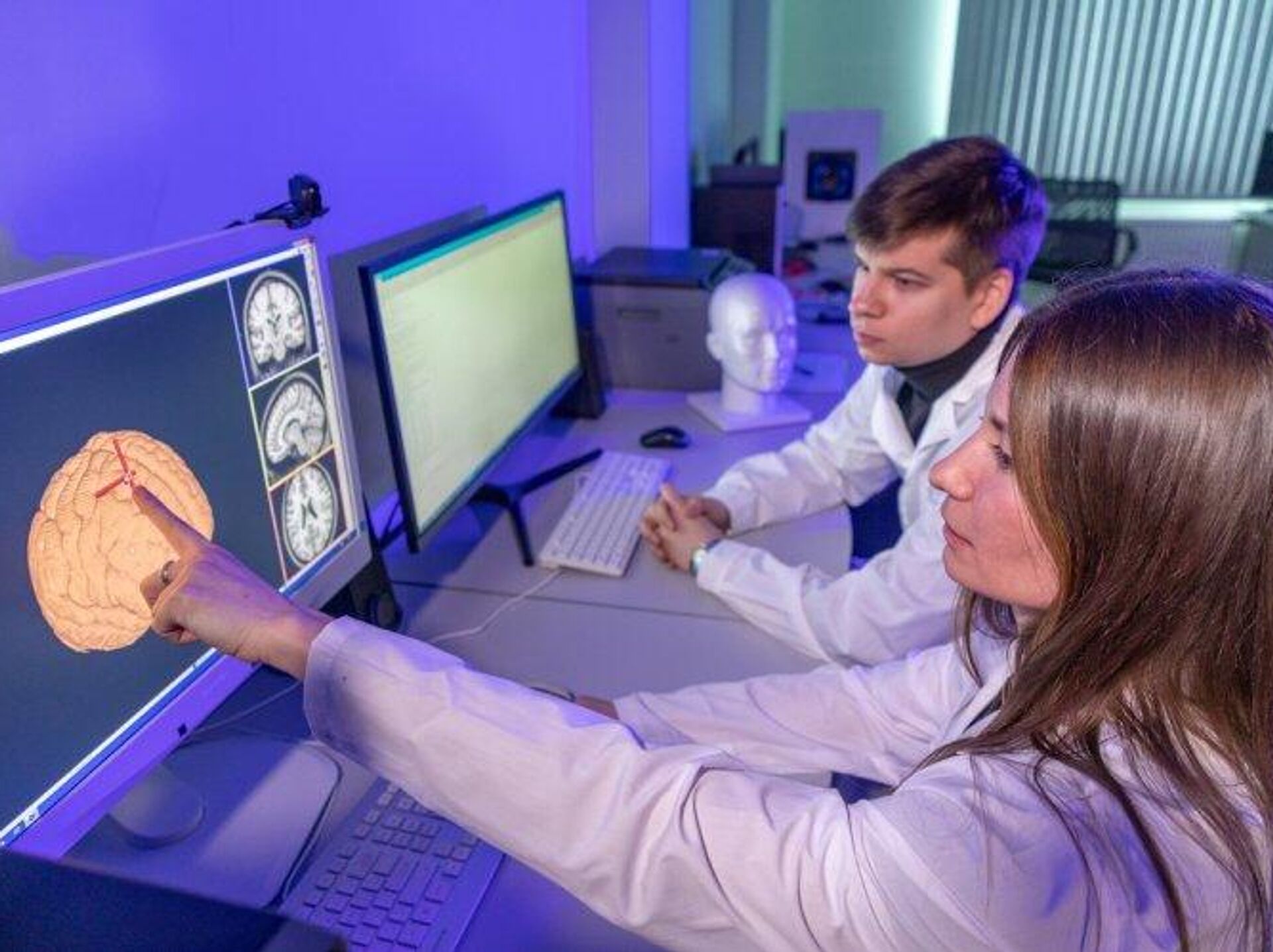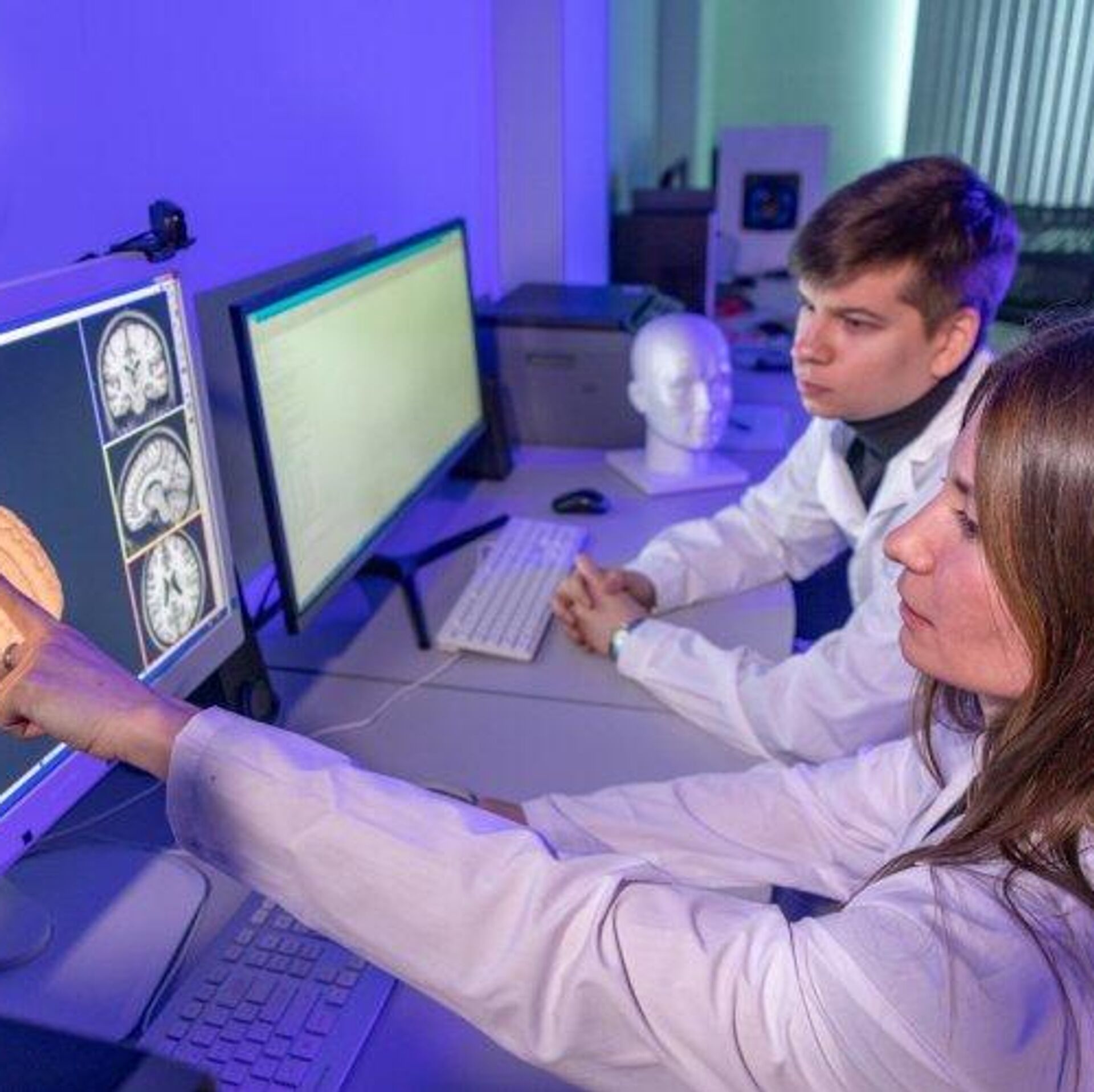 الباحثون في المختبر العلمي لبحوث الديناميكا العصبية والتقنيات المعرفية في جامعة نيجني نوفغورود أثناء أداء عملهم.