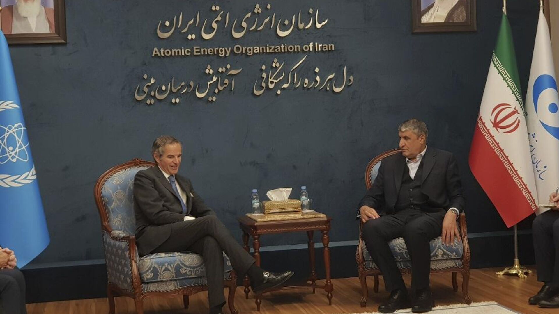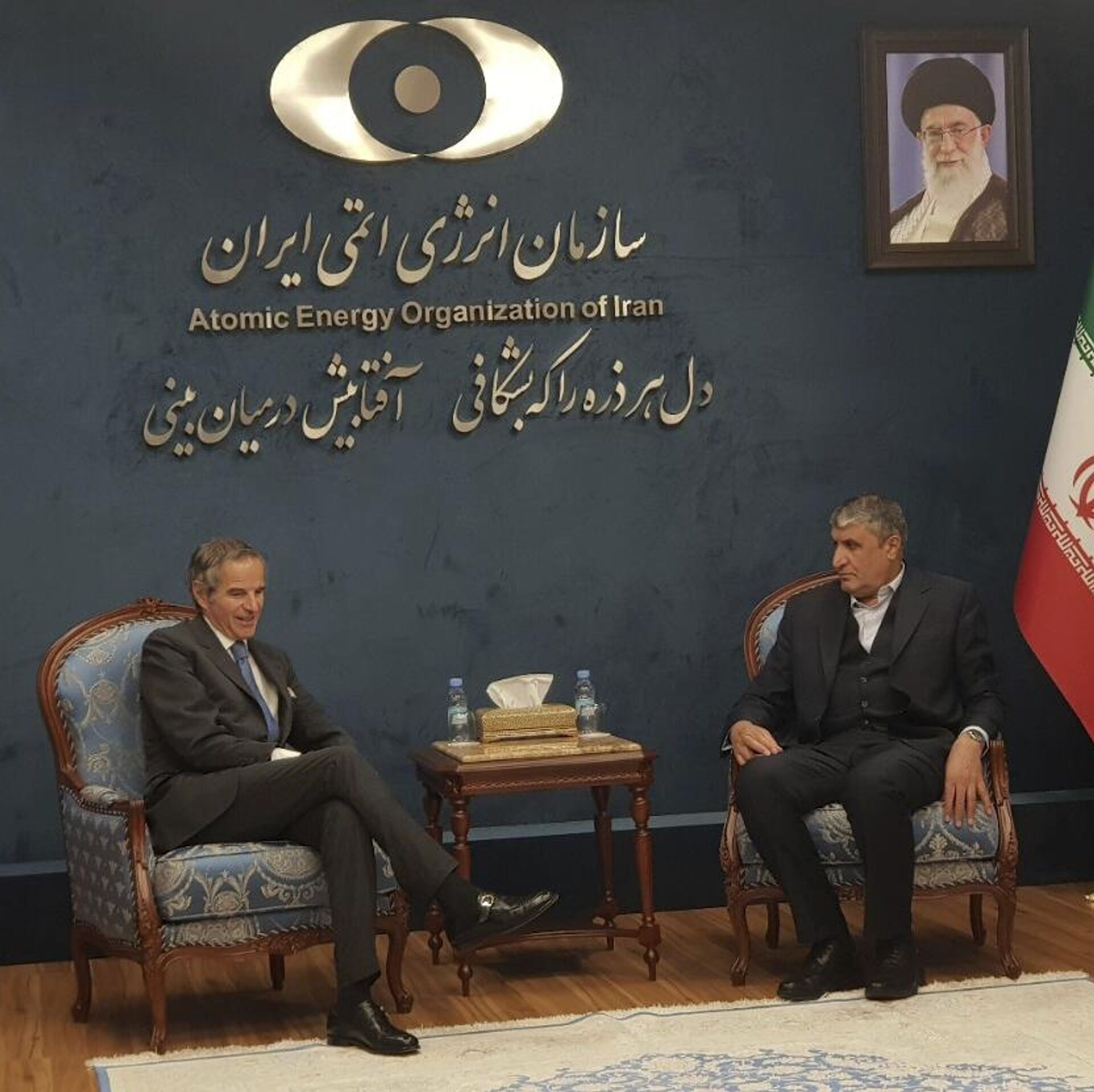 © AP Photoرئيس منظمة الطاقة الذرية الإيرانية محمد إسلامي، يستقبل المدير العام لوكالة الطاقة الذرية الدولية رافائيل غروسي في طهران، الجمعه 3 مارس/ آذار 2023.