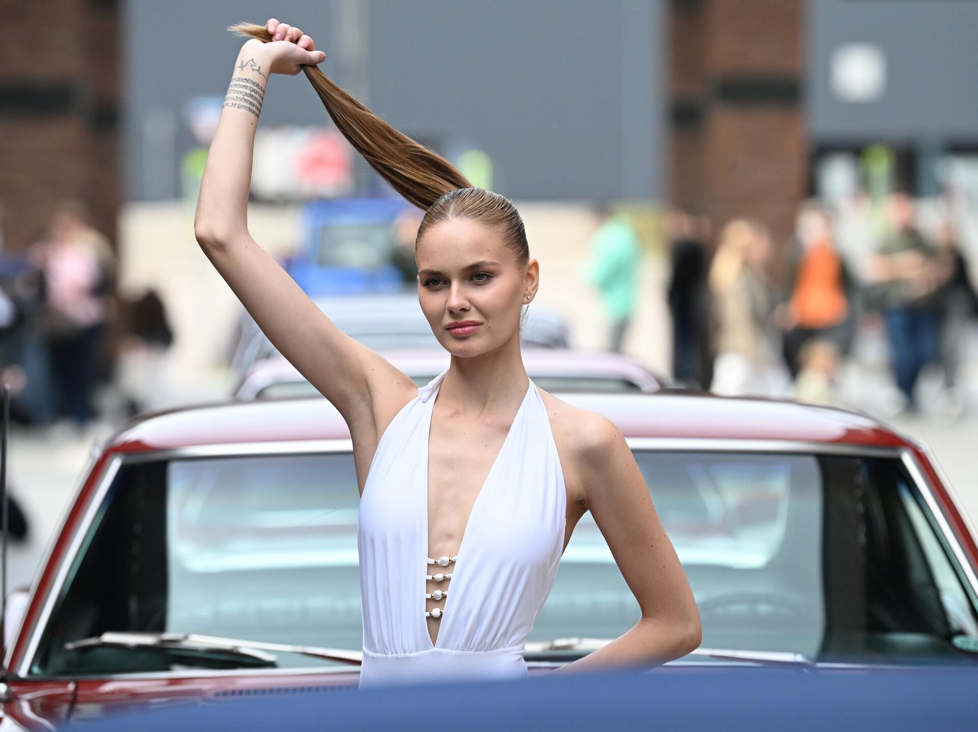 فتاه ترتدي زيل مشابها للون سيارتها في التجمع السنوي للسيارات الكلاسيكية على أراضي مجمع التسوق "أرخانغيلسكوي أوتليت"