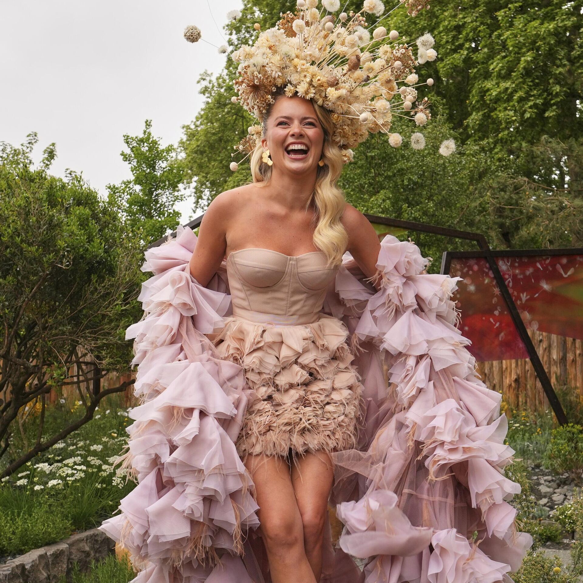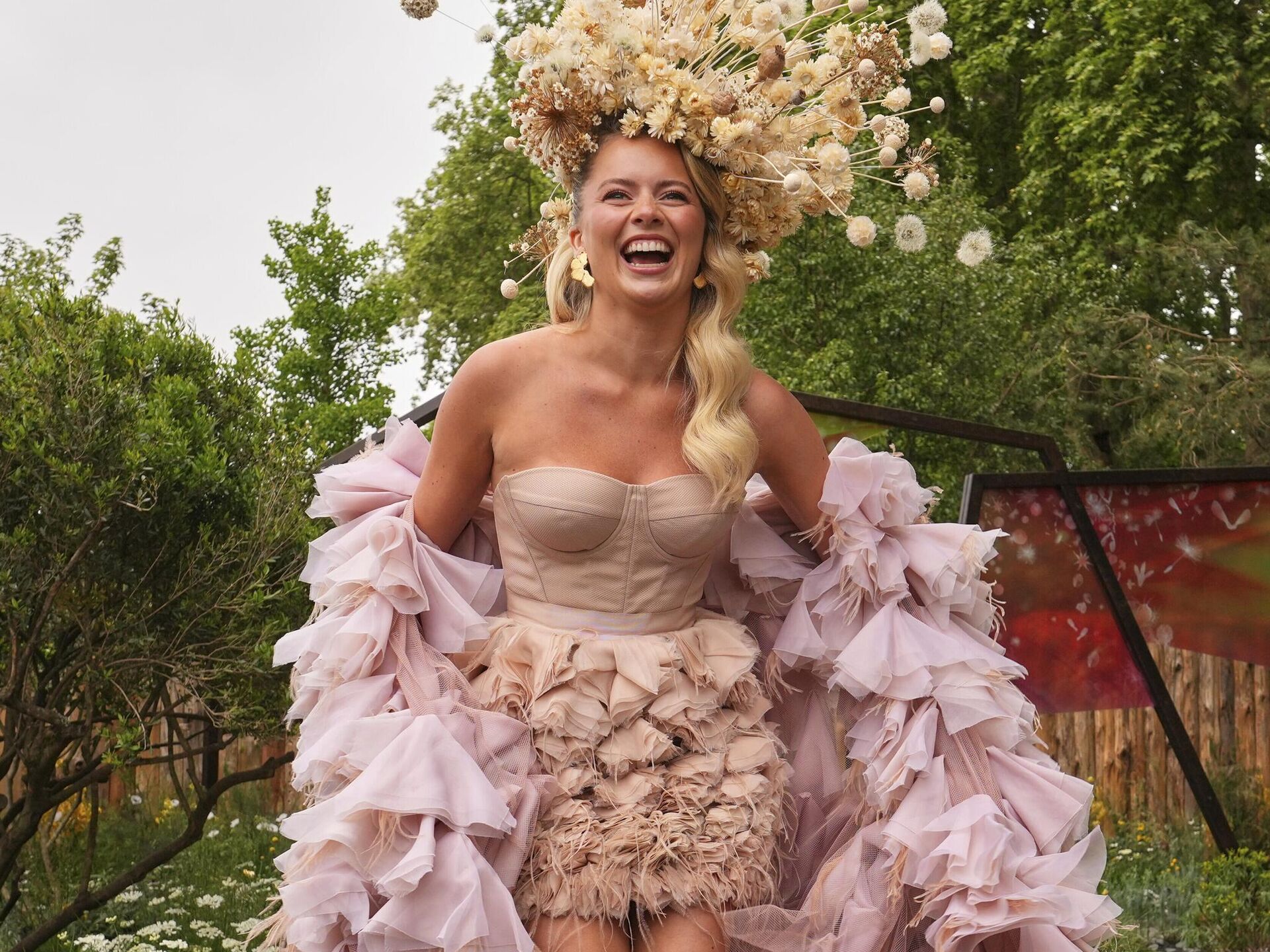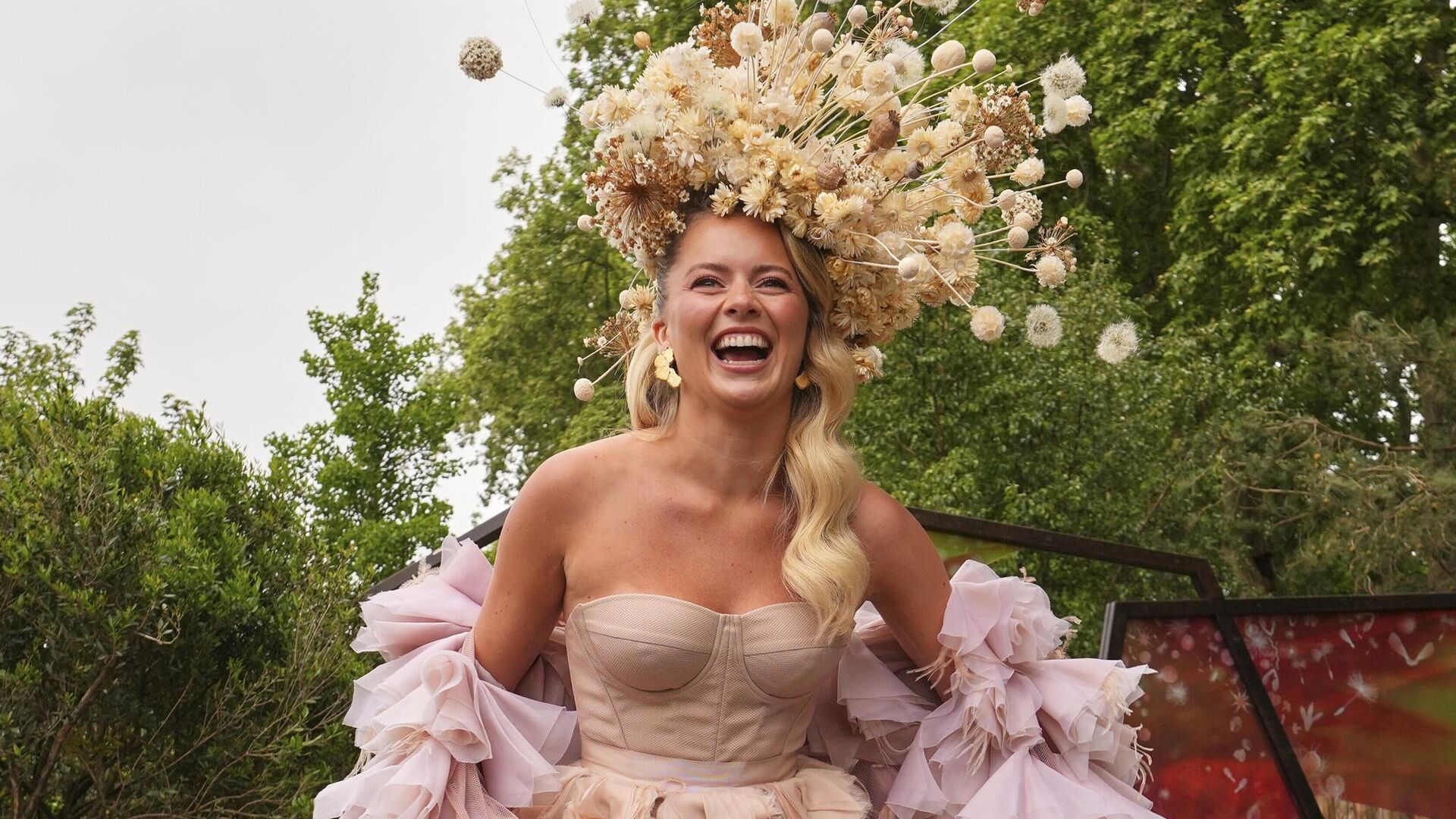 عارضة الأزياء والراقصة تاشا غوري، سعيدة بارتداء غطاء للرأس من حديقة "King's Trust"، التي صممها جو بيركنز، في معرض تشيلسي للزهور التابع للجمعية الملكية البريطانية للبستنة في لندن، يوم الاثنين 19 مايو 2025