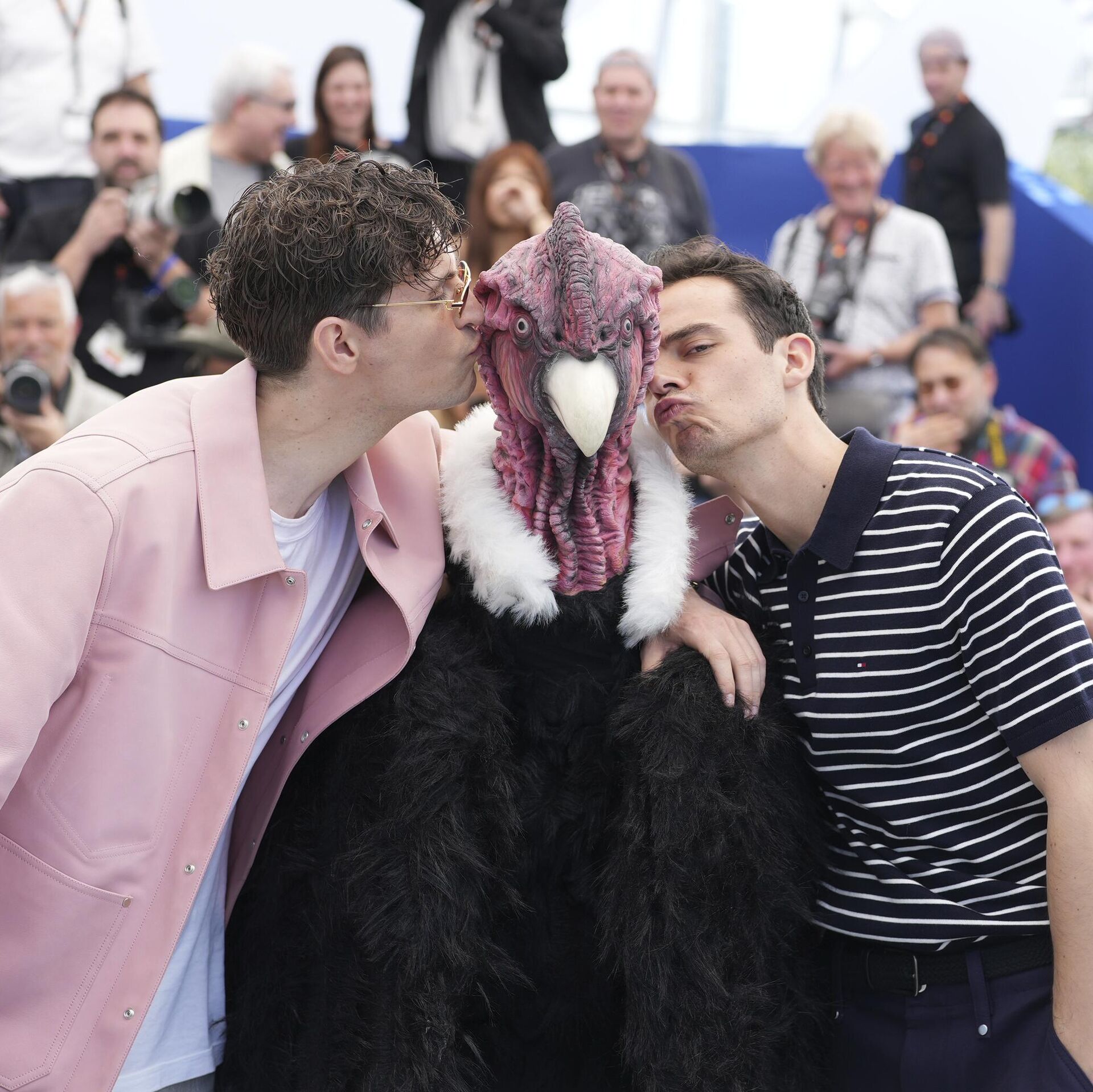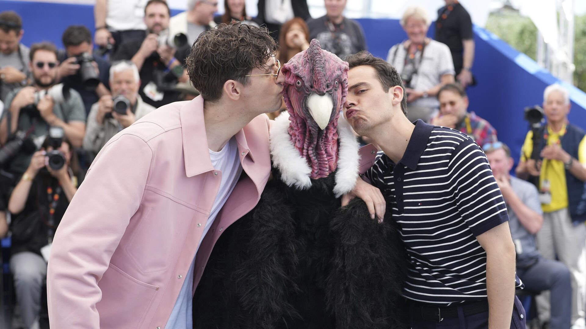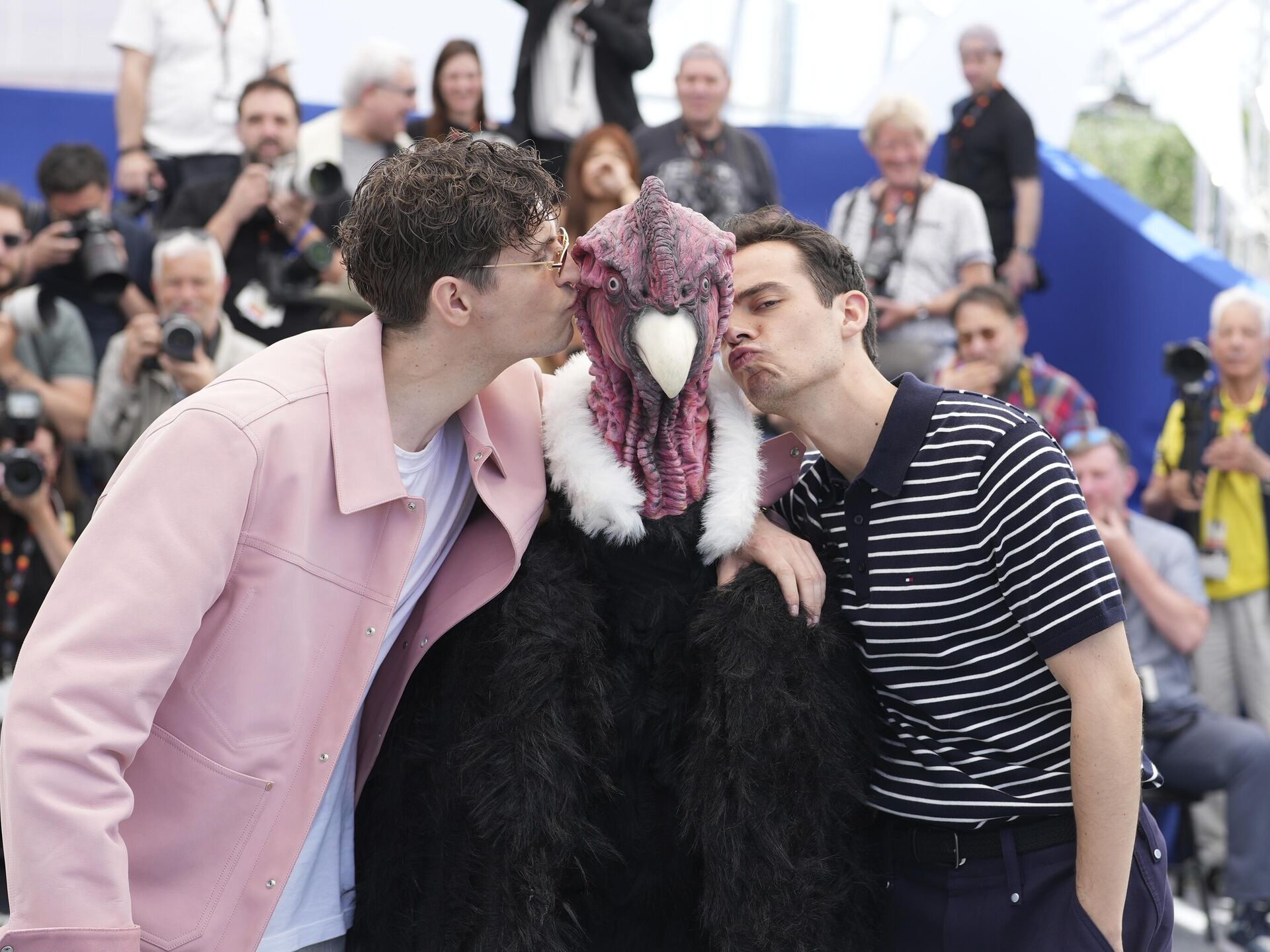 © AP Photo / Natacha Pisarenko المخرج رافائيل كينار (يسار الصورة)، ورجل يرتدي زي طائر، والمخرج هوغو ديفيد (يمين الصورة) يقفان أمام المصورين في مهرجان كان السينمائي الدولي الثامن والسبعين.