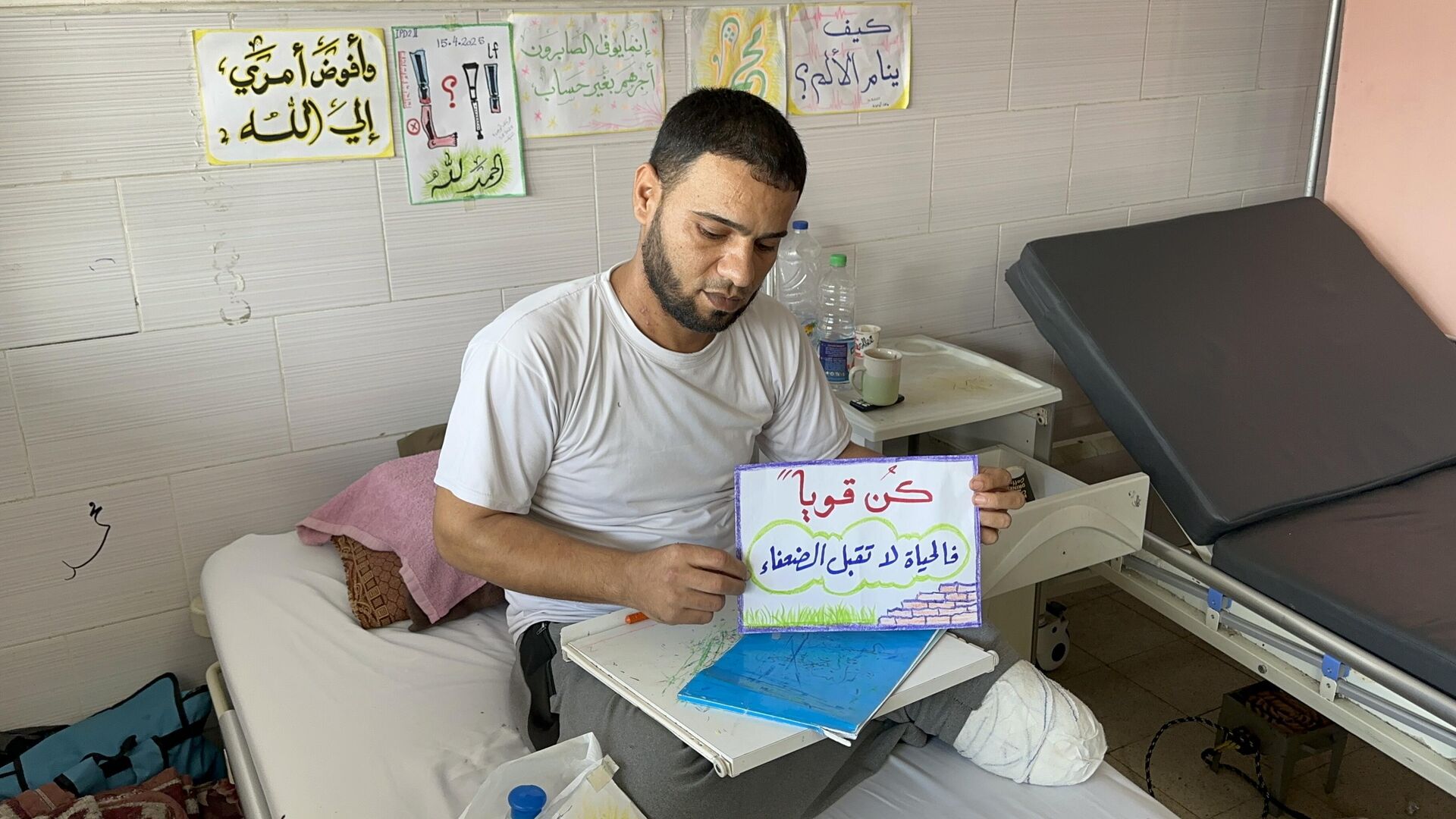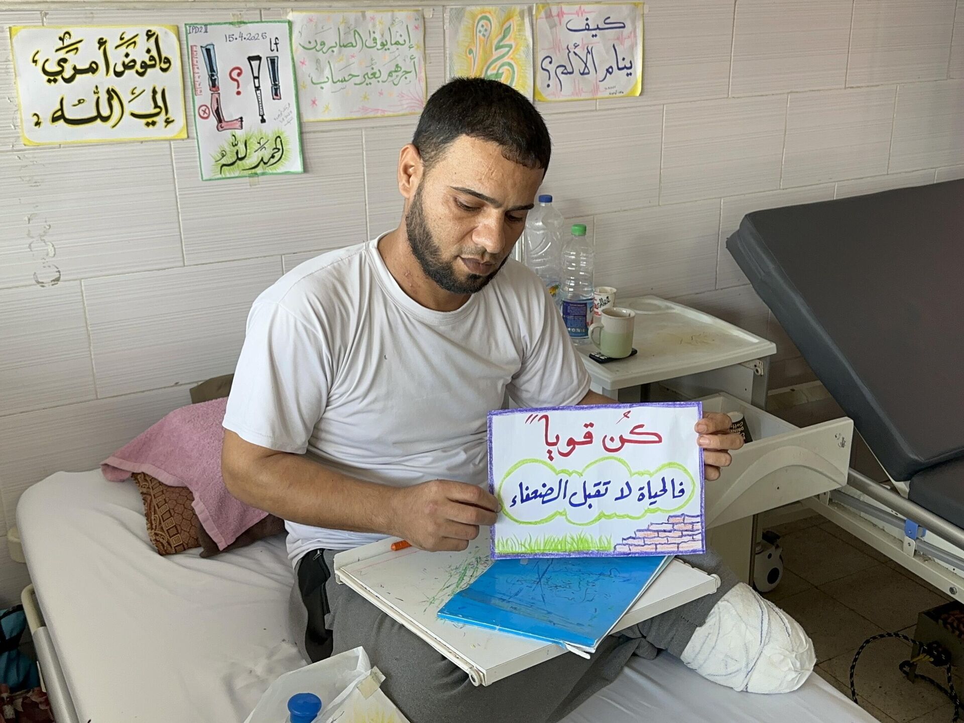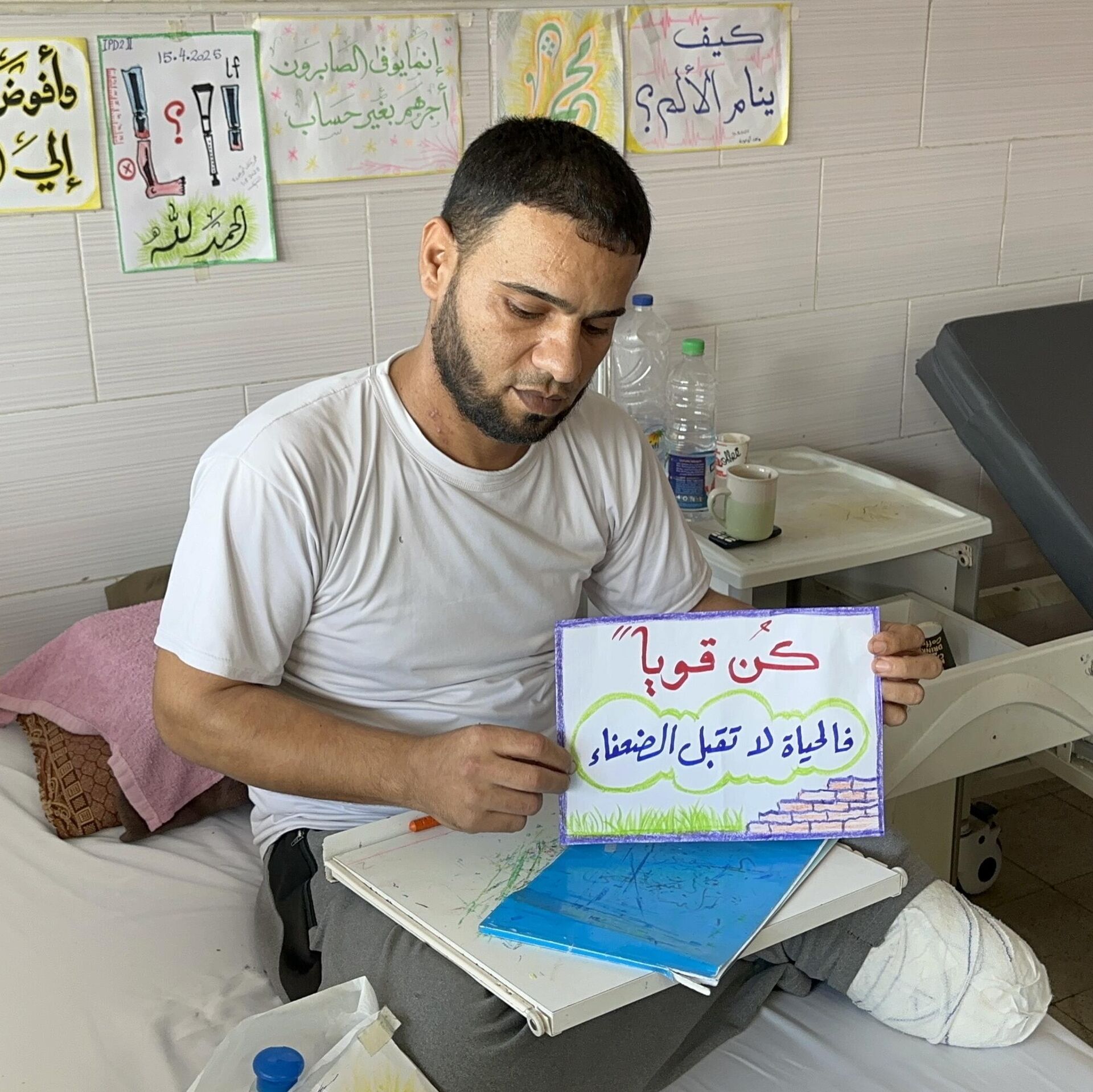 وأضاف: "خلال فترة مكوثي في المشفى، وجدت في الرسم طريقة للتعبير عن معاناتي، وكذلك معاناة بقية الجرحى والمرضى، وأقوم برسم لوحات جميلة وعليها عبارات تحفز المصابين وتدعم صمودهم، ومنذ أكثر من 3 أشهر، بدأت بتعلم الرسم، ومهاراتي تتطور يوما بعد يوم، وقد استطعت رسم لوحة عن مراحل معاناتي مع البتر، وهذه لوحة قدمي قبل البتر، وبجانبها صورة البتر ومراحل توقعي للفترة القادمة، وفي نهاية اللوحة كتبت الحمد لله، وأيضا أقوم بكتابة جمل عن الصبر والصمود، وخاصة نحن في مشفى، وكل شيء حولك يشعرك بالقلق والخوف والمرض، وهذه اللوحات الملونة والجميلة، هي أمل في عيون من ينظر إليها".