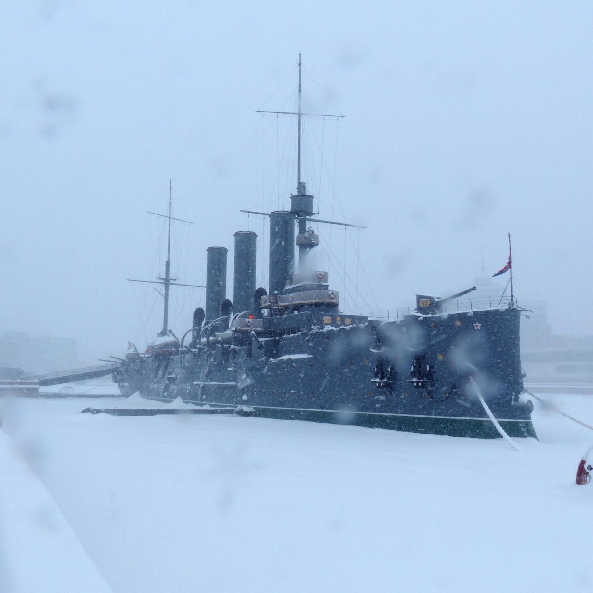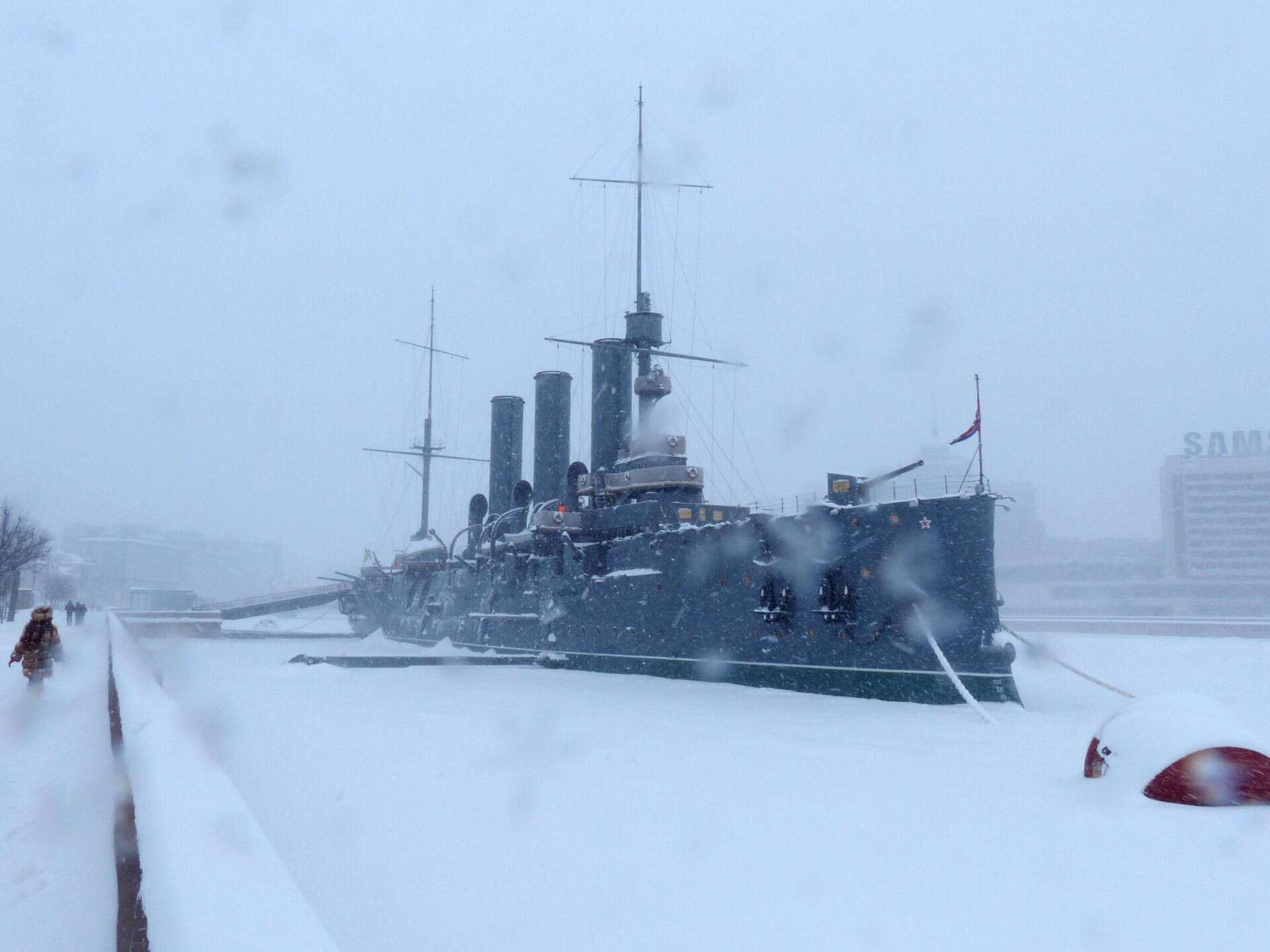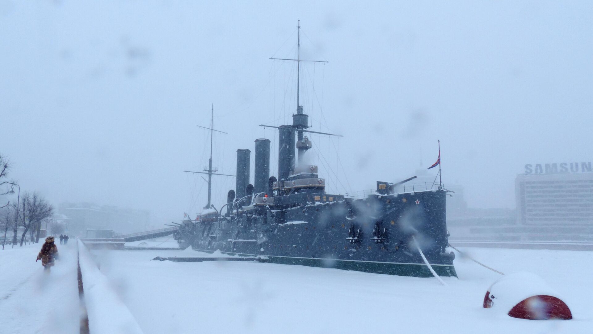 الطراد "أورورا" في مرساه الدائم على جسر "بتروجرادسكايا" على نهر الـ"نيفا" بالقرب من مبنى مدرسة "ناخيموف" البحرية في مدينة سان بطرسبورغ الروسية