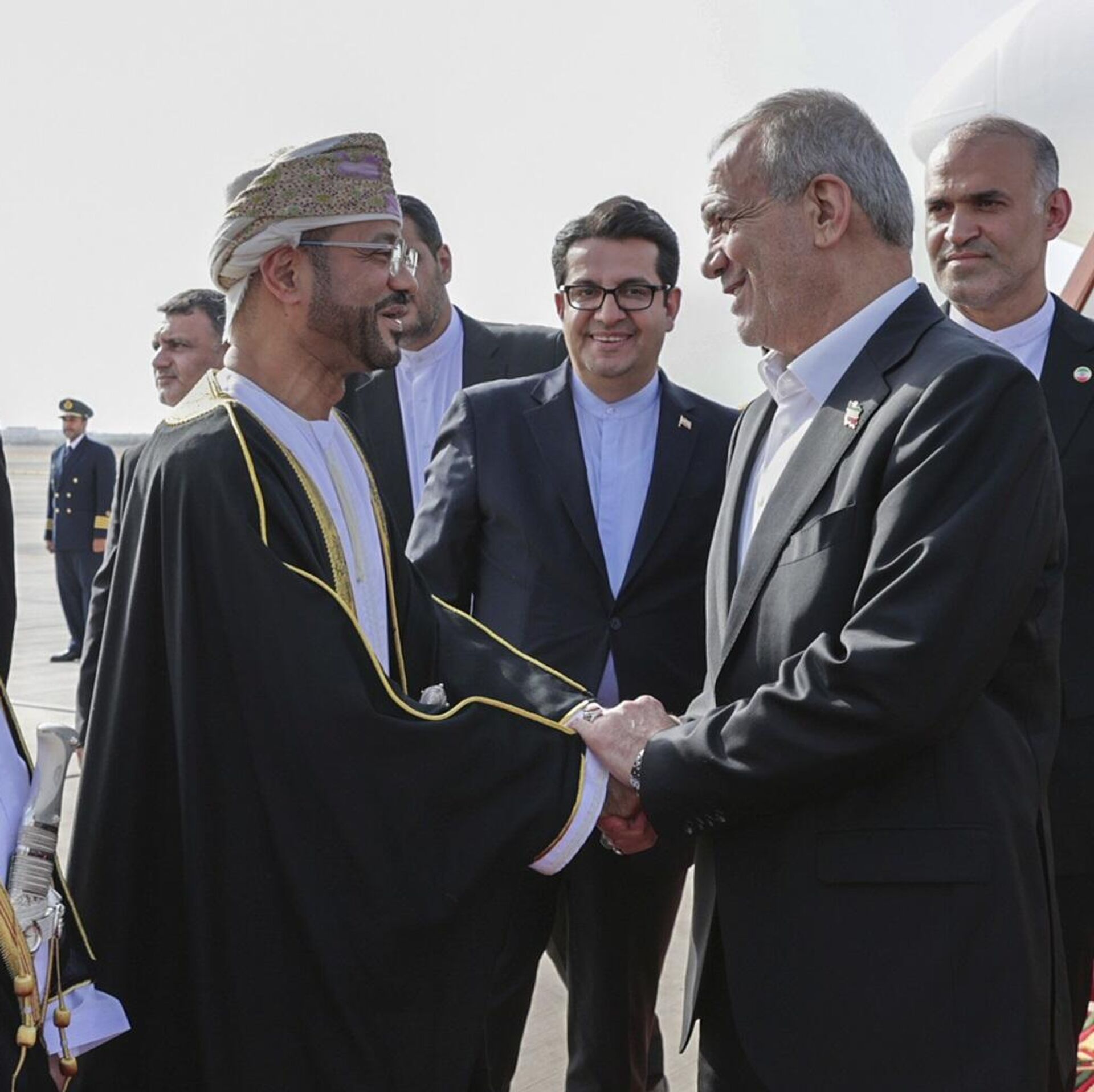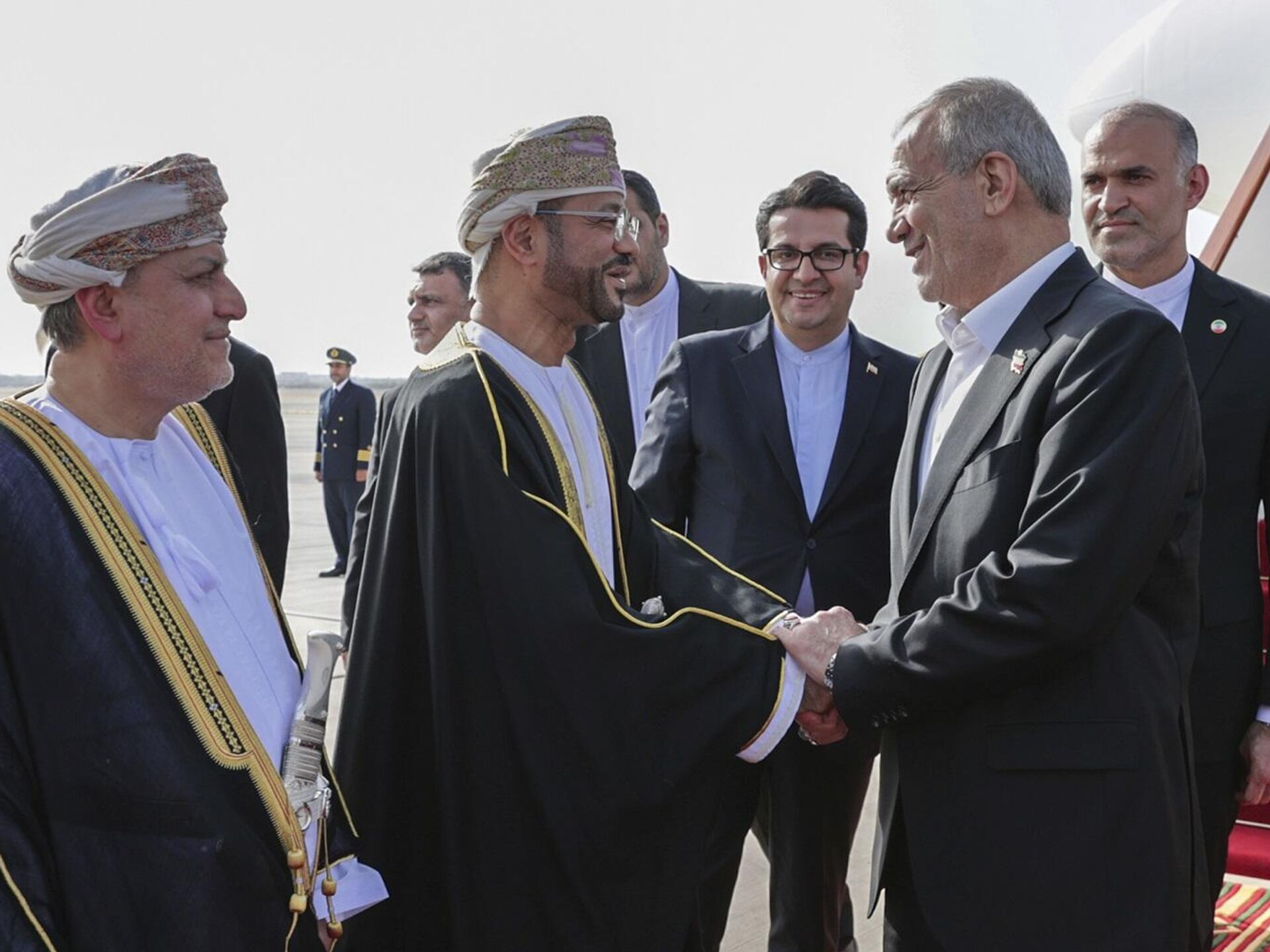 وكانت مراسم استقبال رسمية أقيمت في قصر العلم للرئيس الإيراني لدى وصوله سلطنة عمان، تخللها عزف النشيدين الوطنيين، واستعراض حرس الشرف، وإطلاق 21 طلقة ترحيبا ببزشكيان والوفد المرافق.