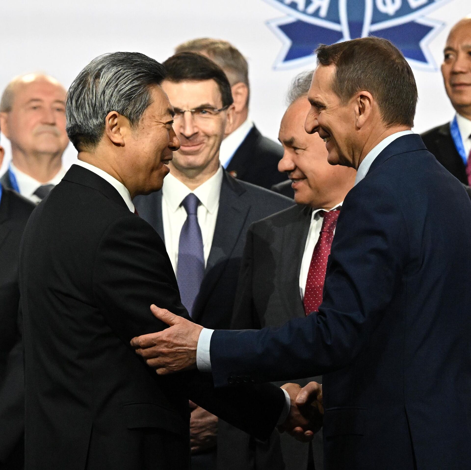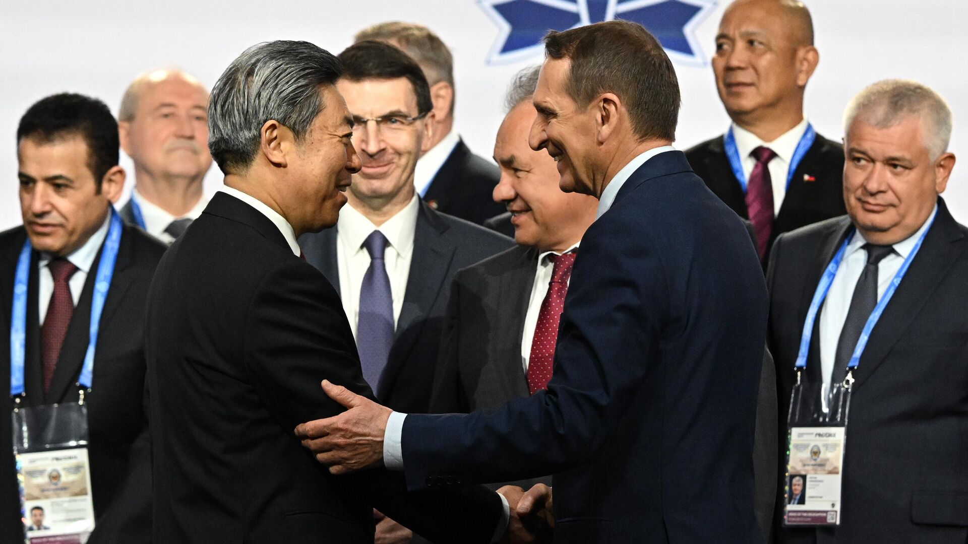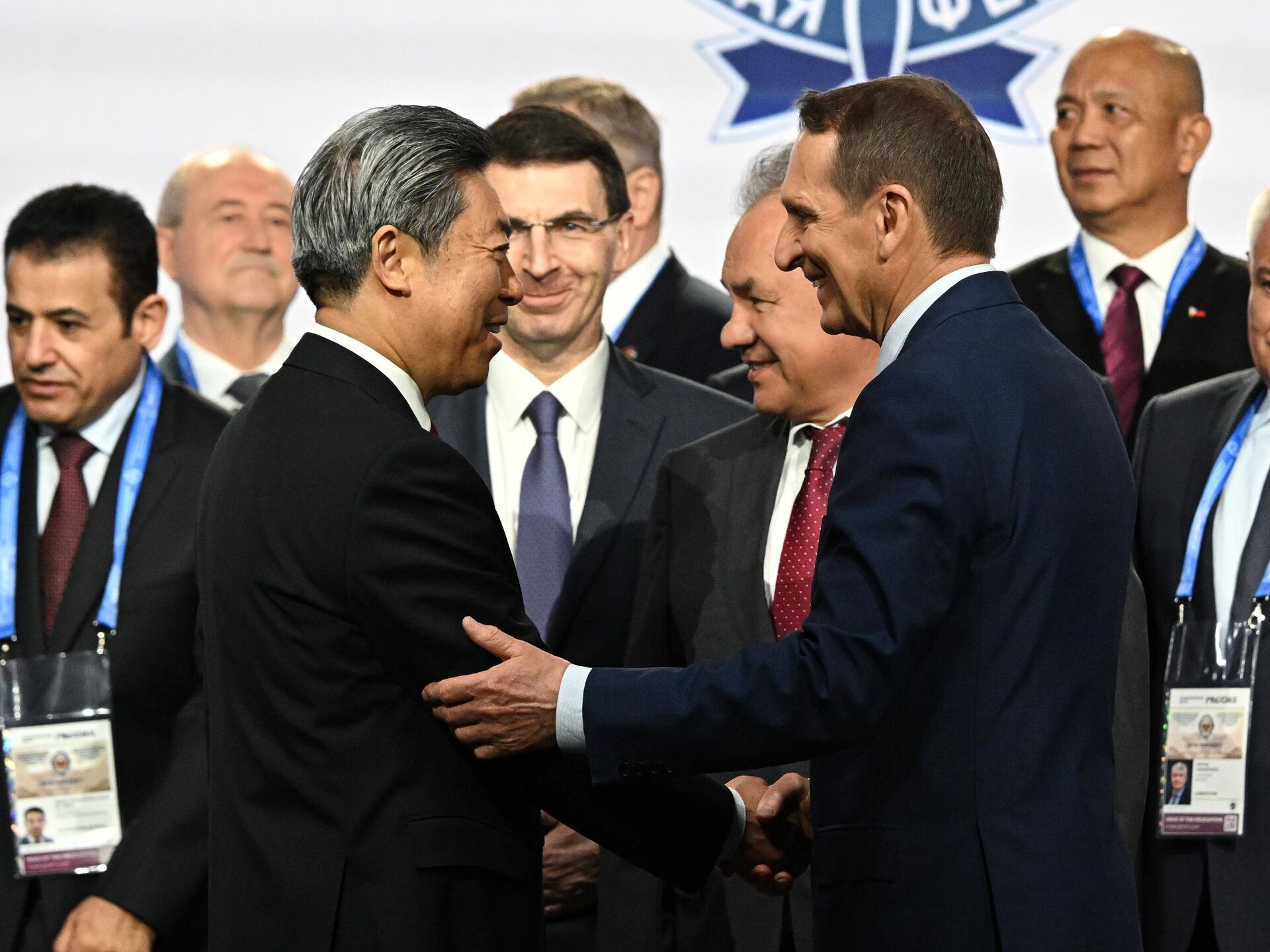 تشين وينتشينغ، عضو المكتب السياسي للجنة المركزية للحزب الشيوعي الصيني، أمين لجنة الشؤون السياسية والقانونية للجنة المركزية للحزب الشيوعي الصيني، وسيرغي ناريشكين، مدير جهاز الاستخبارات الخارجية الروسية، خلال التقاط صورة جماعية لرؤساء الوفود