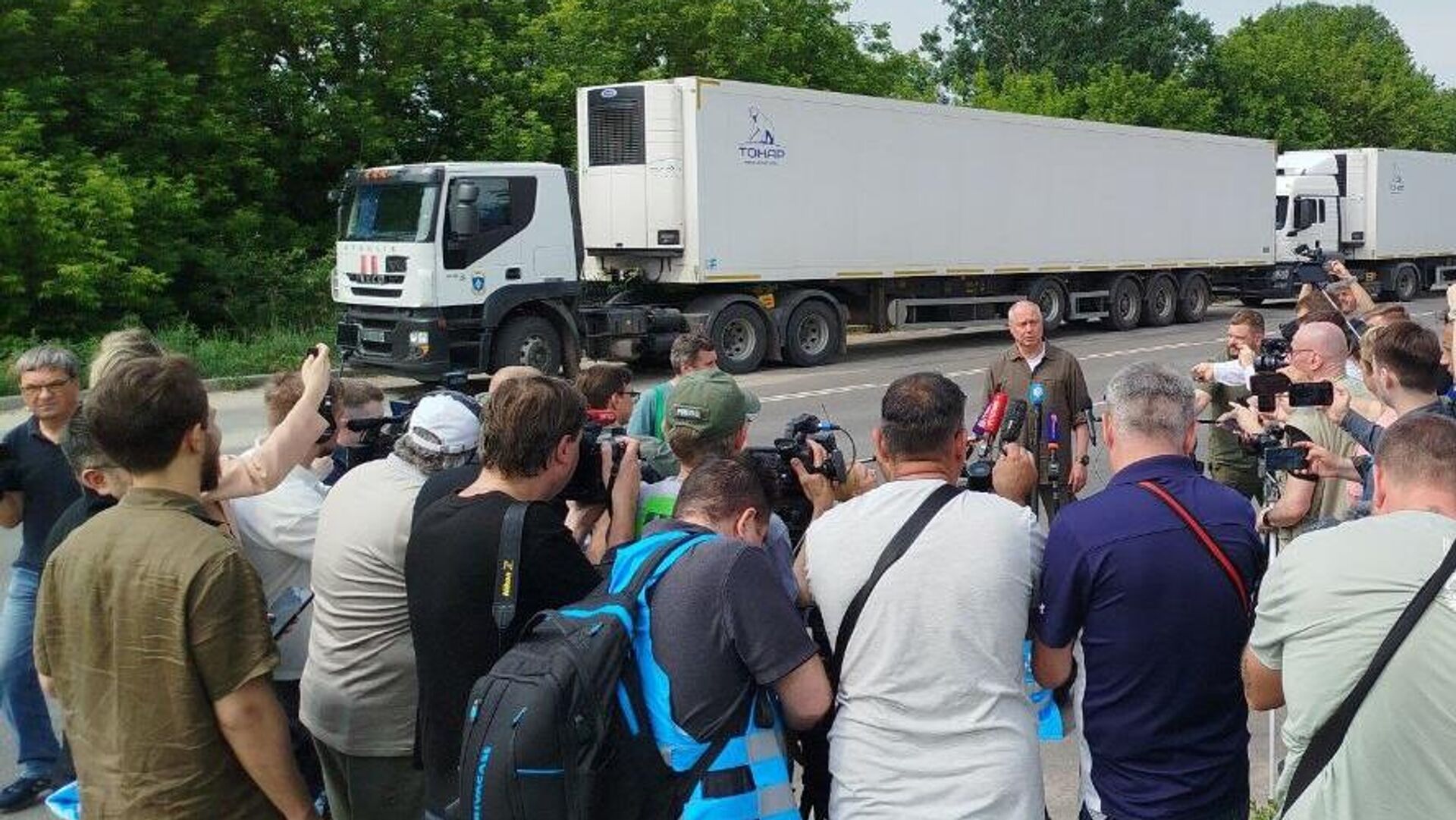 صحفيون لوسائل إعلام أجنبية أمام الشاحنات التي تحمل جثث الجنود الأوكرانيين التي رفض نظام كييف تسلمها - سبوتنيك عربي, 1920, 08.06.2025