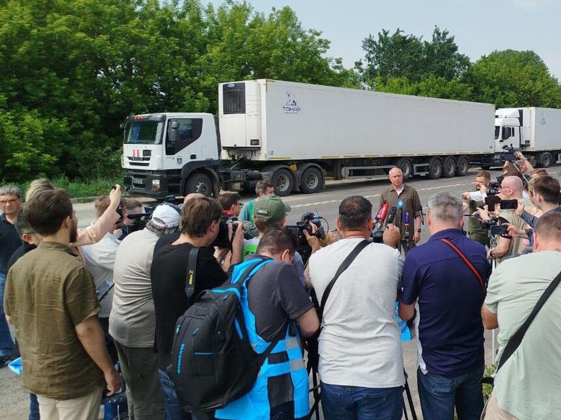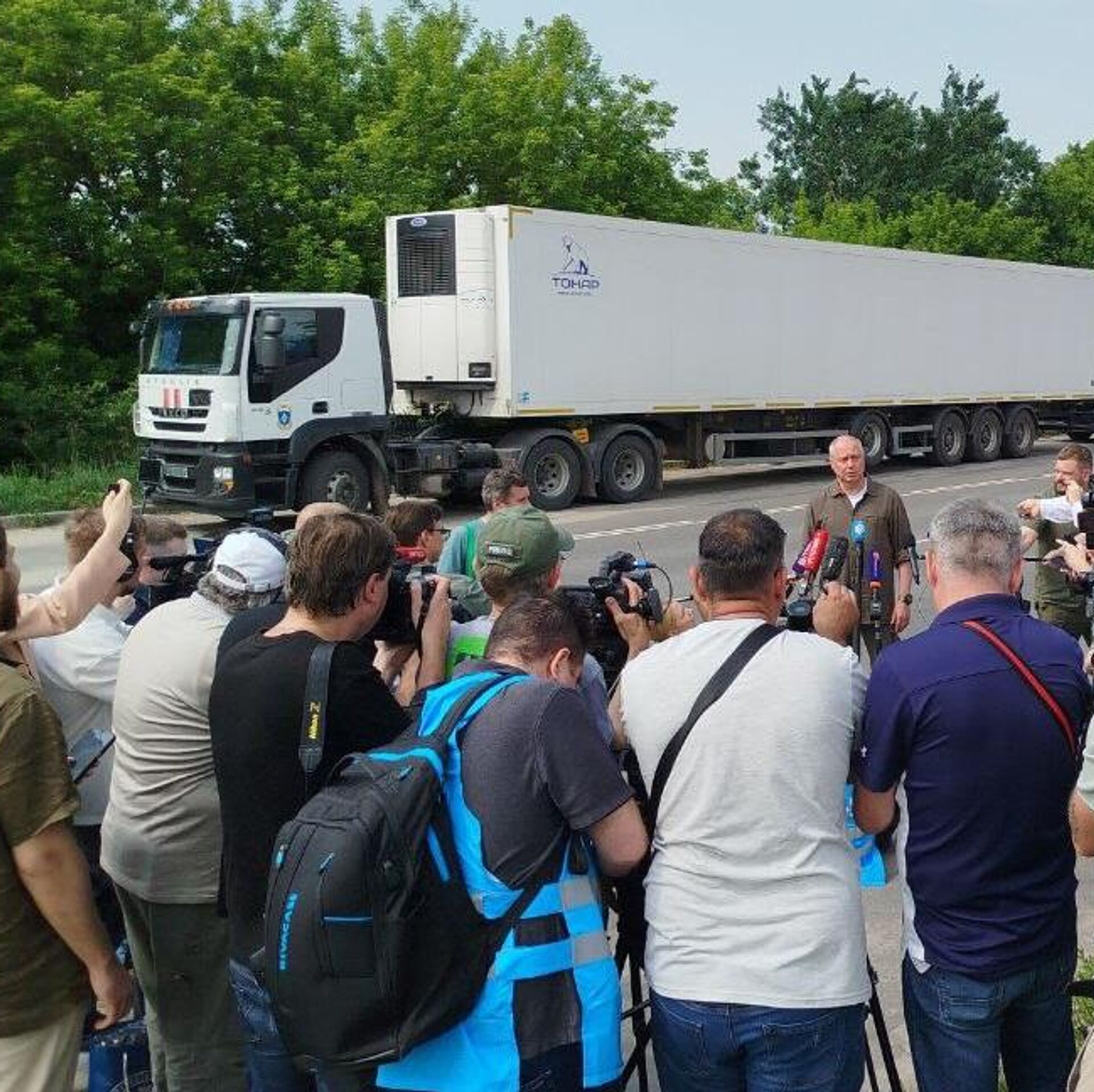 صحفيون أجانب يتفقدون شاحنات التبريد التي تحمل جثث الجنود الأوكرانيين في مقاطعة بريانسك