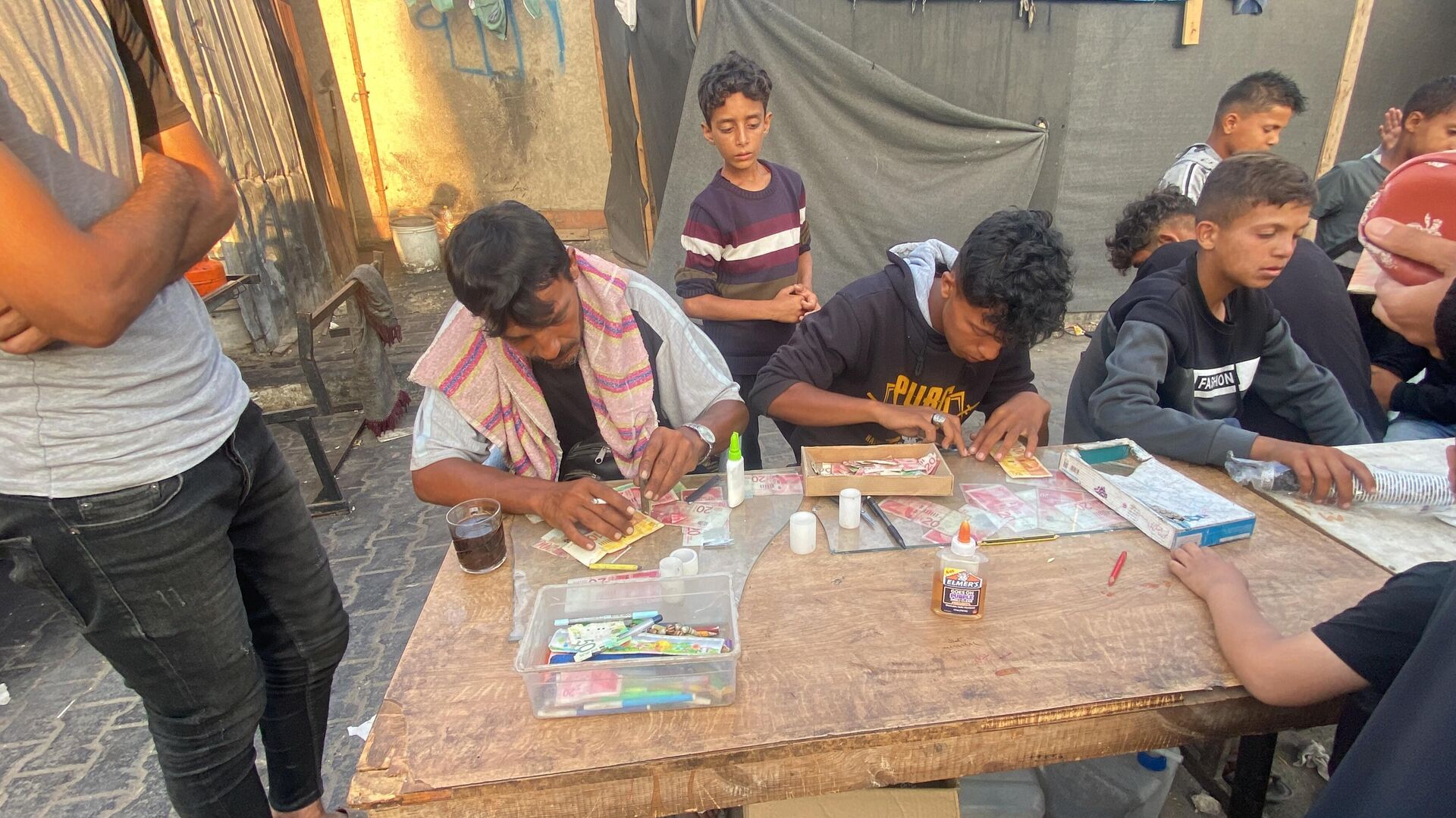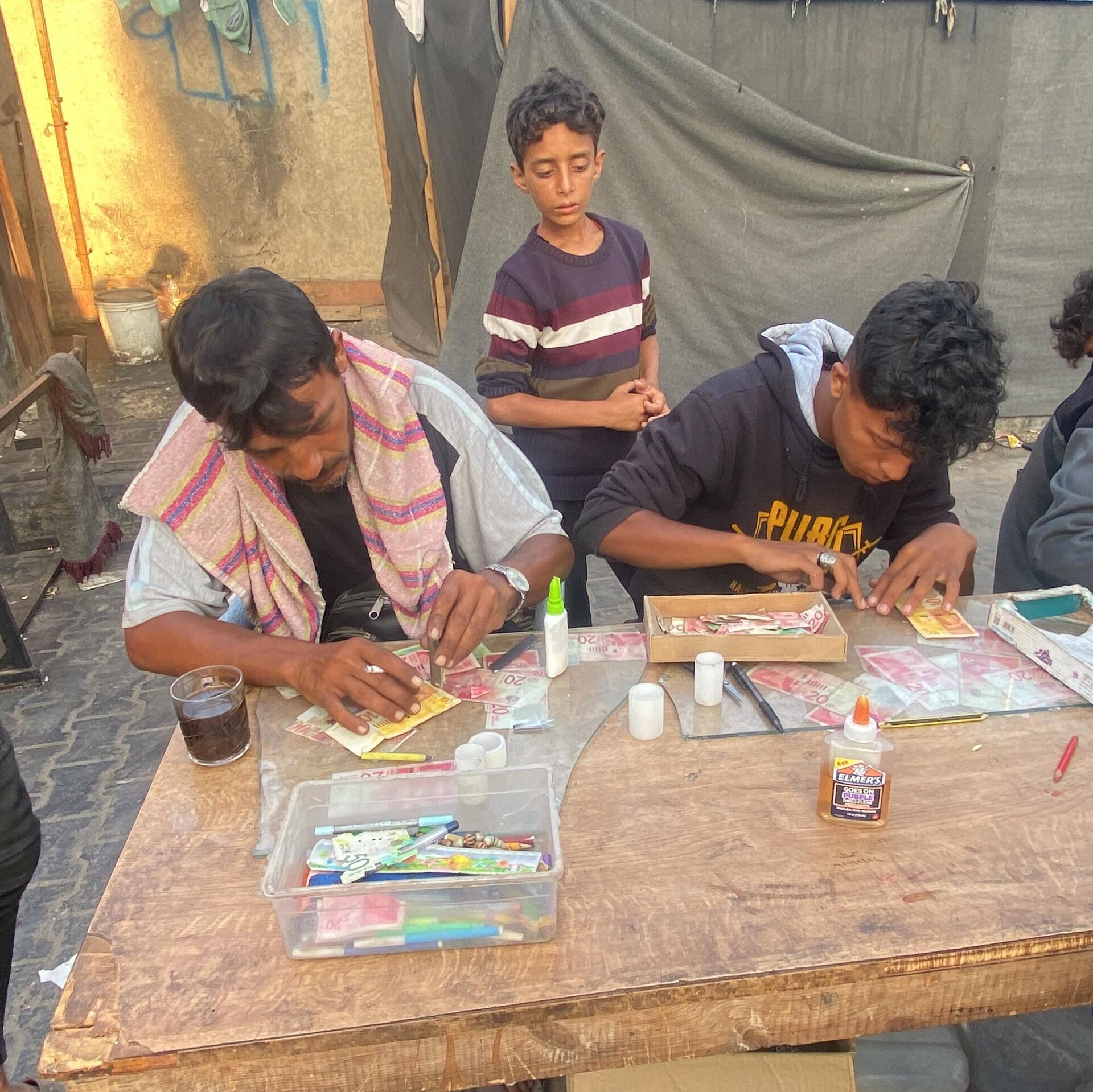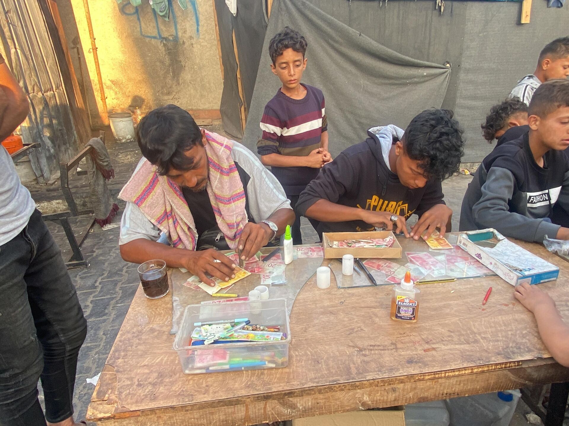 وفي سوق خان يونس جنوبي قطاع غزة، يجلس النازح سمير أبو لطيفة على بسطة صغيرة، لترميم الأوراق النقدية الممزقة، في محاولة لإبقائها قيد التداول بين المواطنين، مقابل رسوم رمزية.