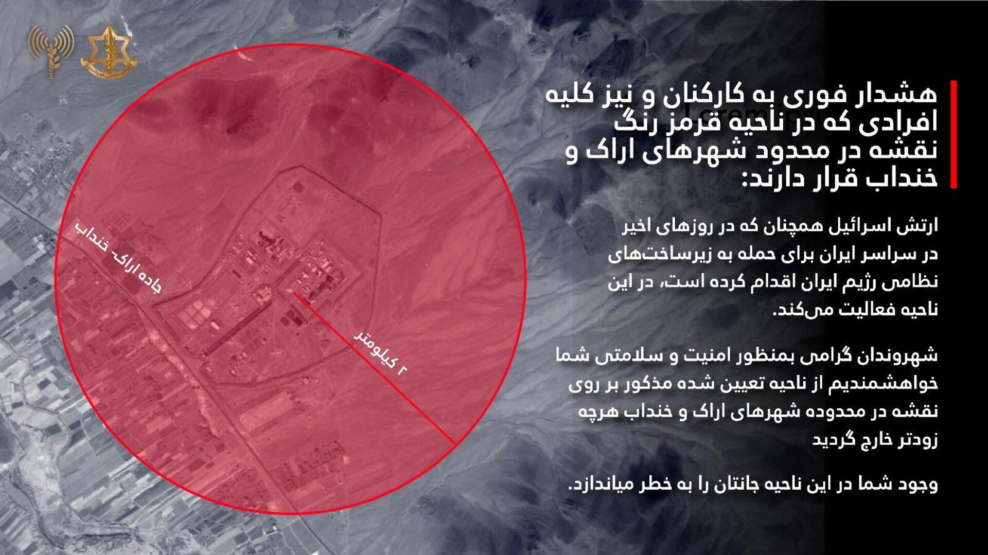 #عاجل ‼️انذار عاجل يوجّهه جيش الدفاع إلى السكان والعاملين والمتواجدين في منطقة القريتيْن الايرانيتيْن أراك-خونداب في المناطق المحددة بالخارطة بضرورة الاخلاء فورًا قبل قيام جيش الدفاع باستهداف بنى تحتية عسكرية تابعة للنظام الإيراني.