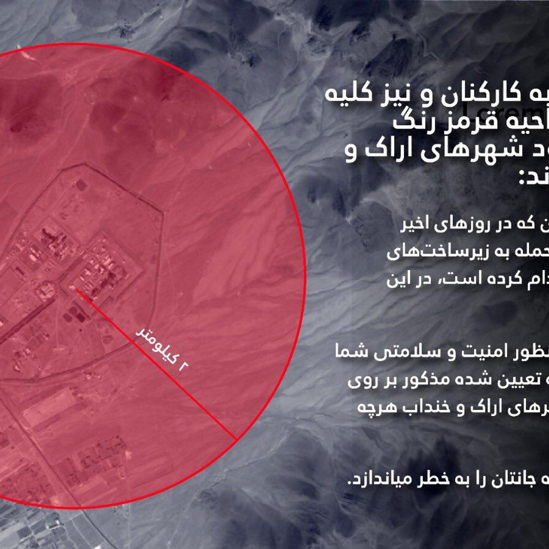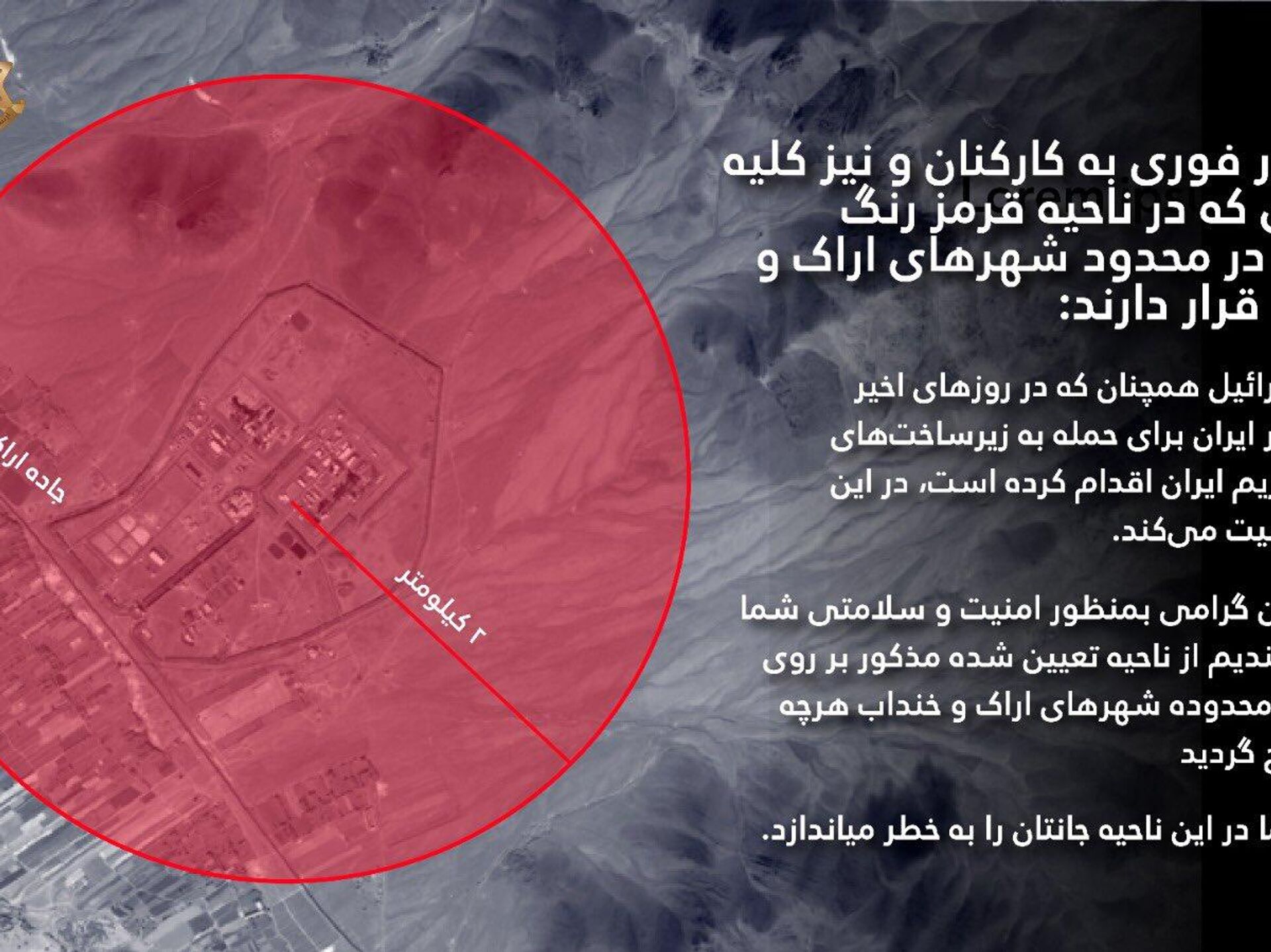 أطلق الجيش الإسرائيلي، اليوم الخميس، تحذيرا لسكان المنطقة المحيطة بمفاعل "آراك"، للماء الثقيل في إيران، مطالبًا بضرورة إخلاء المنطقة.