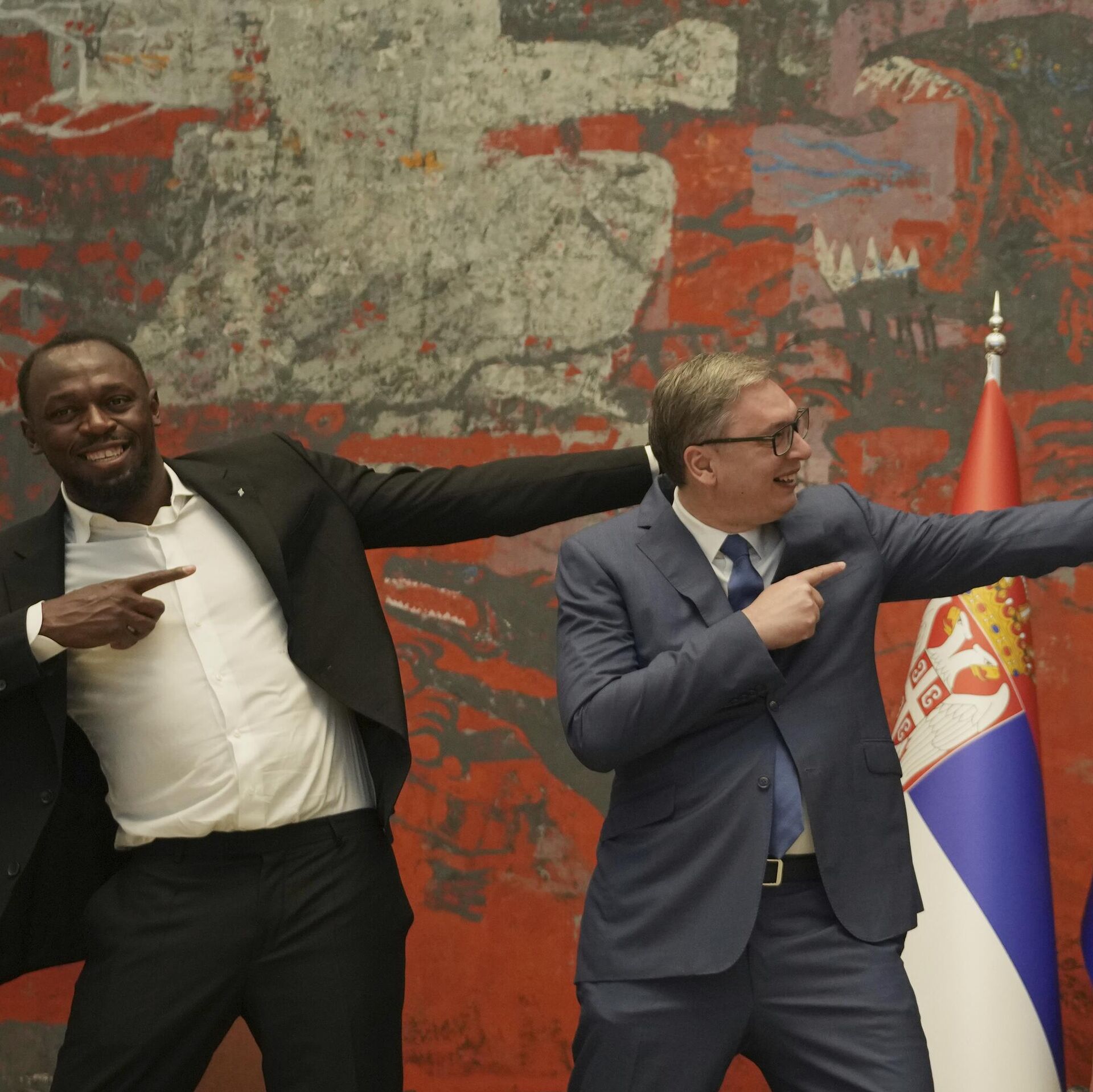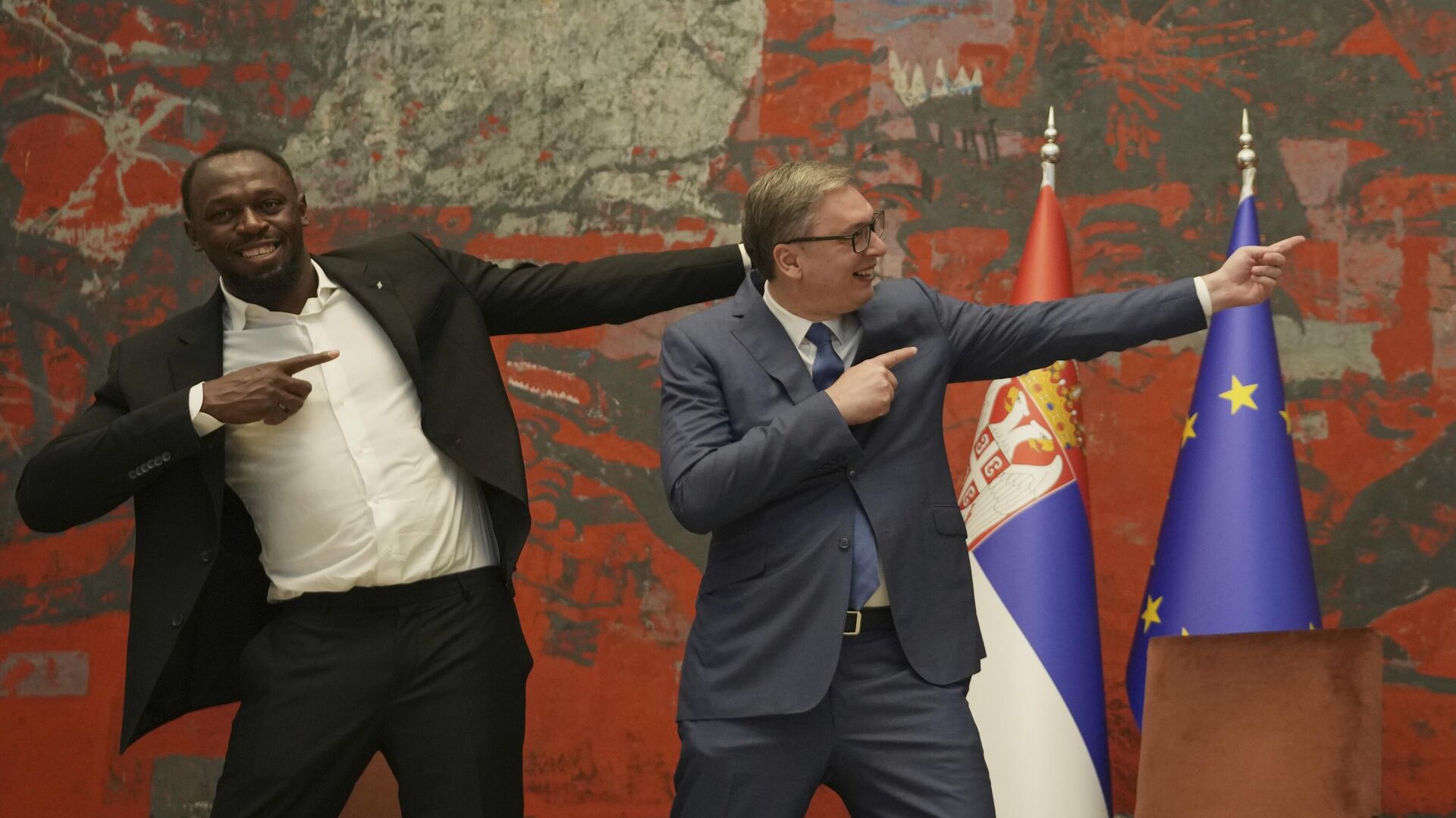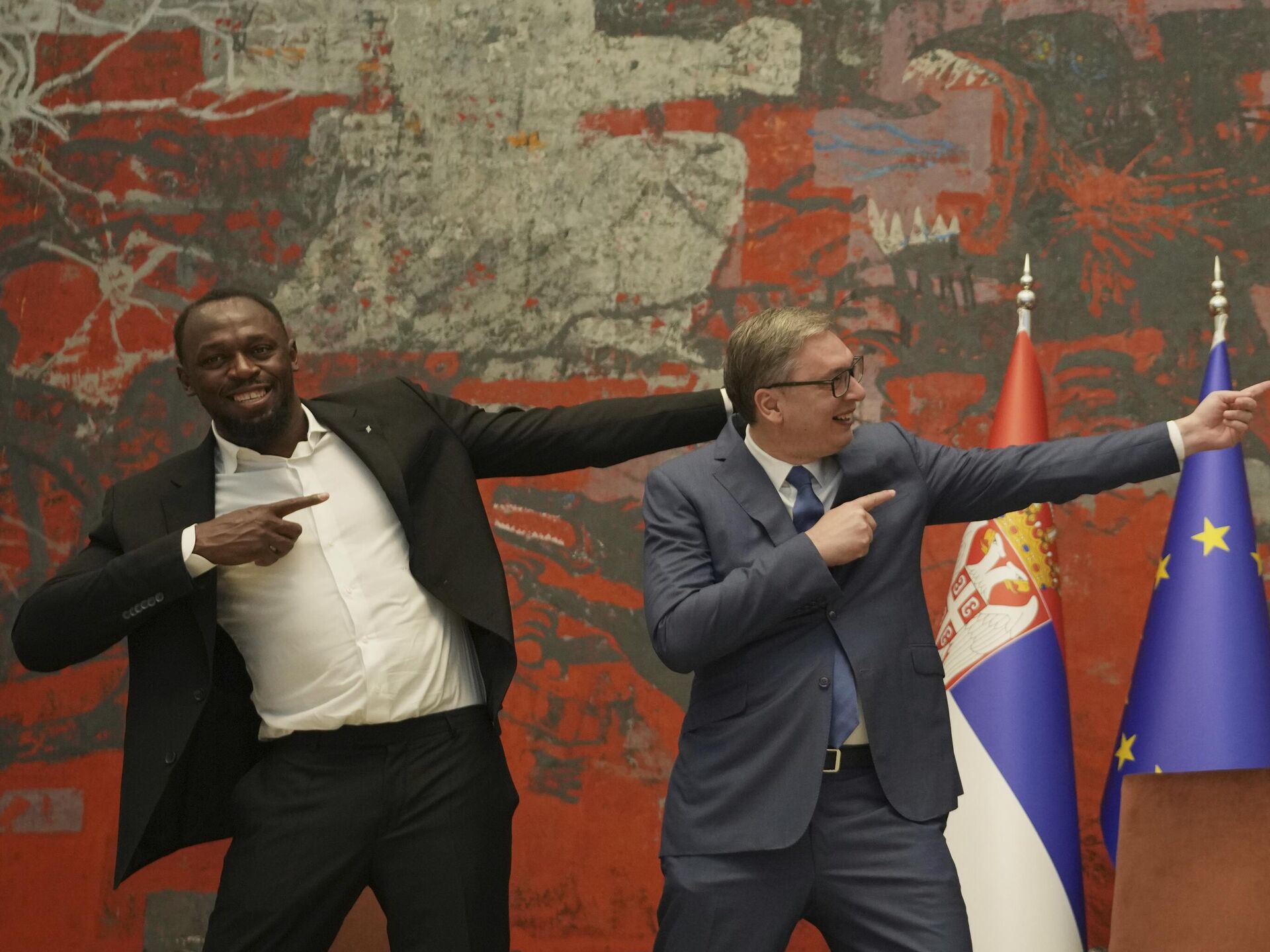 العداء الجامايكي السابق وسفير معرض إكسبو 2027، يوسين بولت، على اليسار، يقف مع الرئيس الصربي ألكسندر فوتشيتش في قصر صربيا في بلغراد، صربيا، الثلاثاء 17 يونيو 2025.