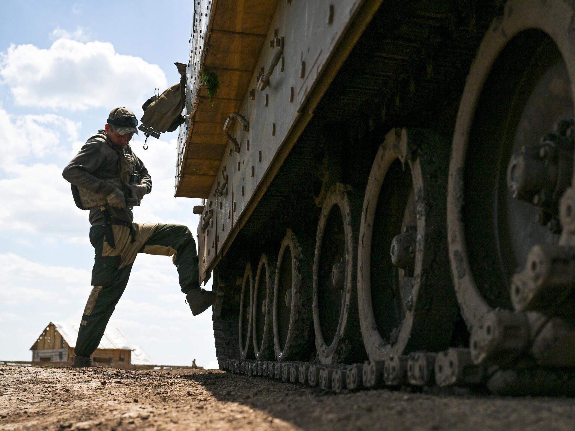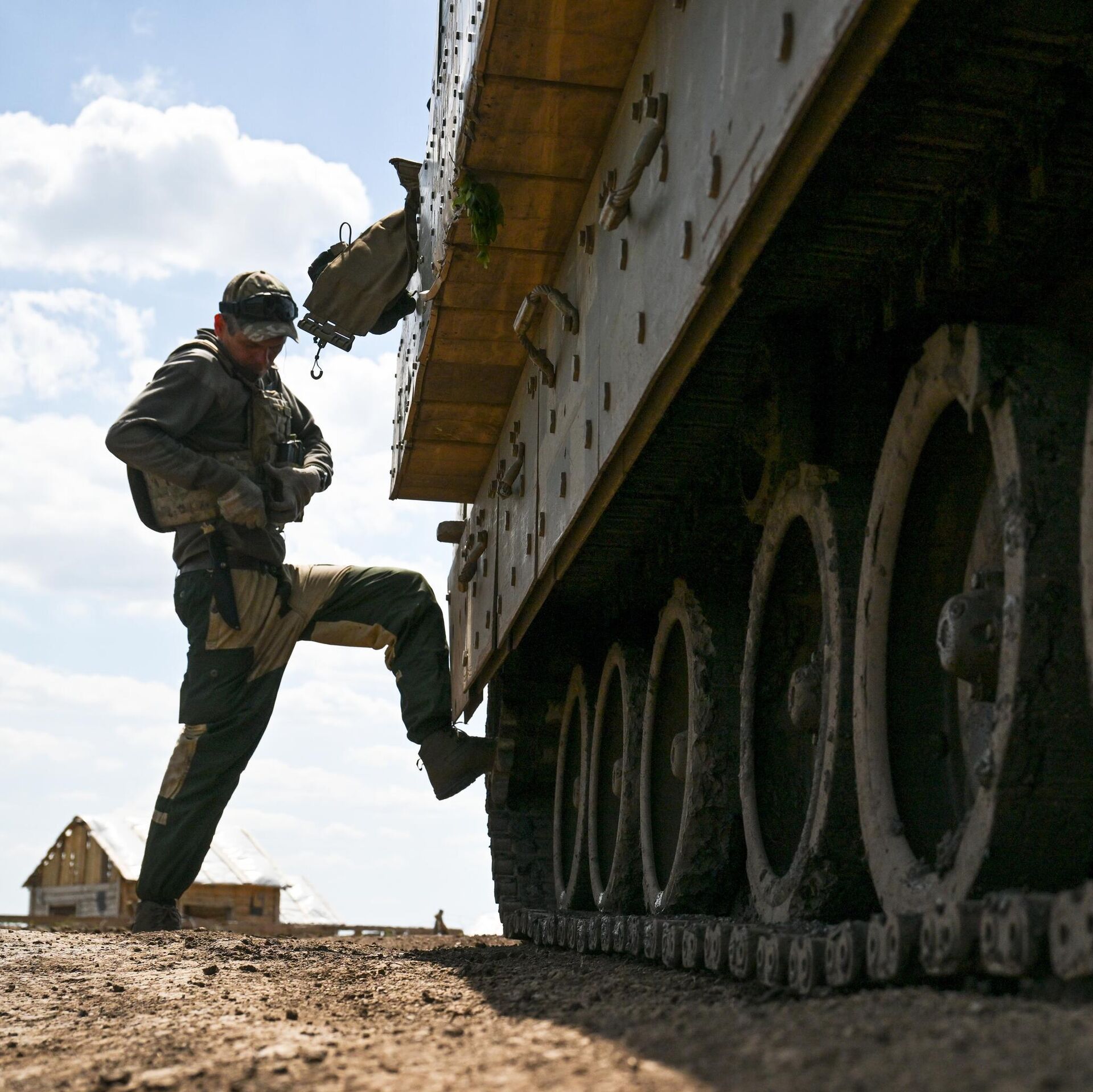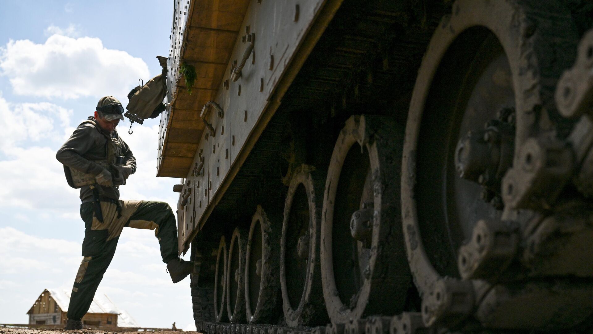 عناصر من القوات المسلحة الروسية يقومون باختبارات تشغيلية لمدرعة "برادلي" الأمريكية التي تم السيطرة عليها في منطقة العملية العسكرية الخاصة.