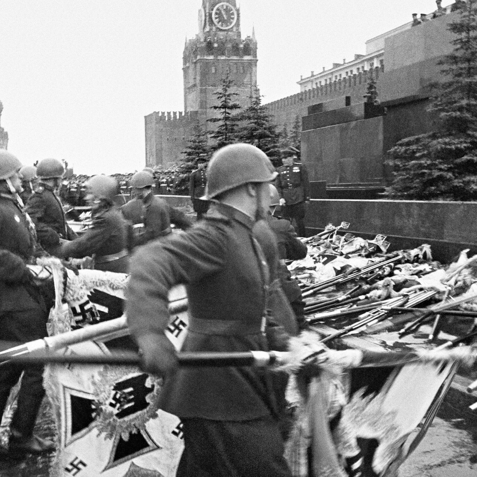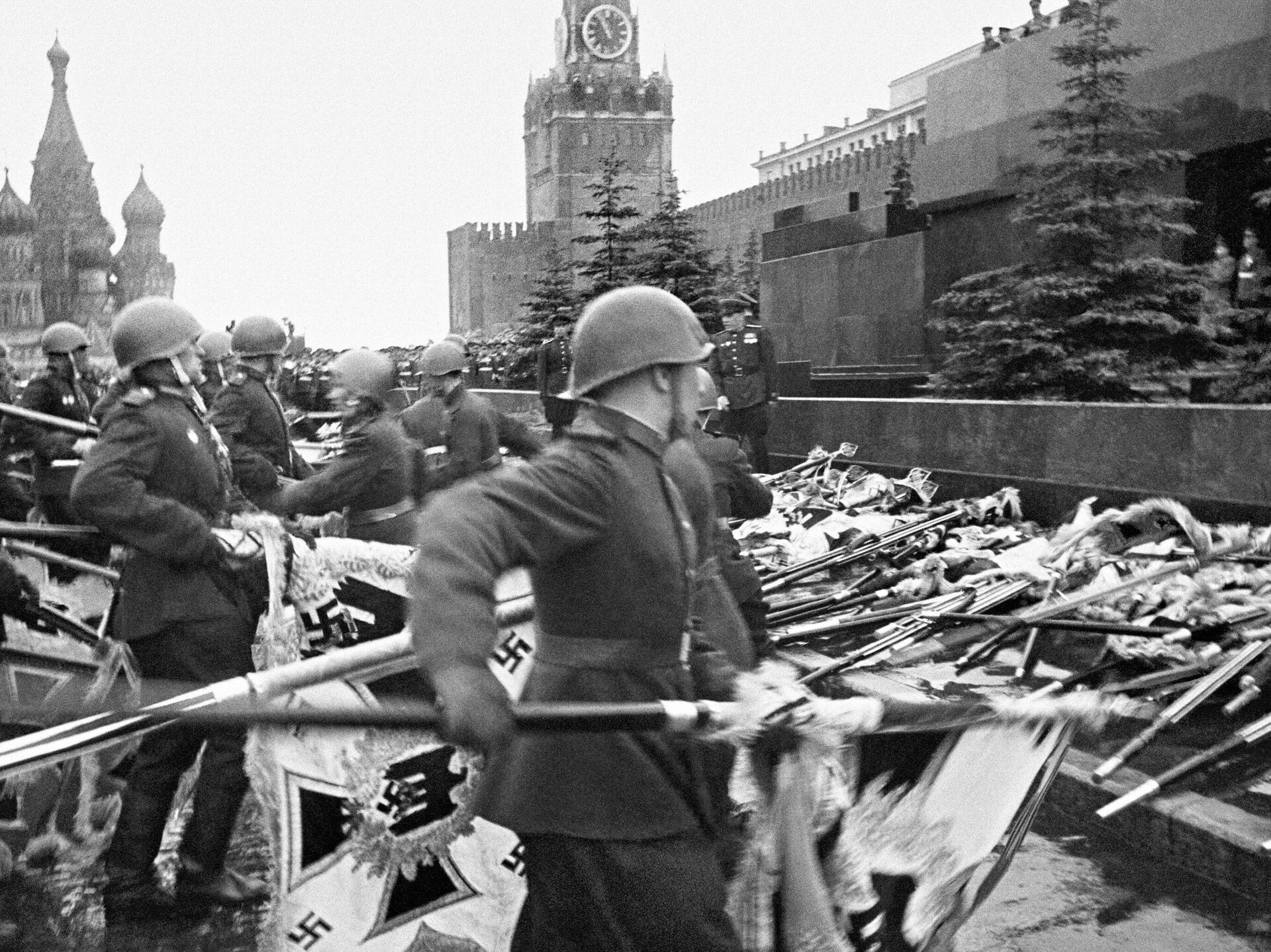 جنود سوفييت يرمون الرايات الفاشية أمام ضريح لينين.