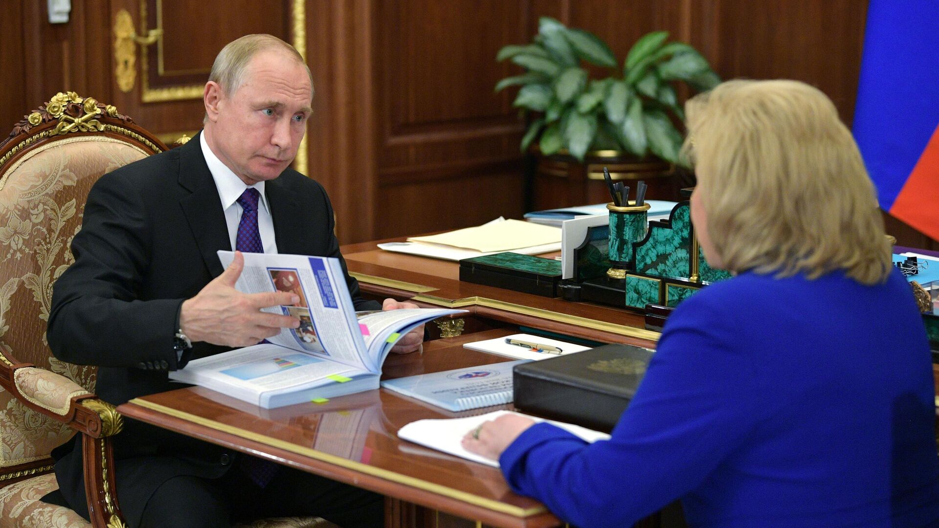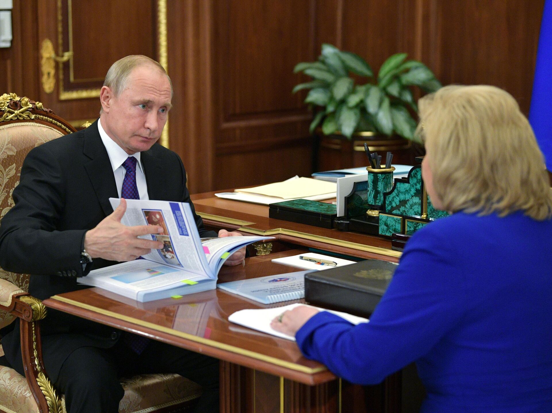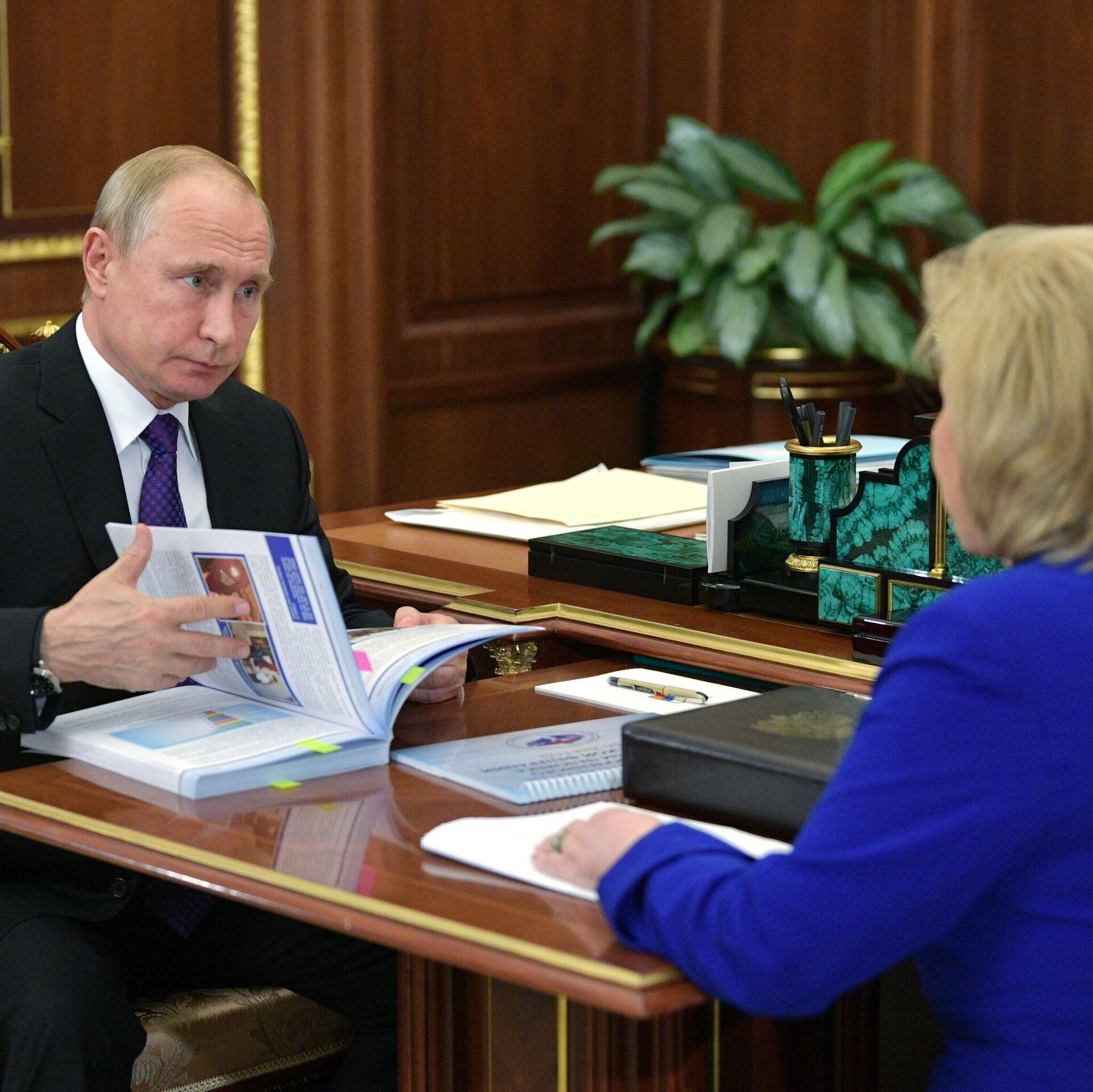 استلم الرئيس الروسي فلاديمير بوتين، يوم الثلاثاء، تقرير مفوضة حقوق الإنسان في روسيا، تاتيانا موسكالكوفا، في الكرملين.