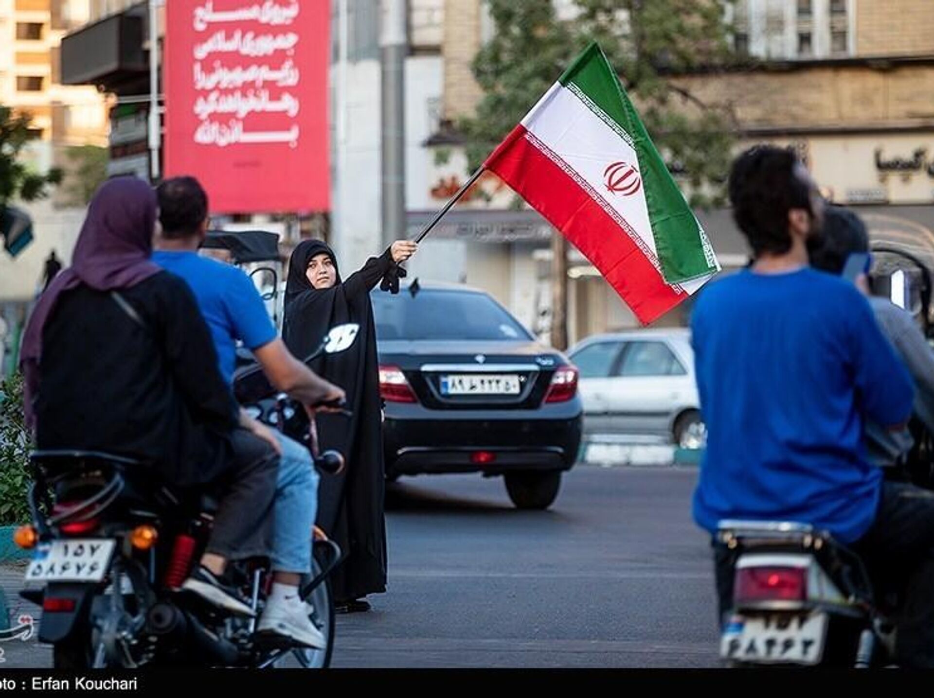 CC BY 4.0 / Tasnim News Agency/Erfan Kouchari / زندگی در تهران جاریست (cropped image)سيدة إيرانية تلوح بعلم إيران وسط الشارع في طهران