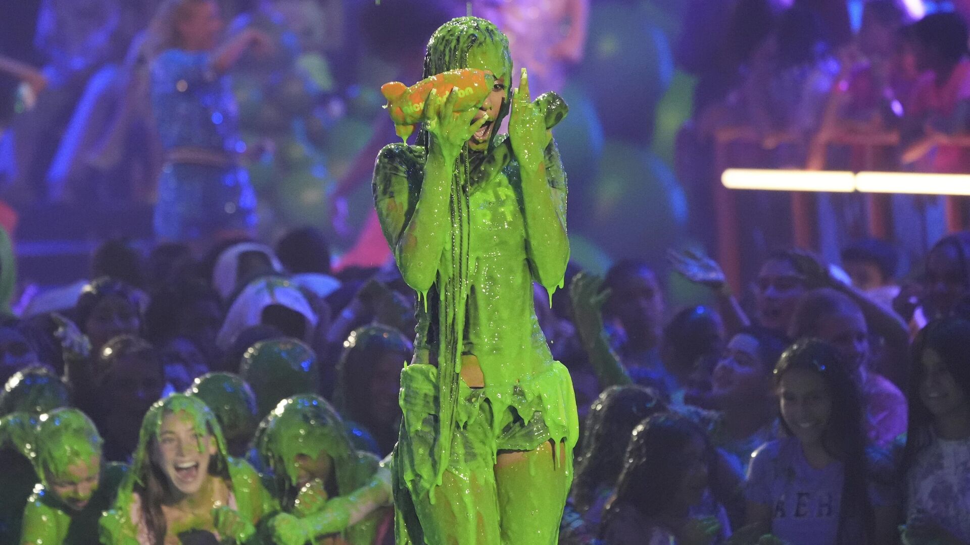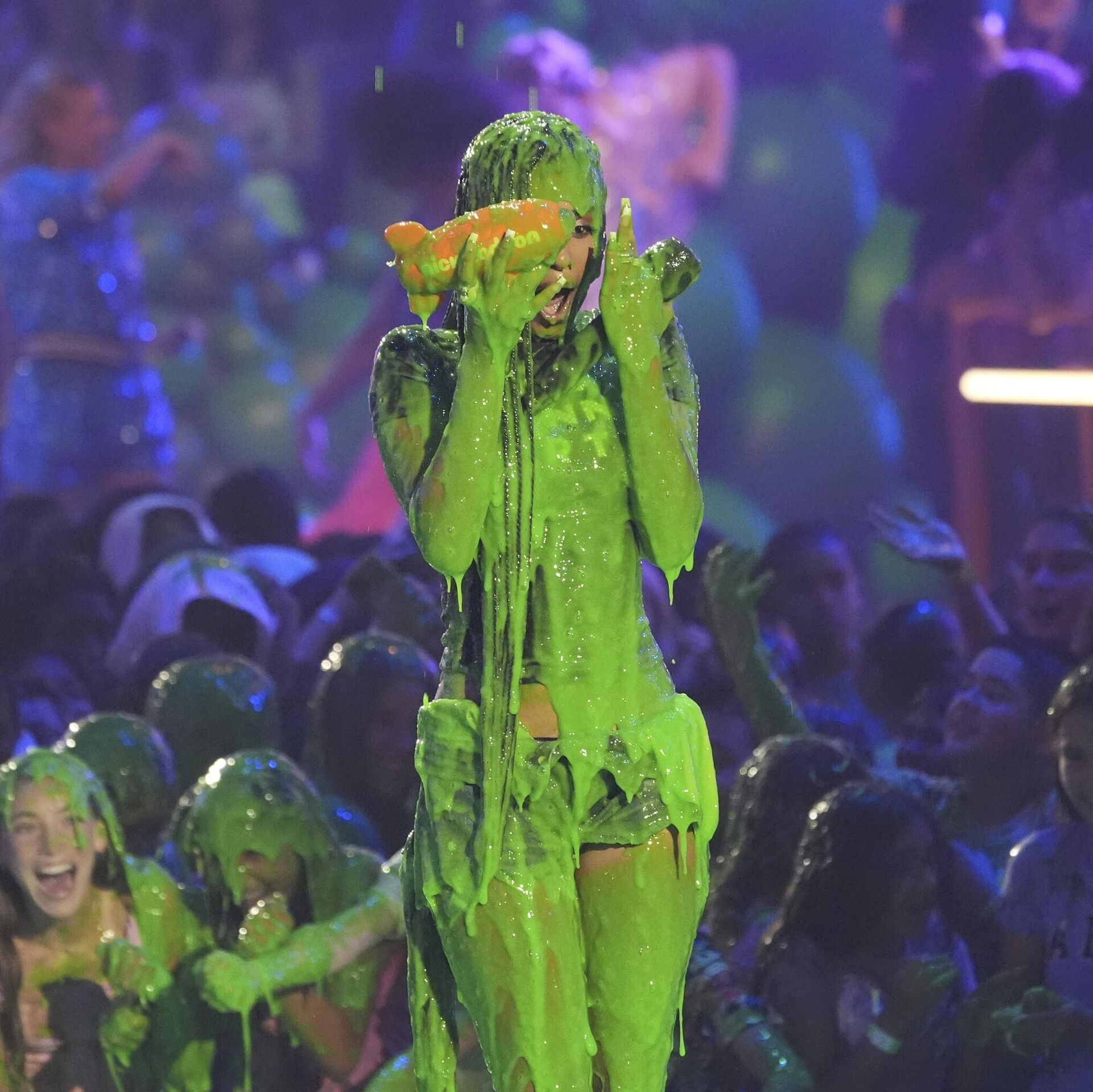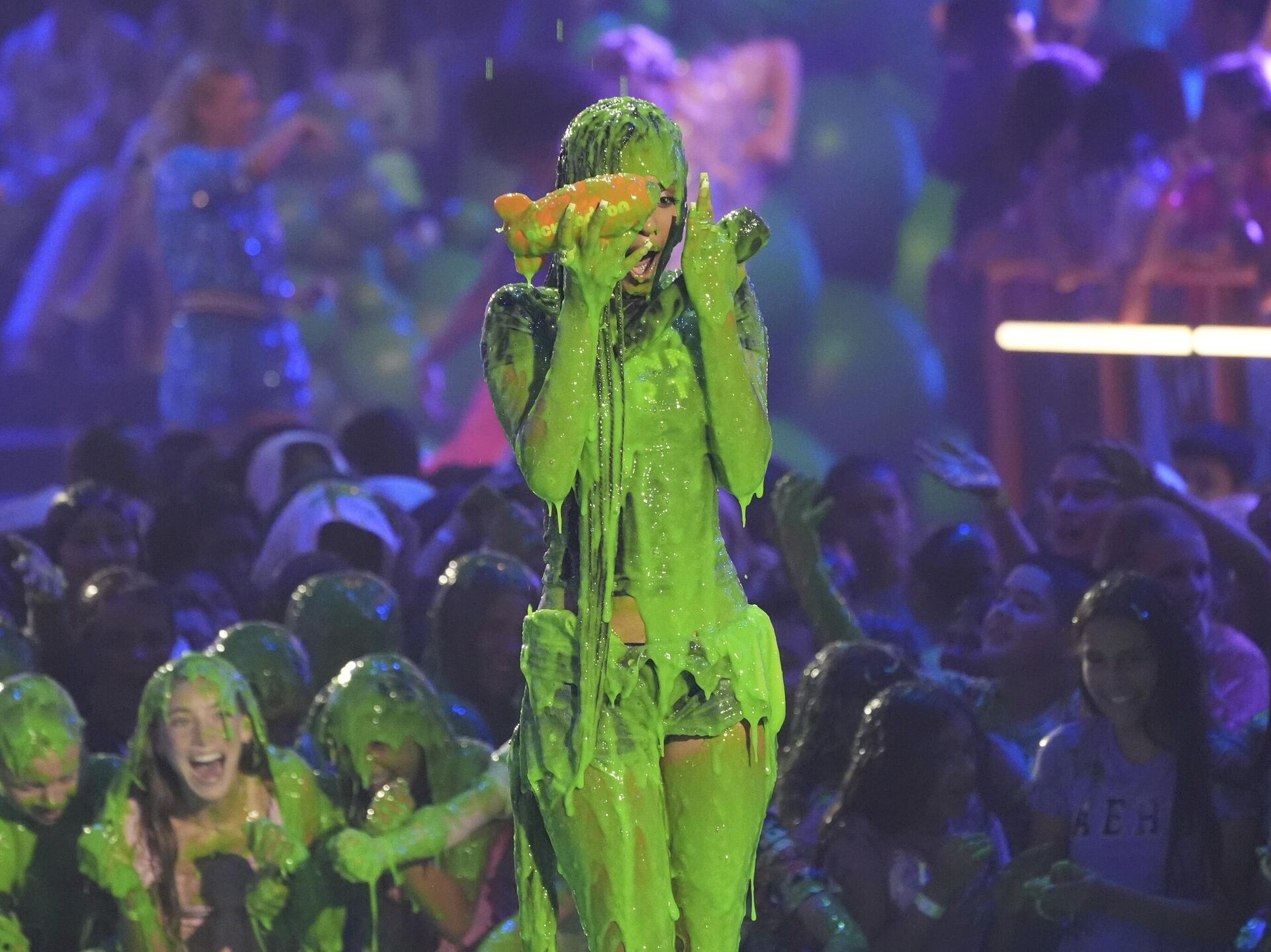 © AP Photo / Chris Pizzello مقدمة البرامج تايلا تتعرض للرش بمادة لزجة خلال حفل توزيع جوائز اختيار الأطفال من نيكلوديون في كاليفورنيا.
