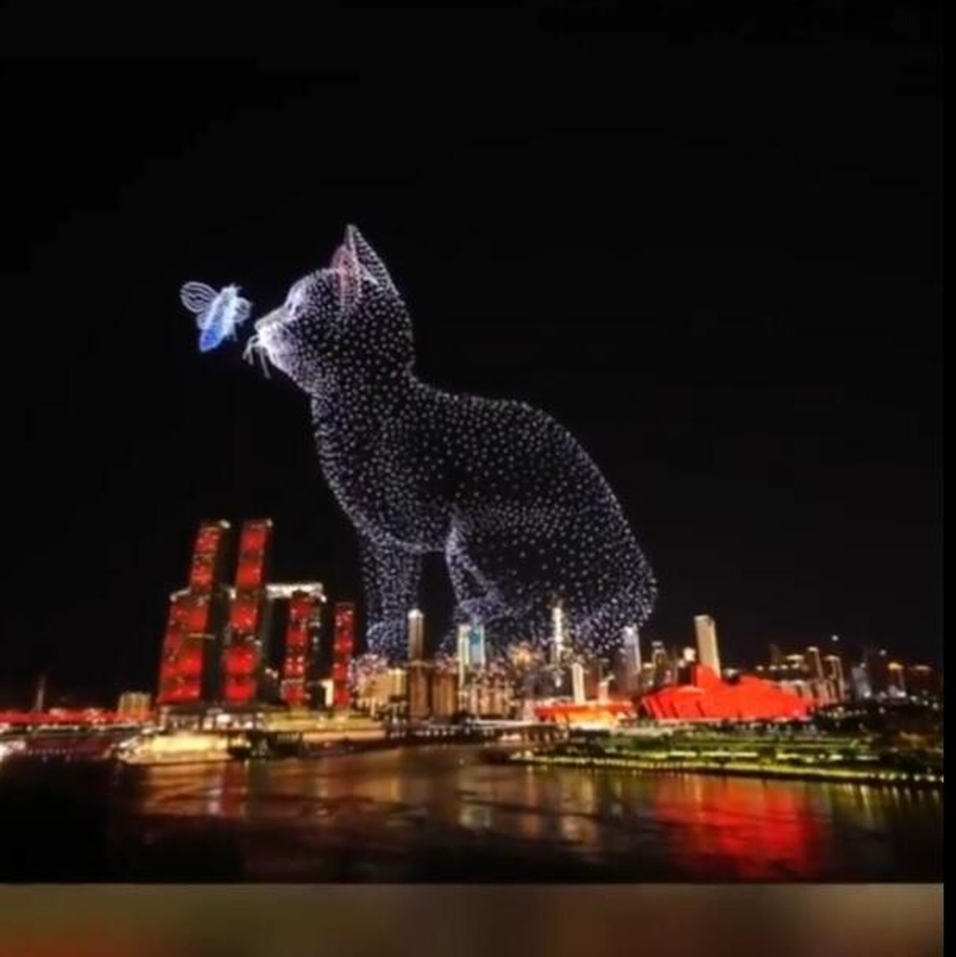 ويظهر في الفيديو كيف شكّلت الطائرات المسيرة مجسما ضخما على هيئة قطة، في مشهد إبداعي مزج بين التكنولوجيا المتطورة والفن البصري.