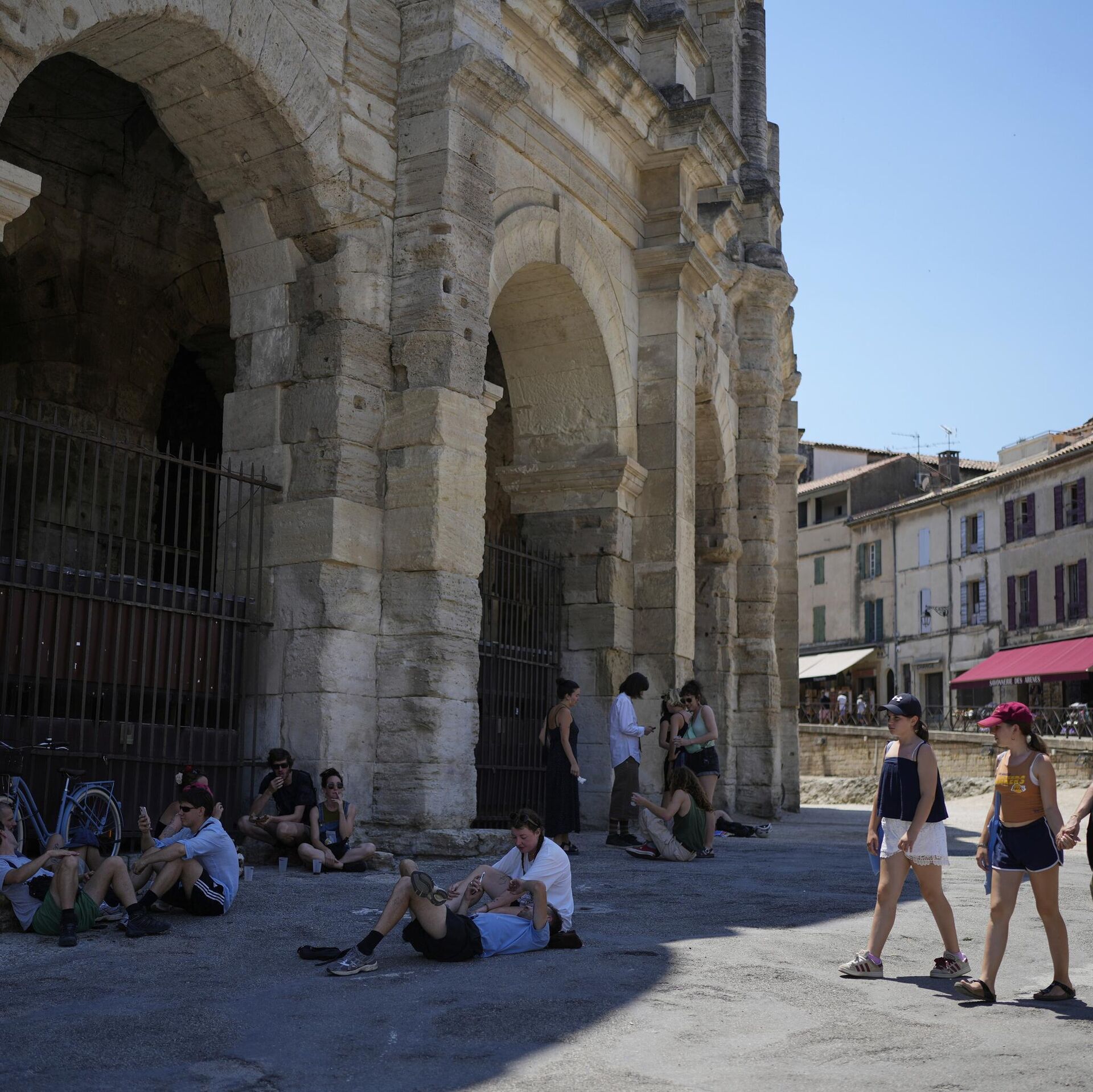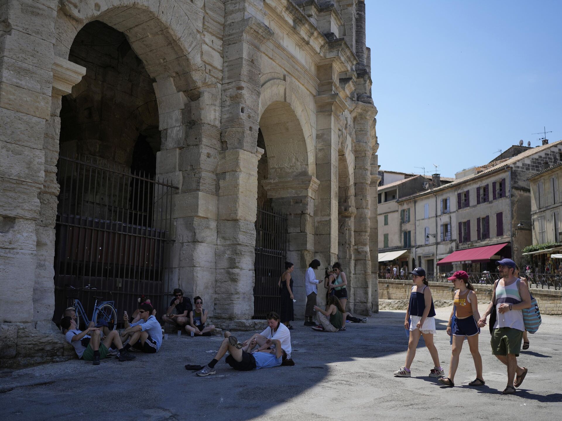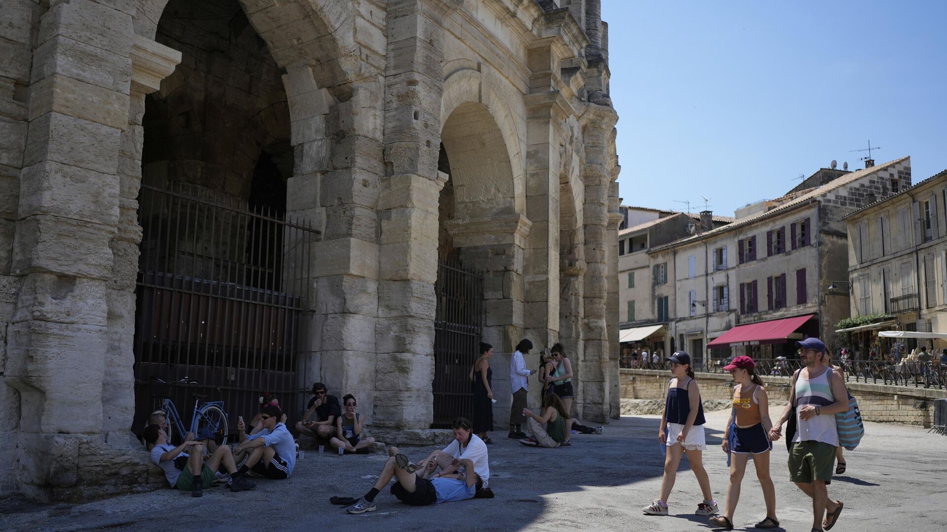 يجلس الناس في ظل الساحات الرومانية القديمة خلال موجة الحر في آرل، جنوبي فرنسا.