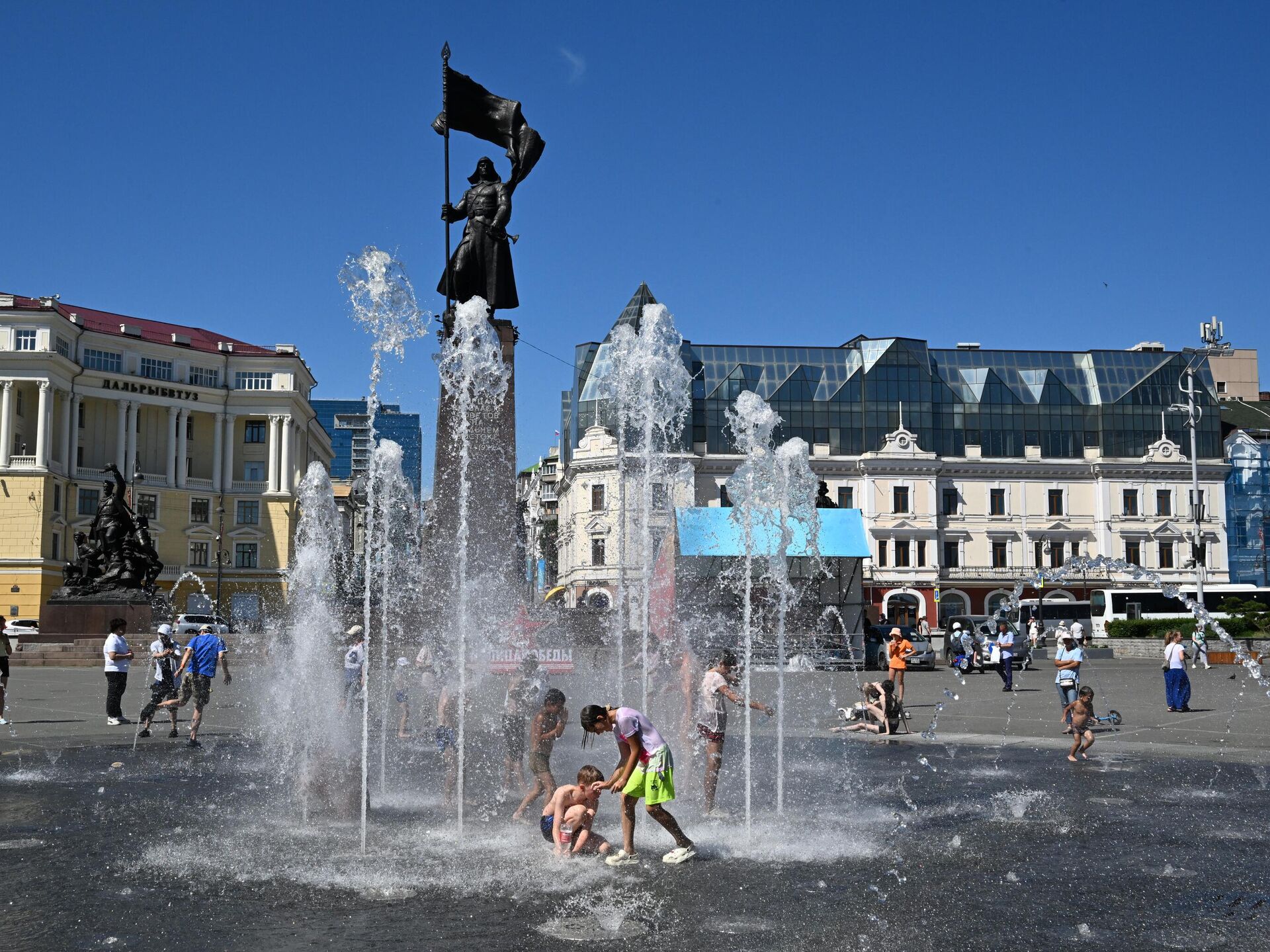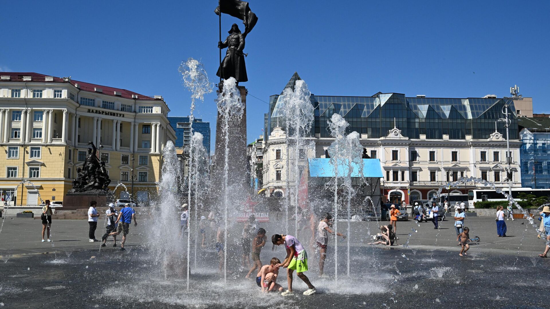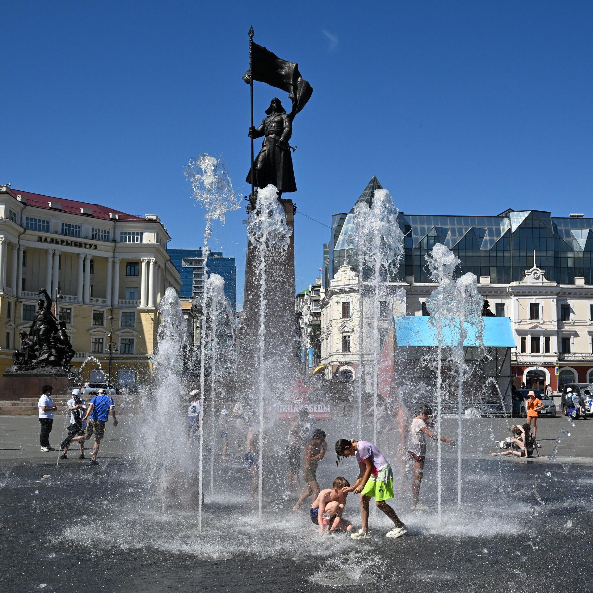 سكان مدينة فلاديفوستوك، يقصدون النافورة "الجافة" في الساحة المركزية للهرب من من ارتفاع درجات الحرارة.