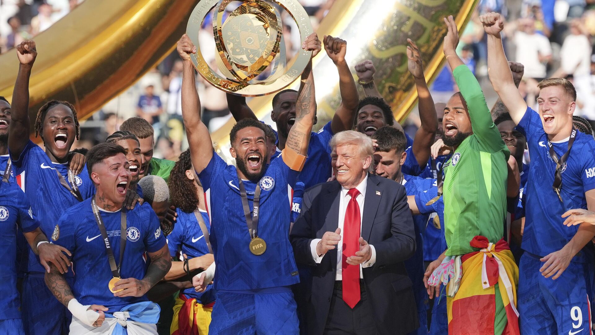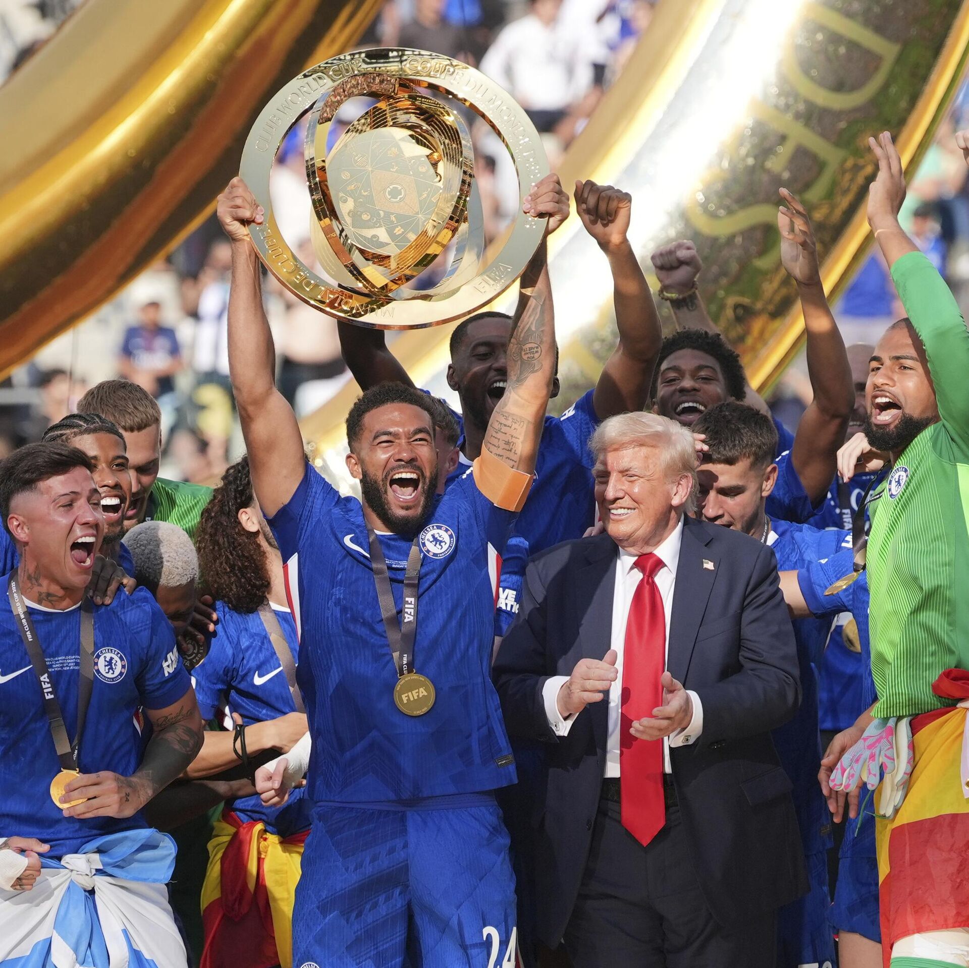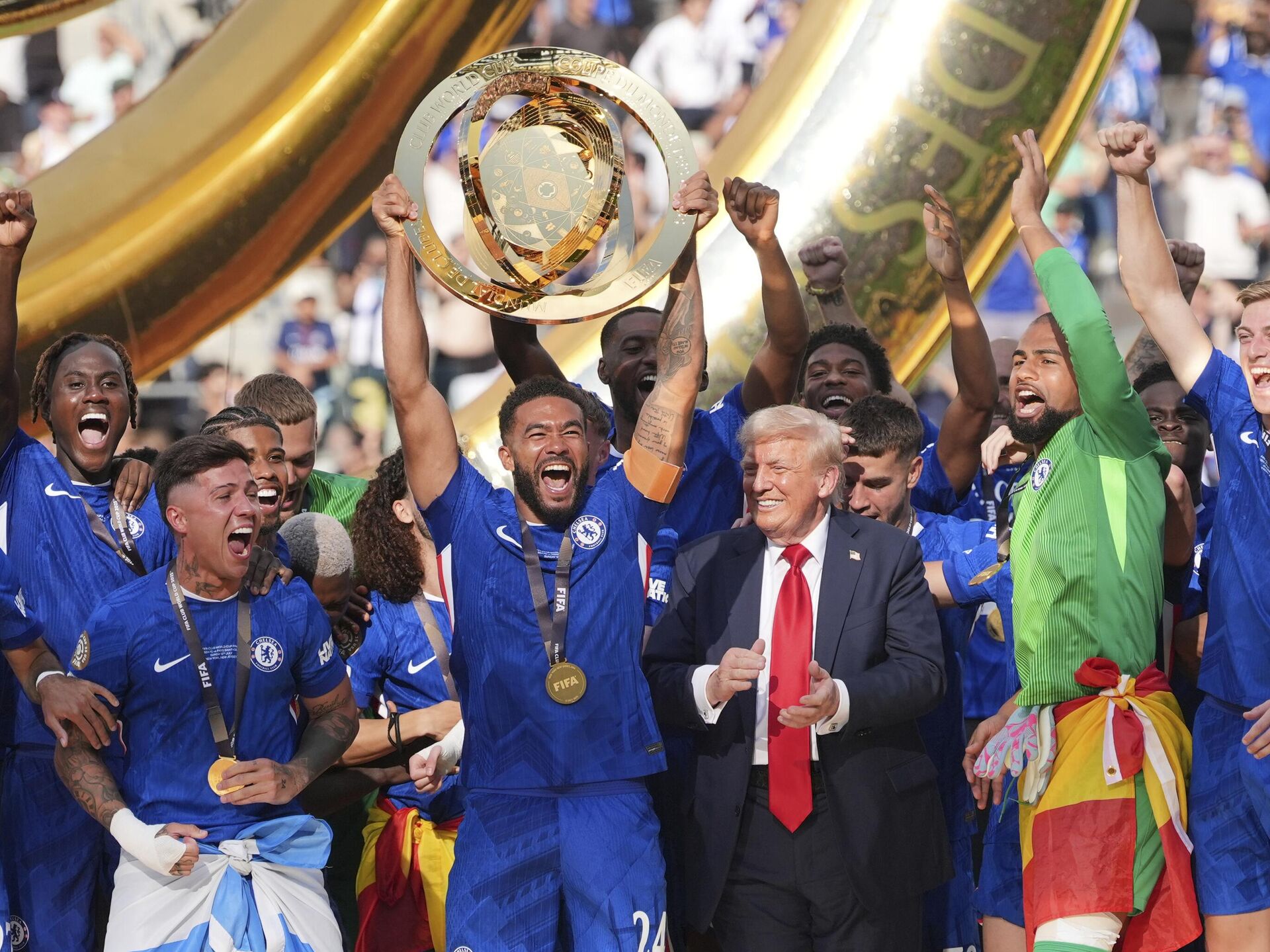 © AP Photo / Seth Wenigيرفع ريس جيمس (24) لاعب تشيلسي الكأس بينما يتابع الرئيس دونالد ترامب المباراة النهائية لكأس العالم للأندية لكرة القدم بين تشيلسي وباريس سان جيرمان في إيست روثرفورد، نيوجيرسي، الأحد 13 يوليو/تموز 2025