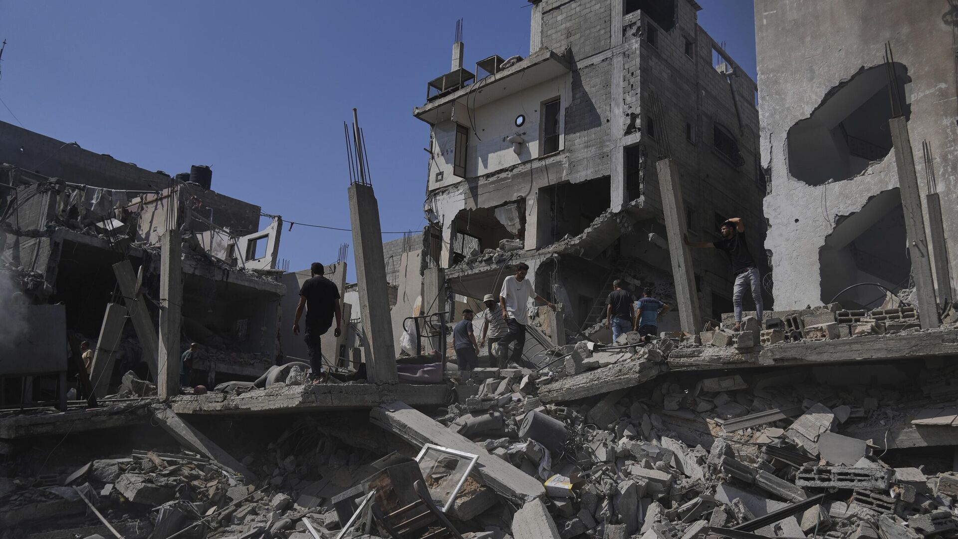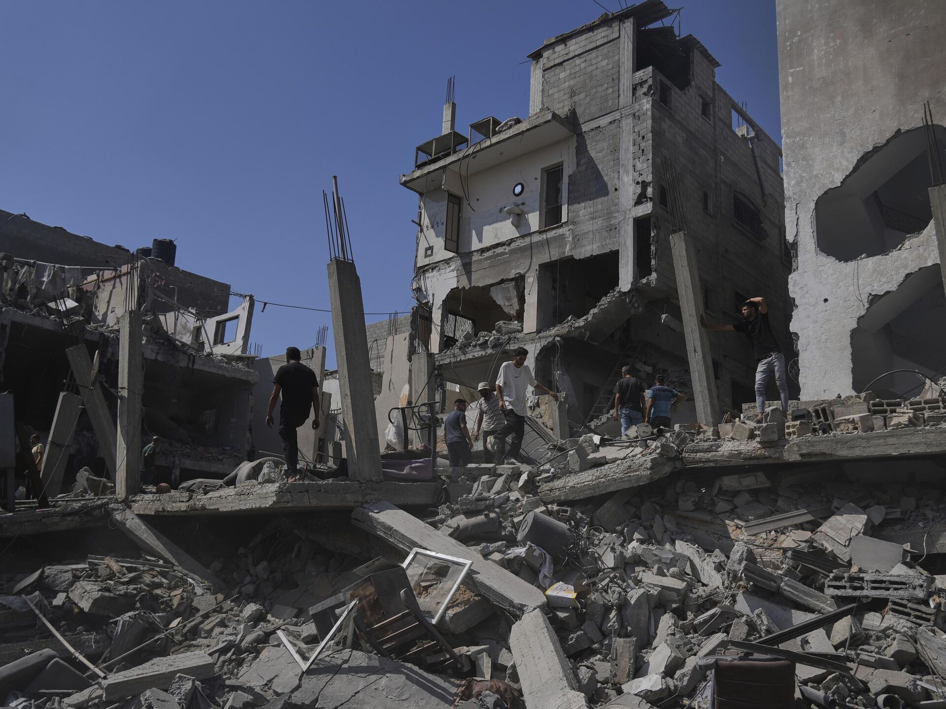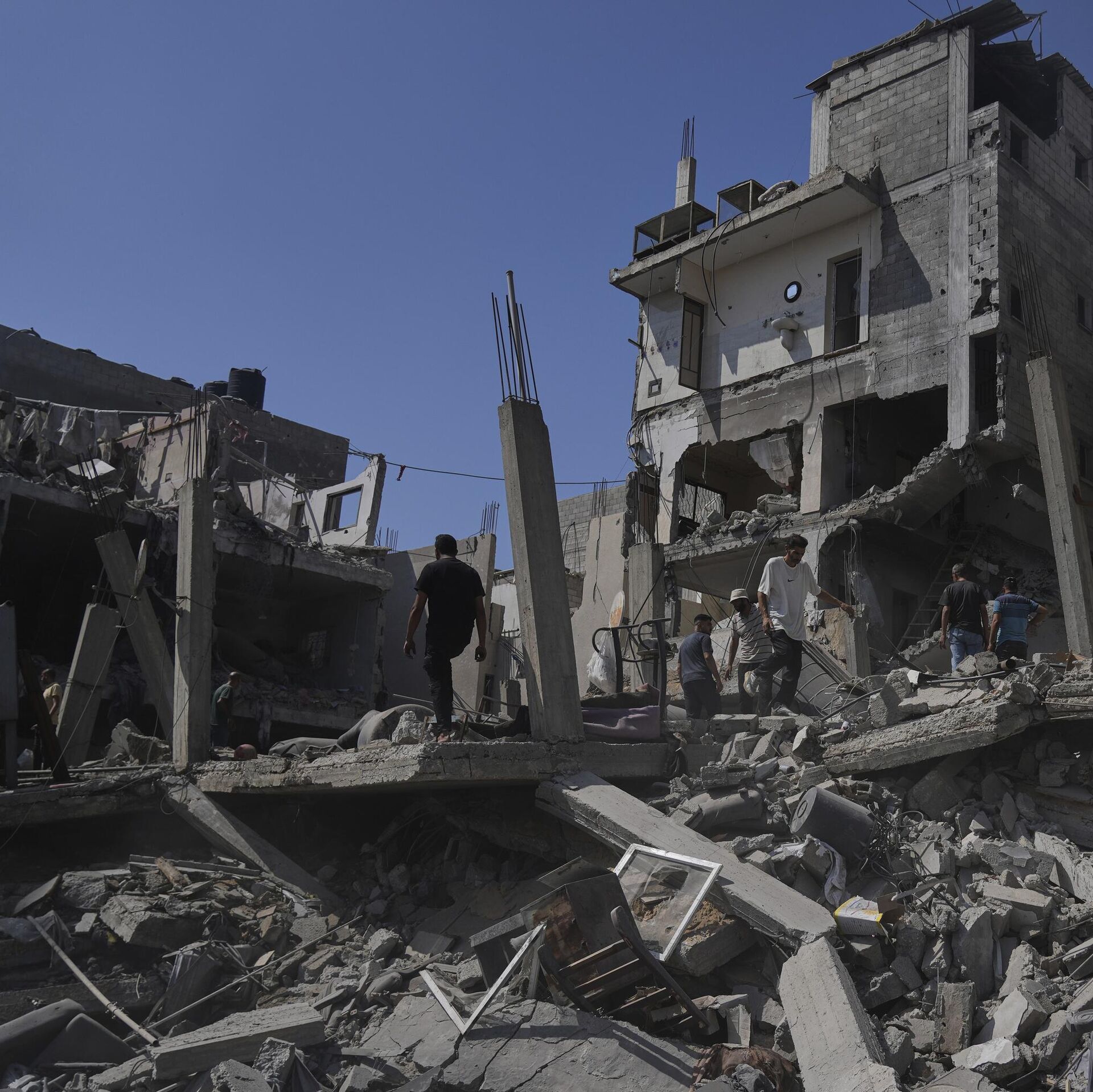 © AP Photo / Abdel Kareem Hanaفلسطينيون يتفقدون الأضرار التي لحقت بمنزل دمره القصف الإسرائيلي في دير البلح، وسط قطاع غزة