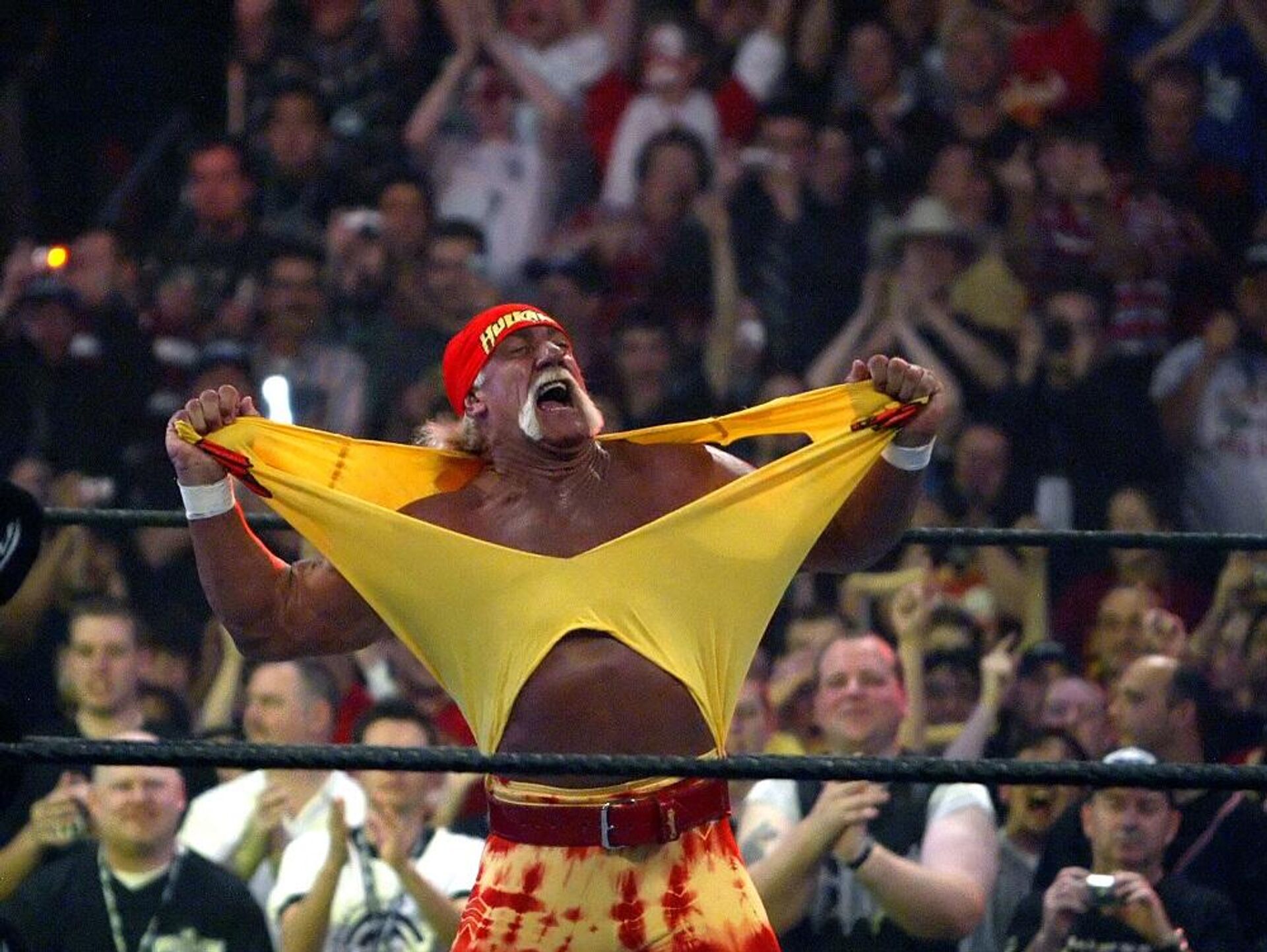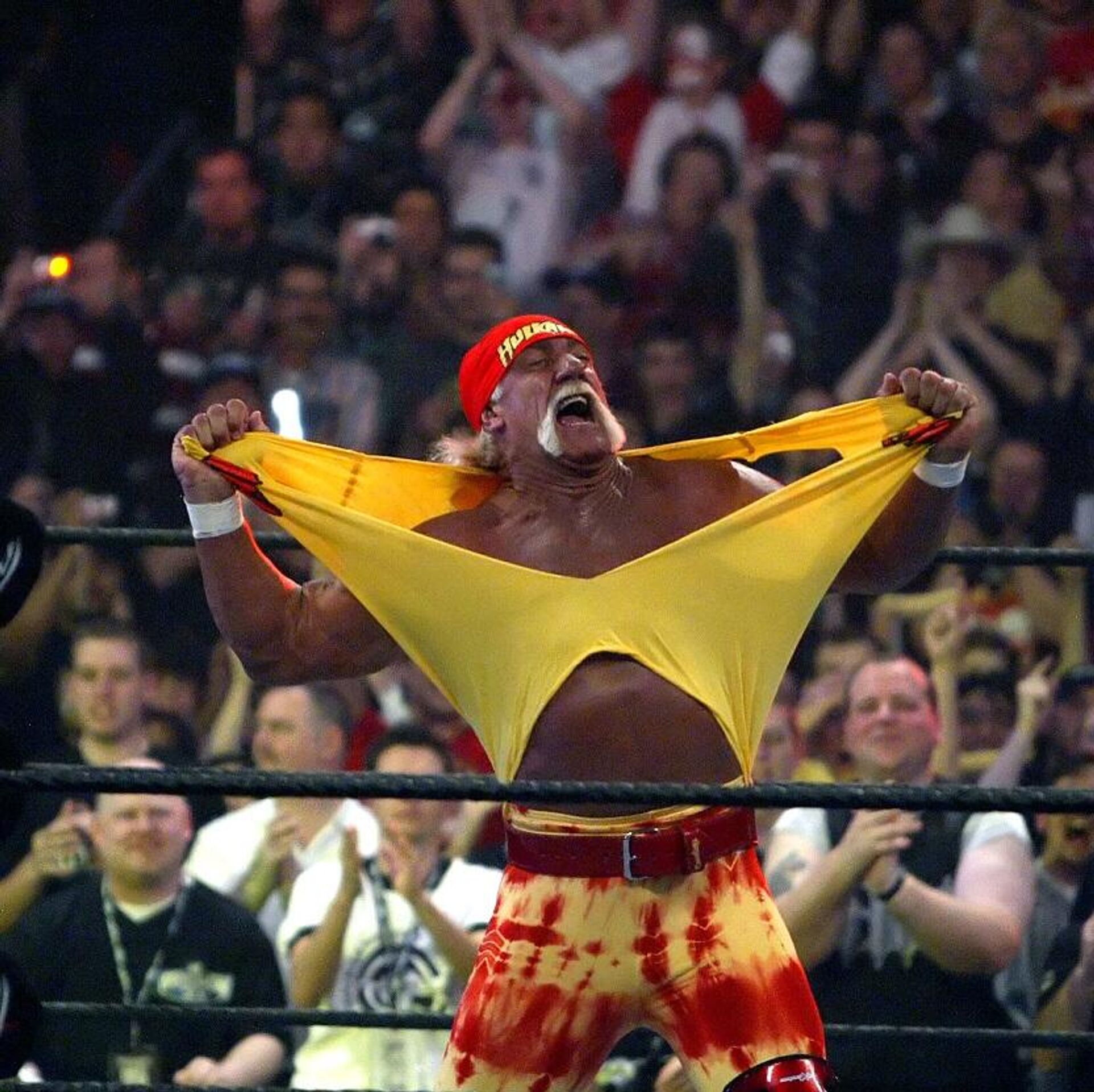كما أن هوغان معروف ببنيته الجسدية الضخمة التي يبلغ طولها مترين، وقميصه الأصفر المميز.