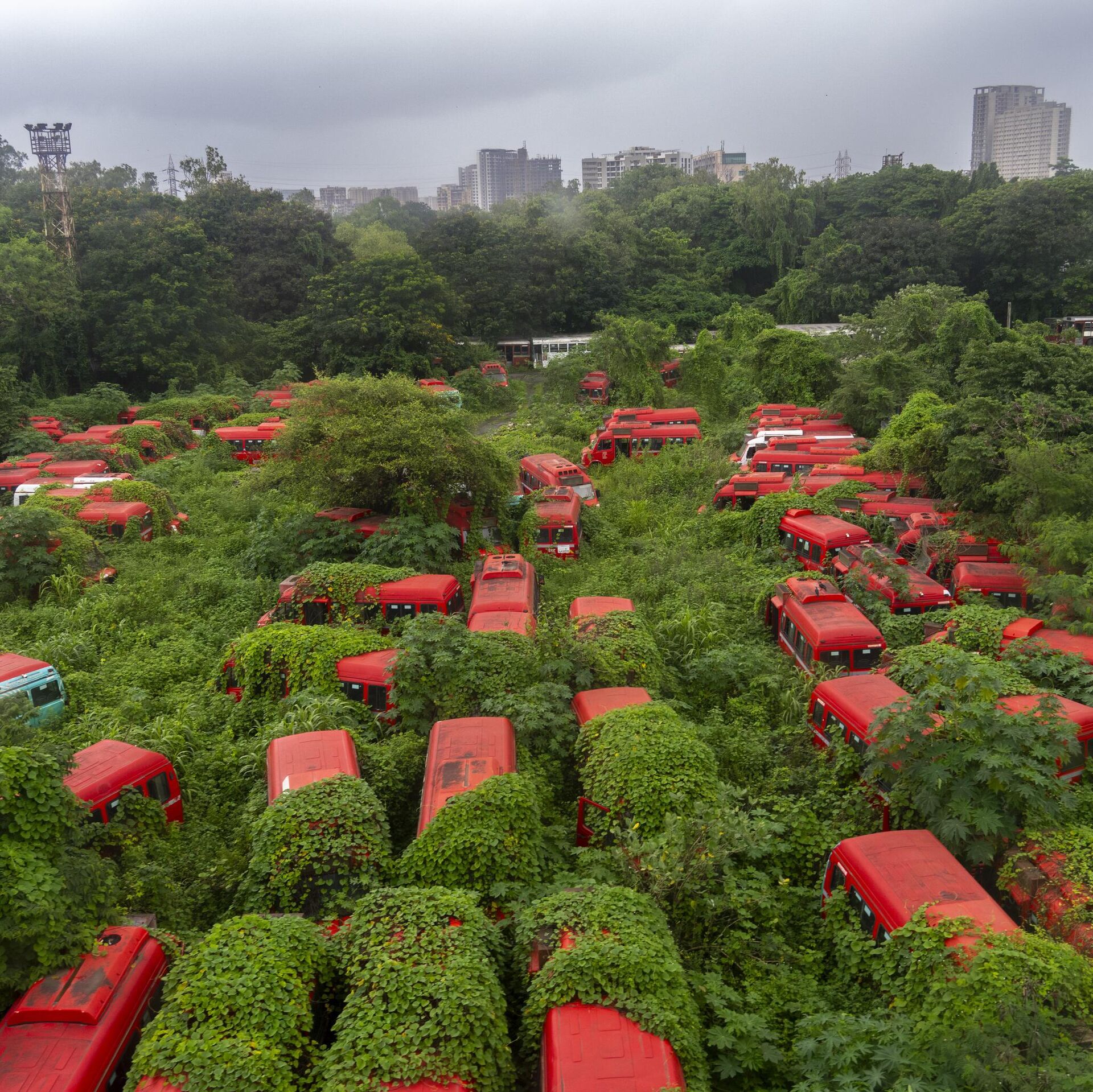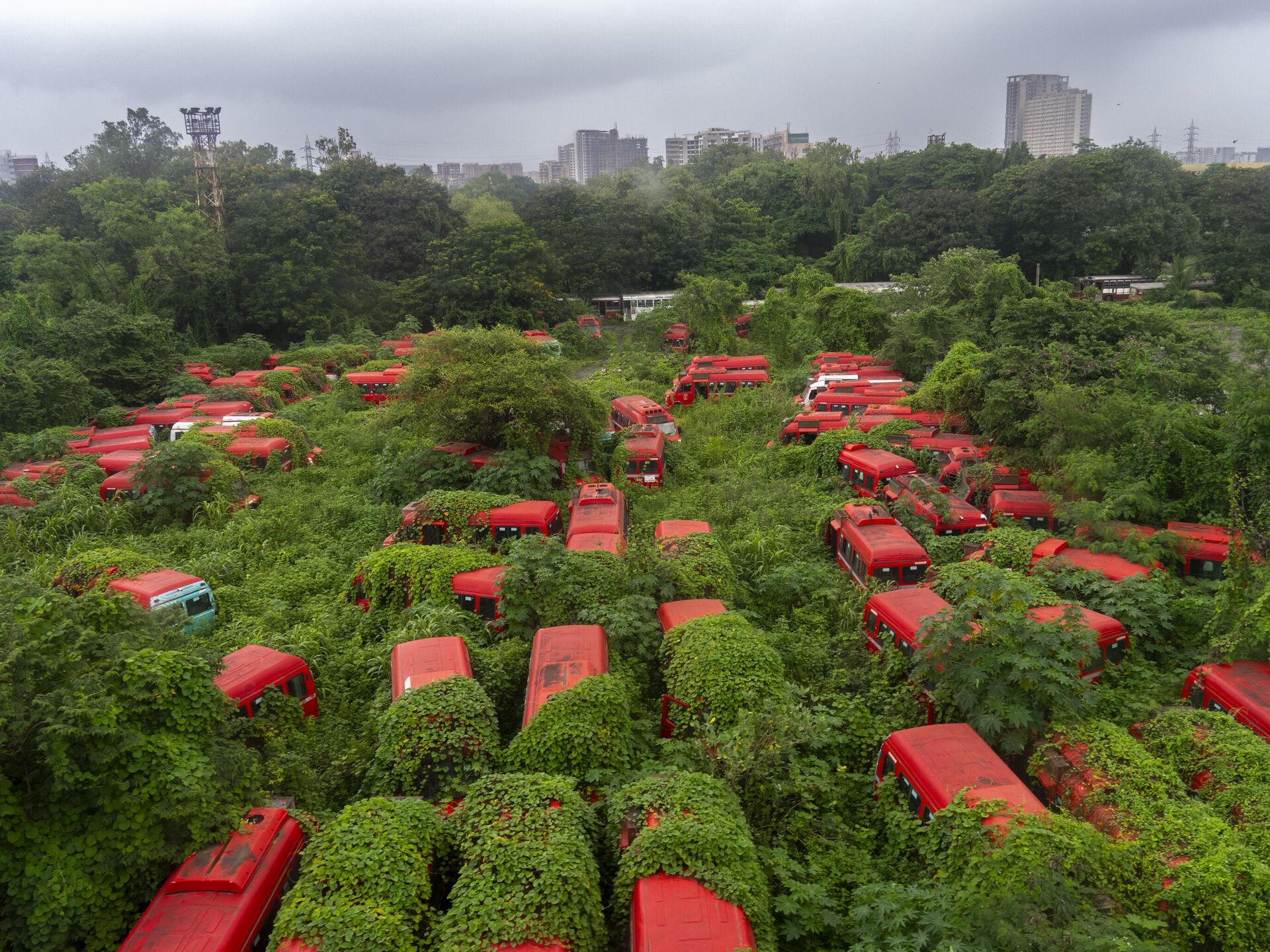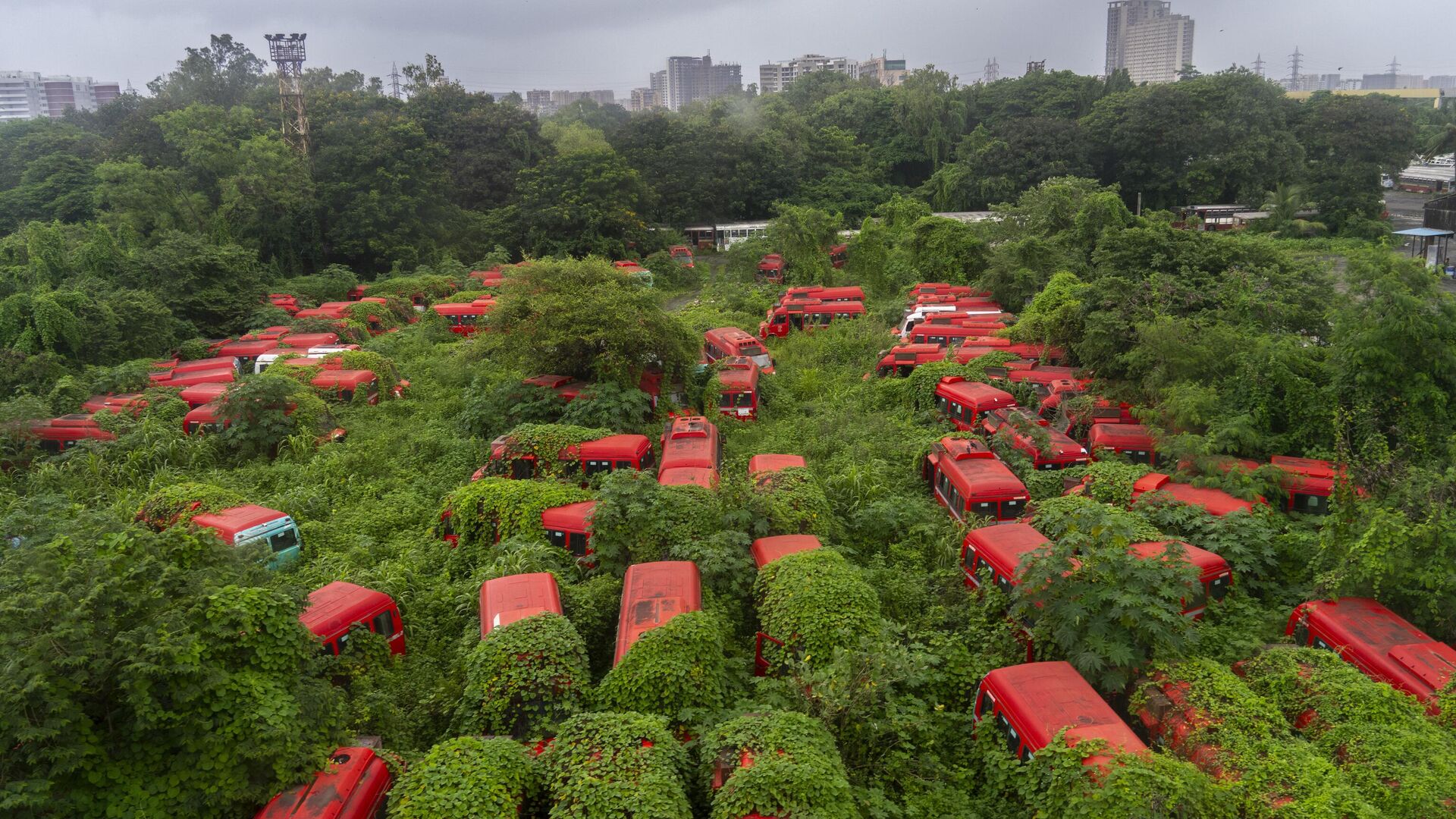 النباتات تظر فوق حافلات صغيرة تابعة لشركة "بريهان مومباي" للكهرباء والنقل بعد أن أنهت خدمتها في محطة حافلات مومباي، الهند.