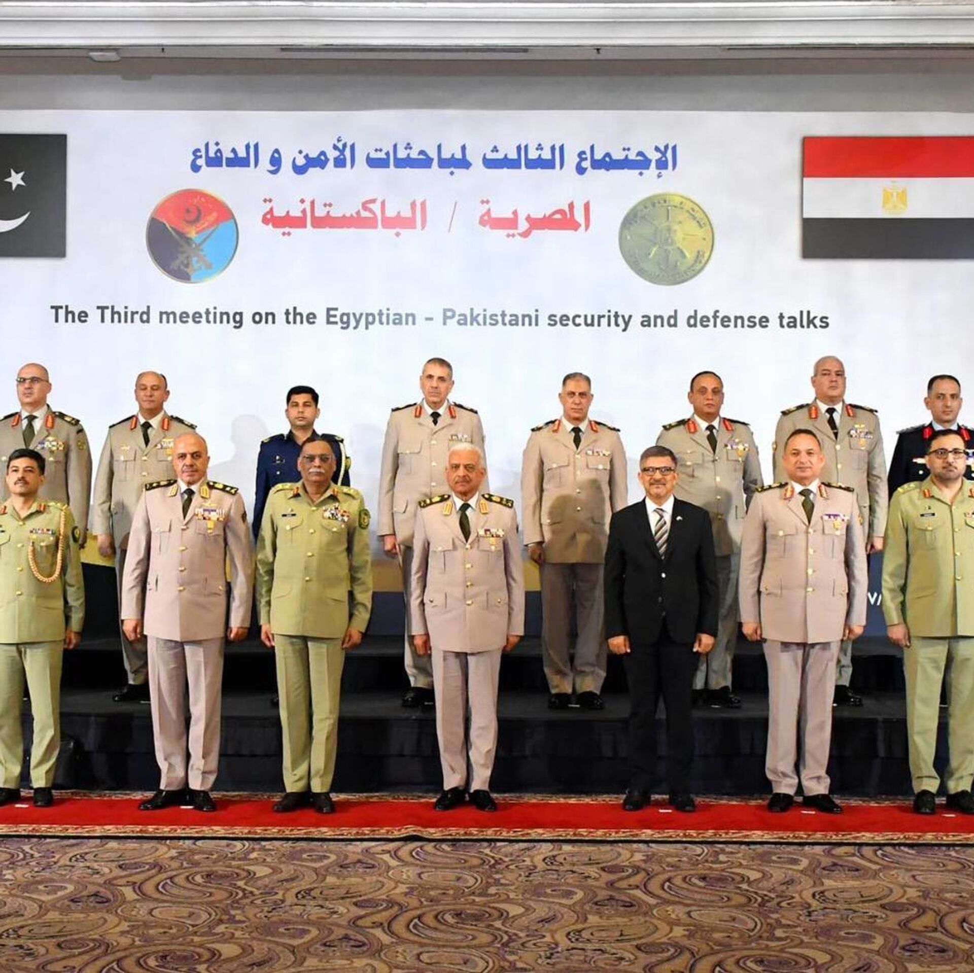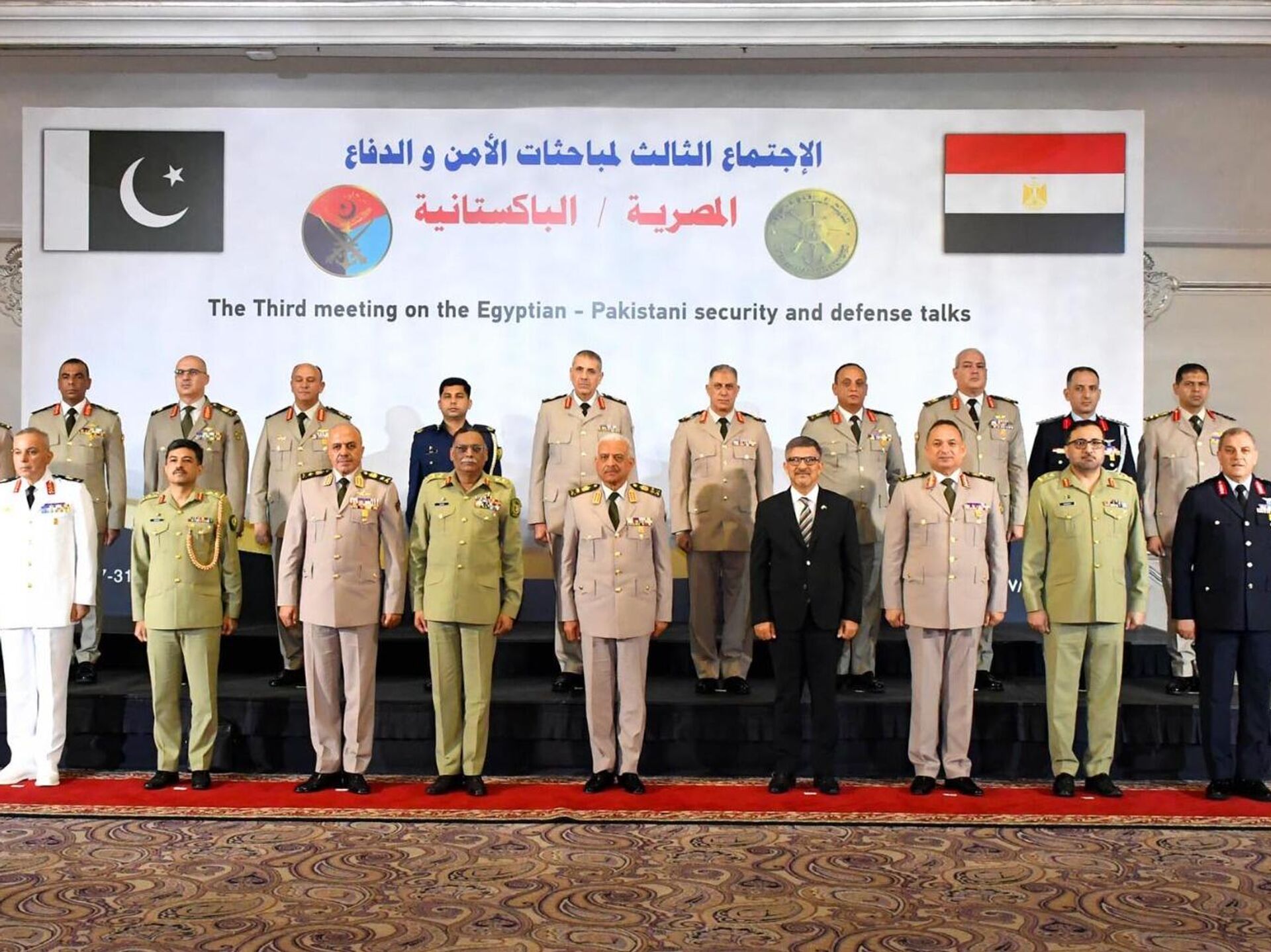 وجرت مراسم استقبال رسمية للوفد العسكري الباكستاني بمقر الأمانة العامة لوزارة الدفاع المصرية، تخللتها عزف السلام الوطني للبلدين، حسبما ذكرت "