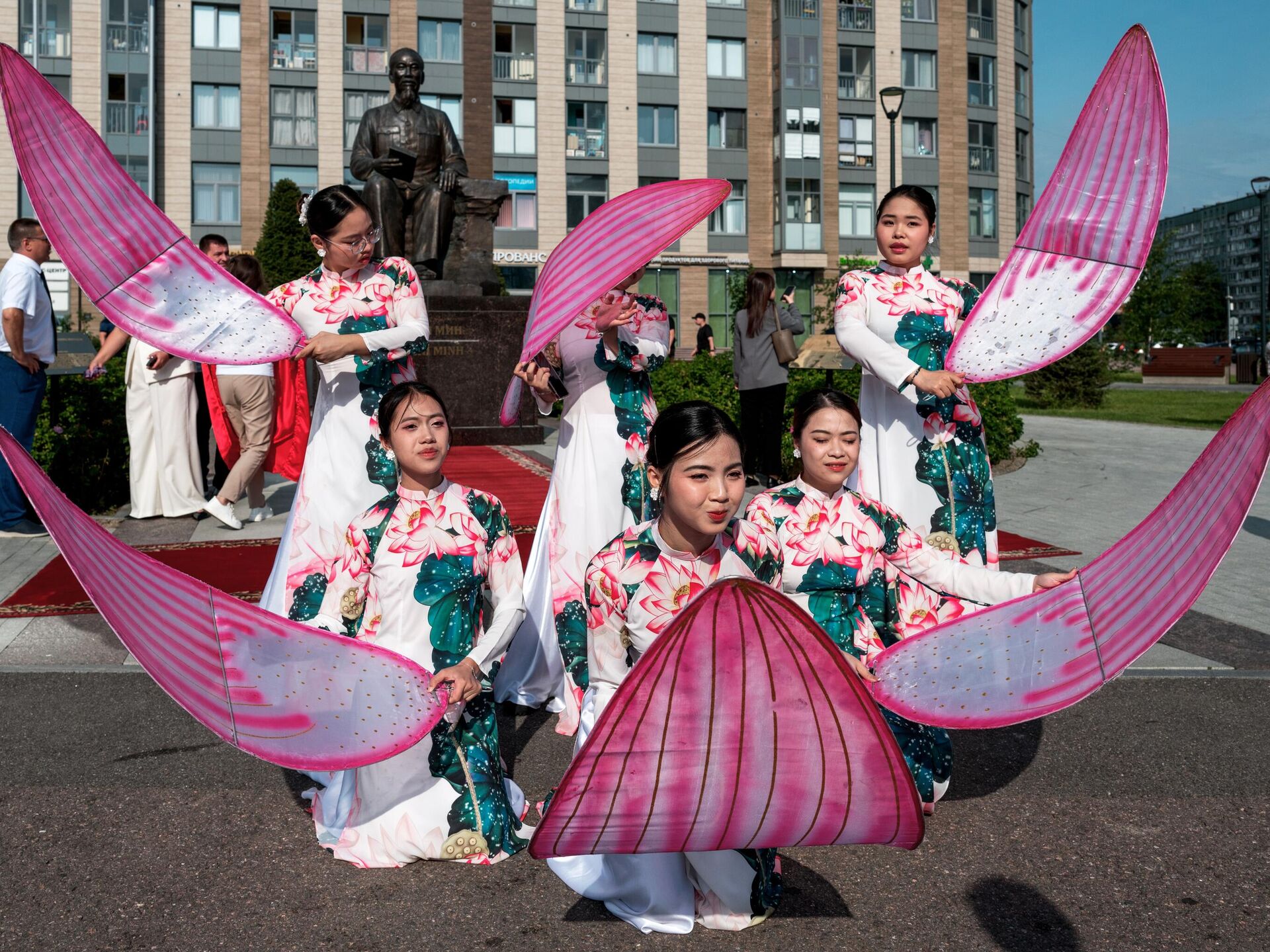 صورة تجمع السفيرة فوق العادة والمفوضة لجمهورية فيتنام الاشتراكية لدى روسيا الاتحادية، دانغ مينه خوي، وحاكم سانت بطرسبورغ، ألكسندر بيغلوف، ورئيس الجمعية التشريعية في سانت بطرسبورغ، ألكسندر بيلسكي، خلال جلسة تصوير جماعية في حفل افتتاح ساحة "هو تشي منه"، في سانت بطرسبورغ.