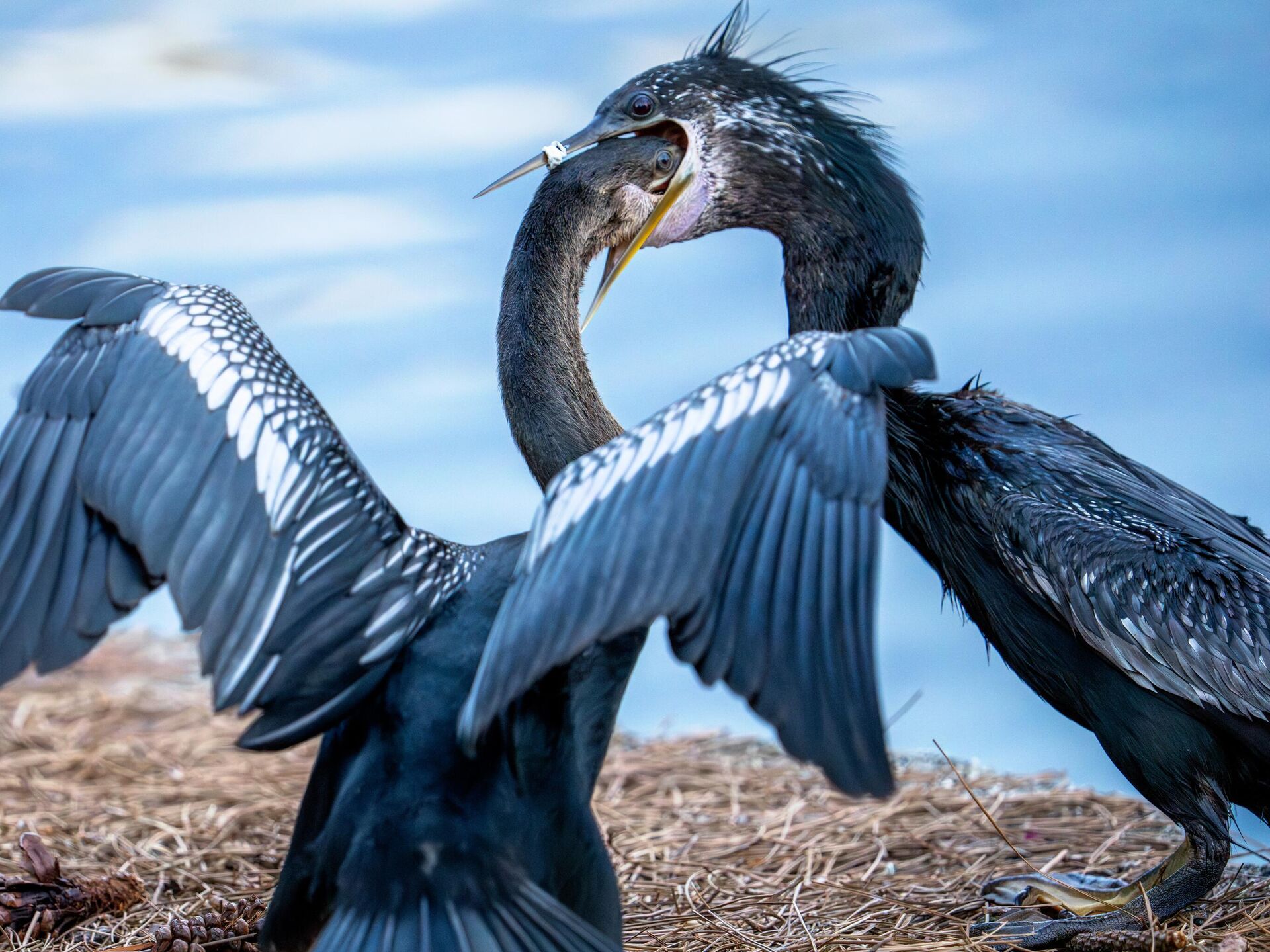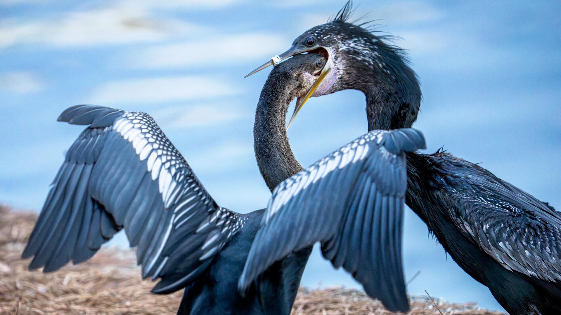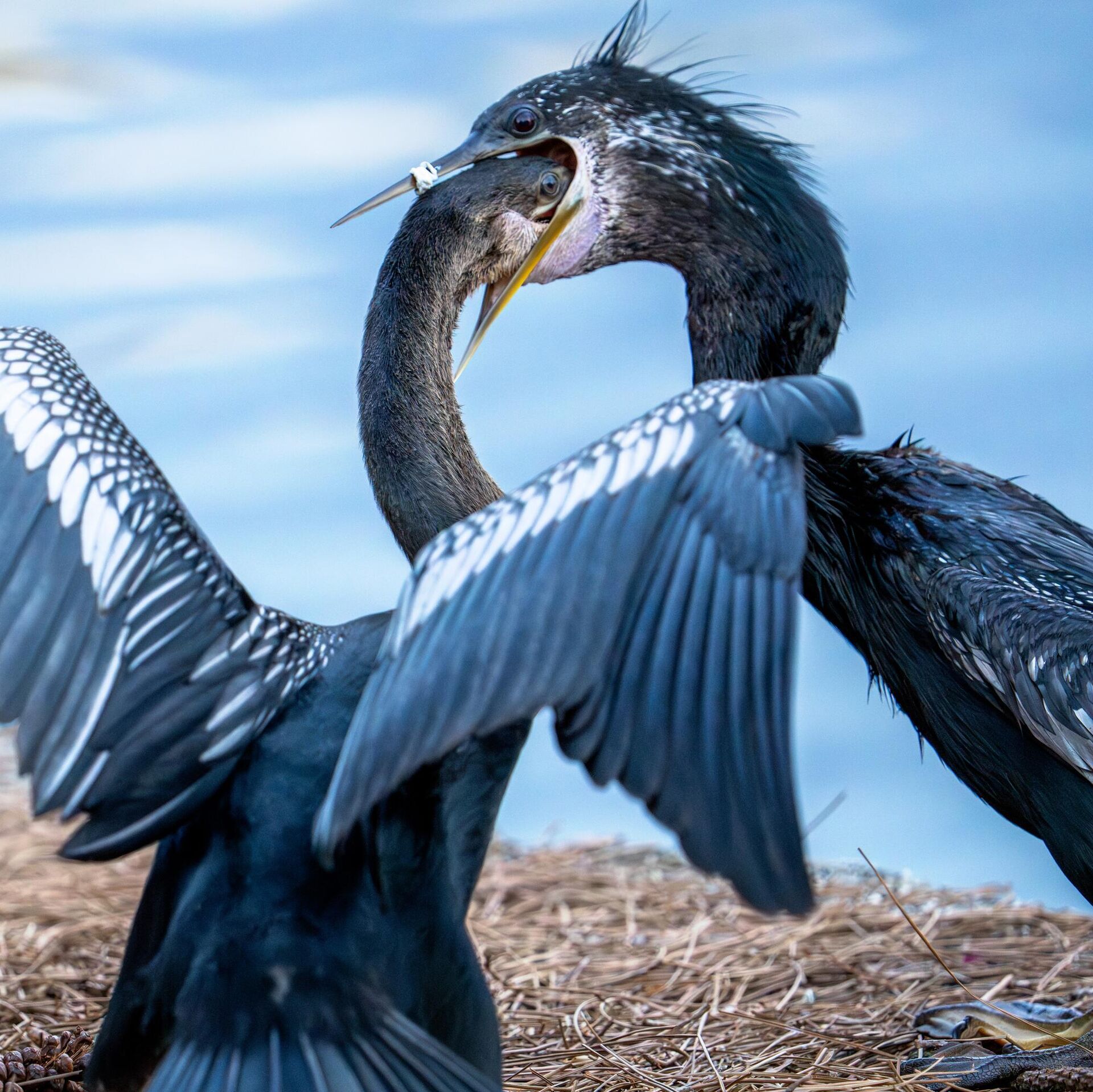 الولايات المتحدة الأمريكية... فرخ طائر دارتر يضع رأسه في حلق أمه أثناء إطعامه سمكة