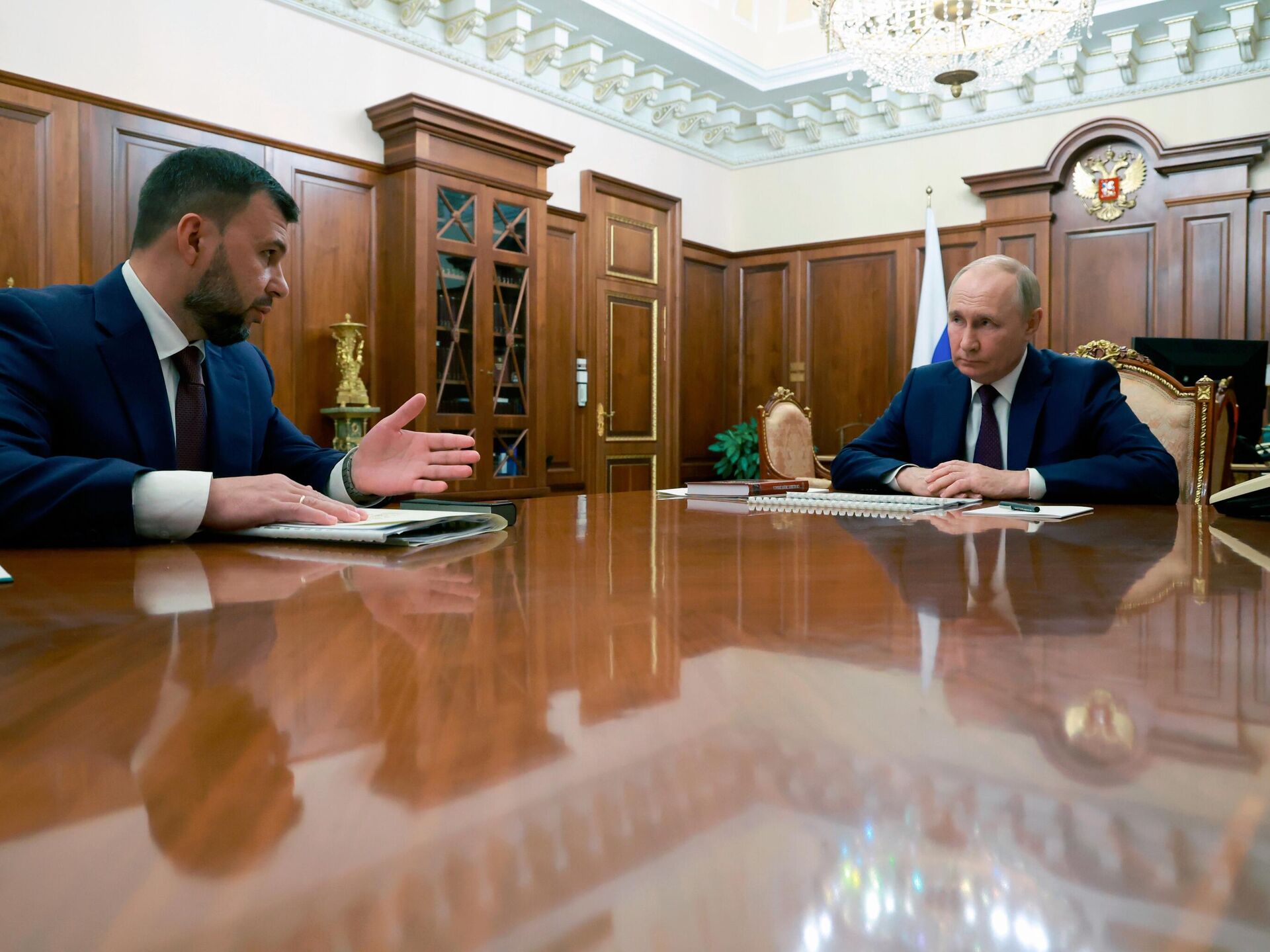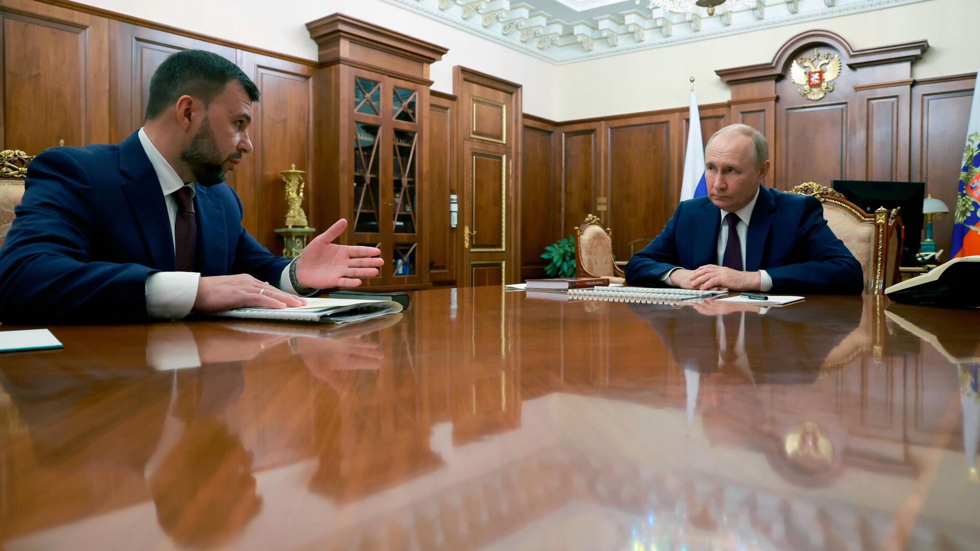 © Photo / POOL / الانتقال إلى بنك الصوررئيس جمهورية دونيتسك الشعبية دينيس بوشيلين خلال اجتماع في موسكو مع الرئيس الروسي فلاديمير بوتن