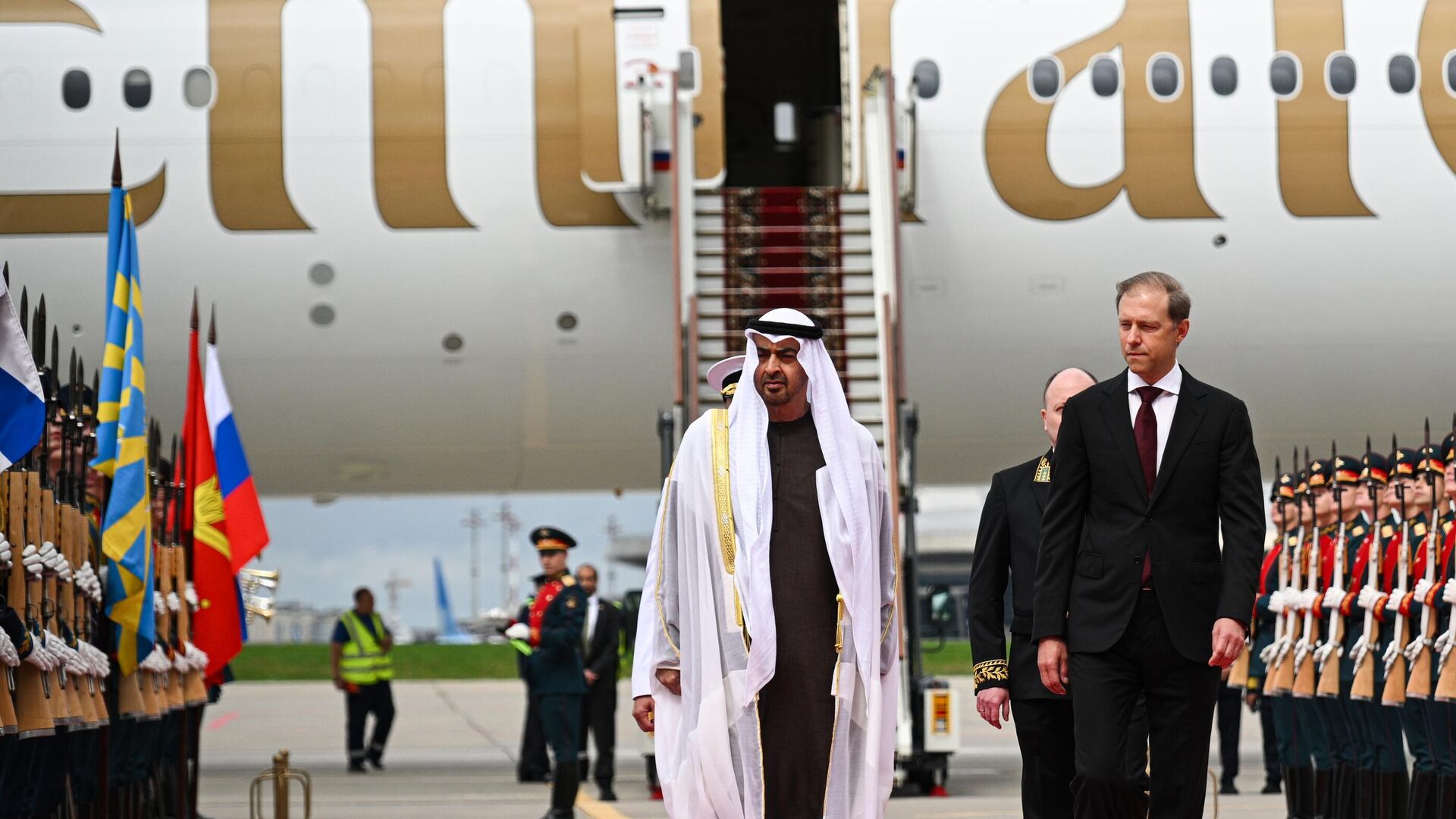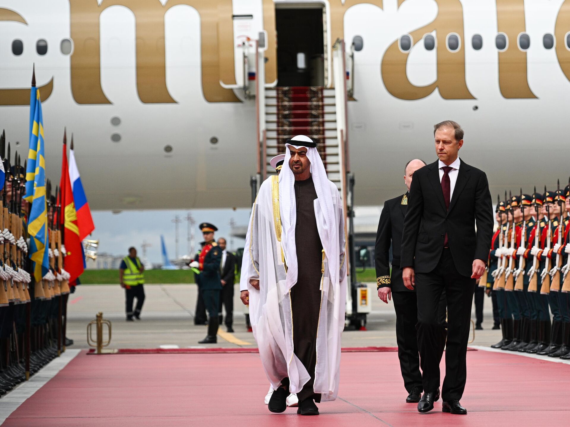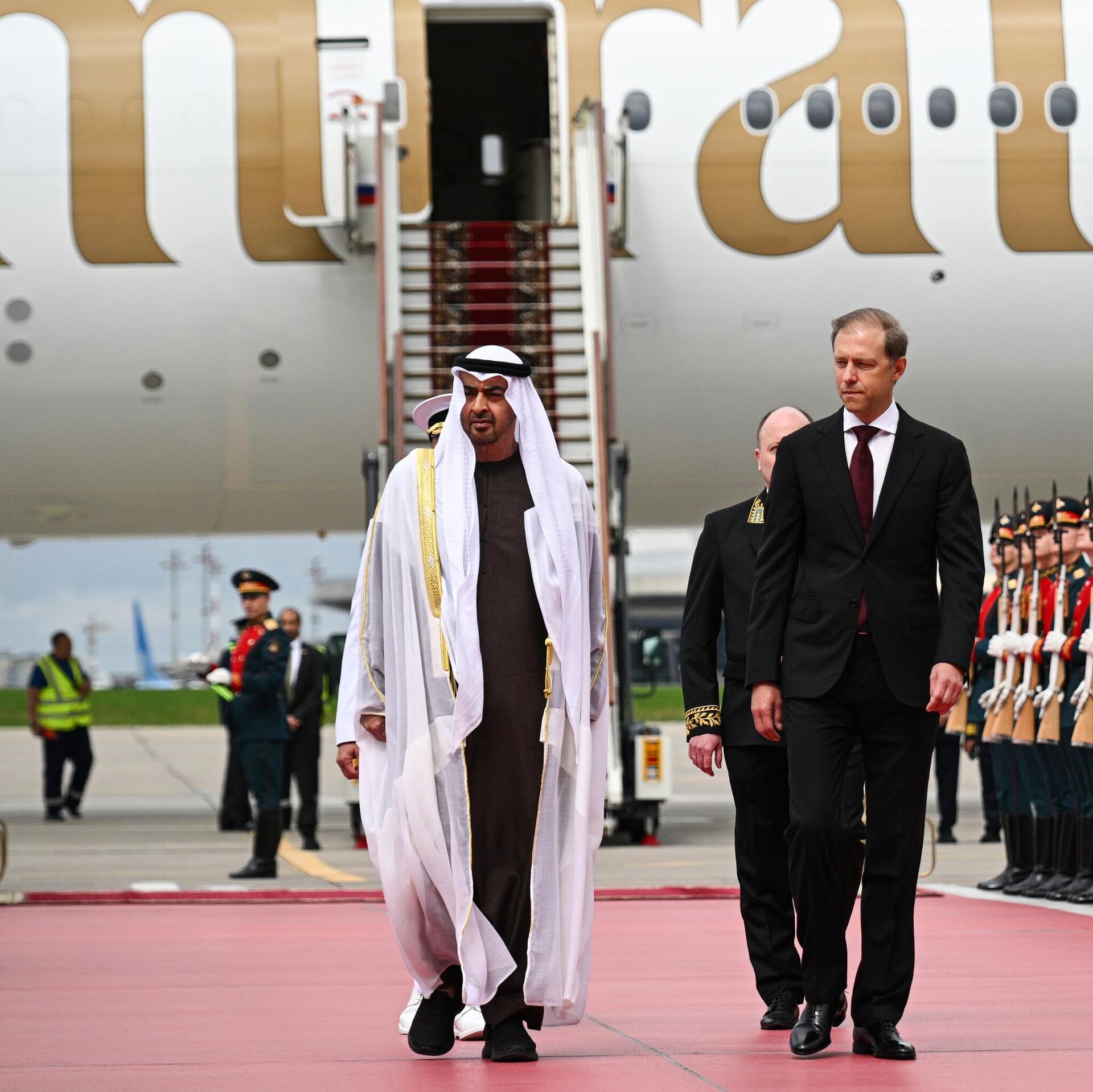 وصل رئيس دولة الإمارات العربية المتحدة، محمد بن زايد آل نهيان (يسار)، إلى موسكو في زيارة رسمية. على اليمين، النائب الأول لرئيس وزراء الاتحاد الروسي، دينيس مانتوروف. - سبوتنيك عربي, 1920, 07.08.2025