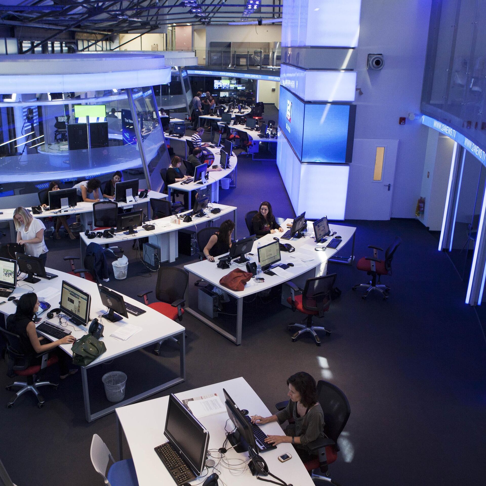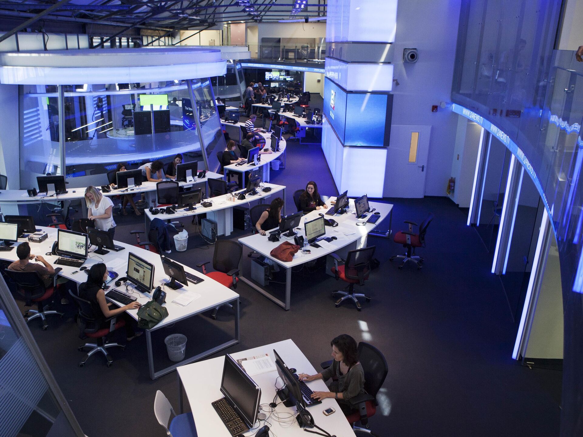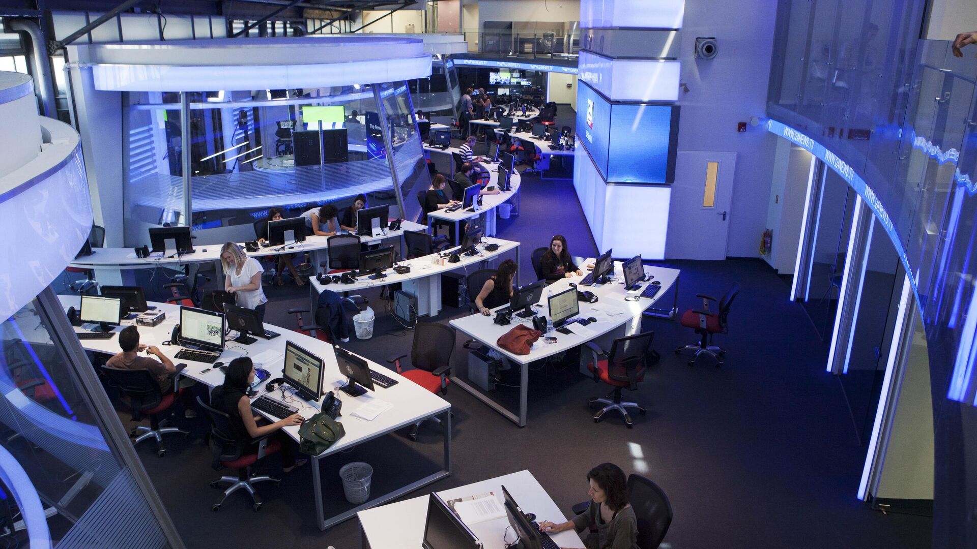 © AP Photo / Dan Baliltyصحفيون يعملون داخل استوديو قناة تلفزيونية في تل أبيب، إسرائيل
