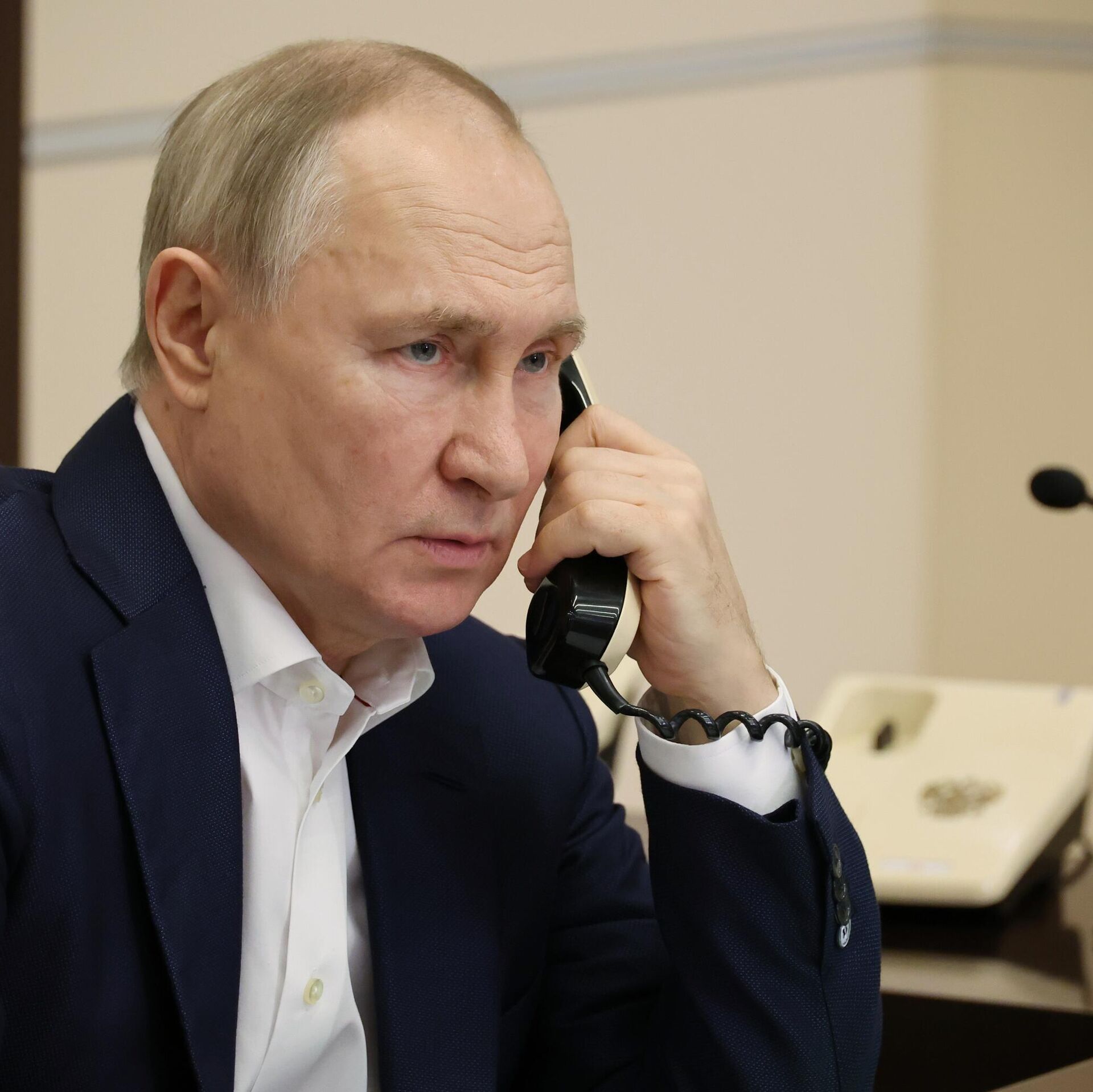 © Sputnik . Mikhail Klimentyev / الانتقال إلى بنك الصورالرئيس الروسي فلاديمير بوتين يتحدث عبر الهاتف