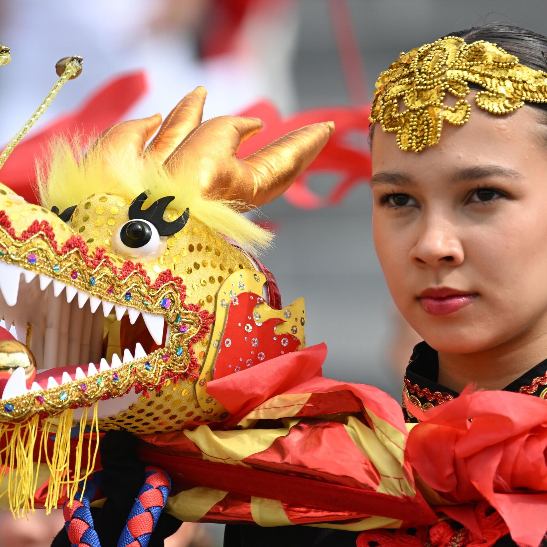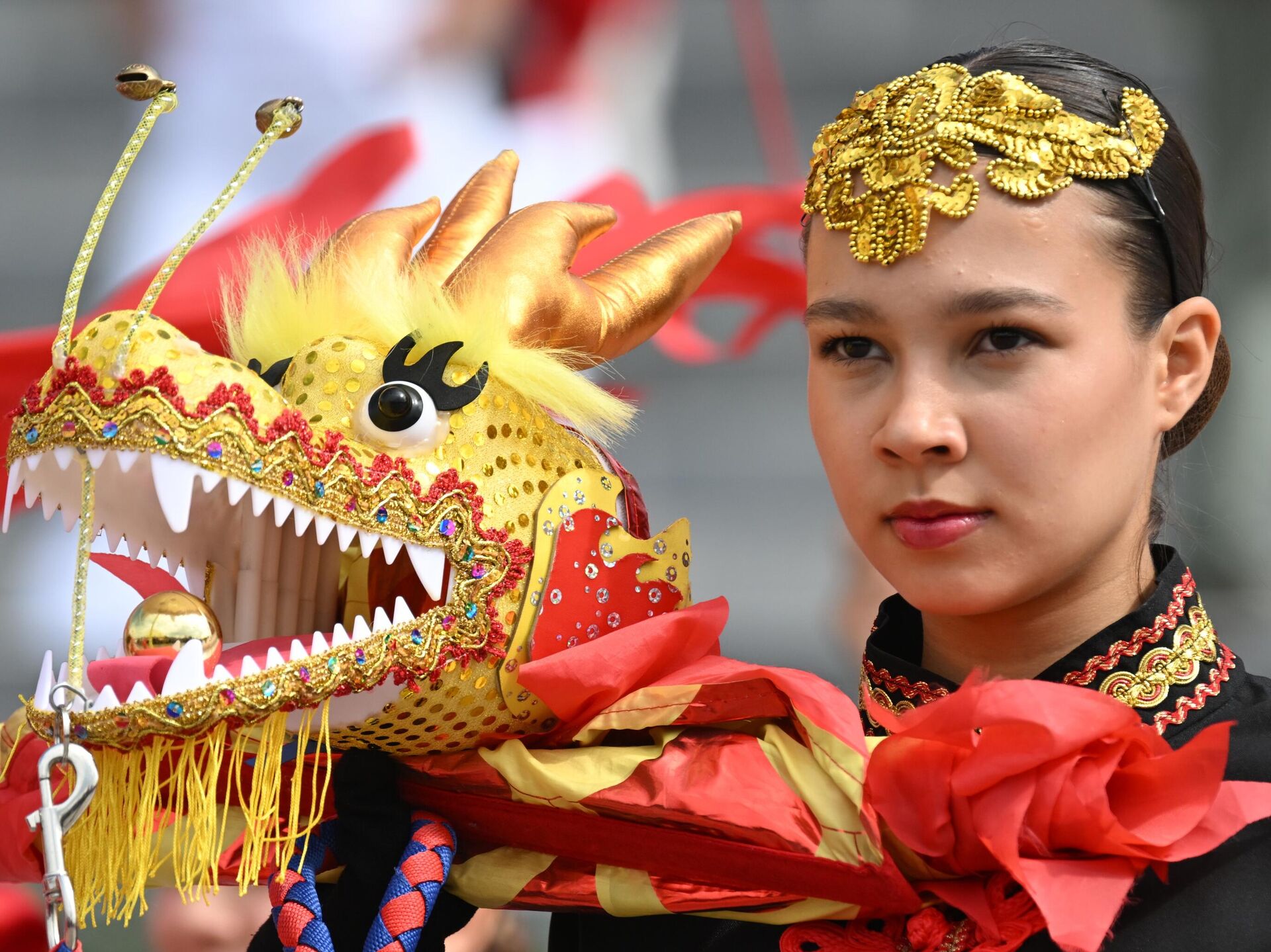 متسابقون يتنافسون ضمن مسابقة "قوارب التنين" الصينية، في بحيرة "نيجني كابان" في مدينة قازان الروسية