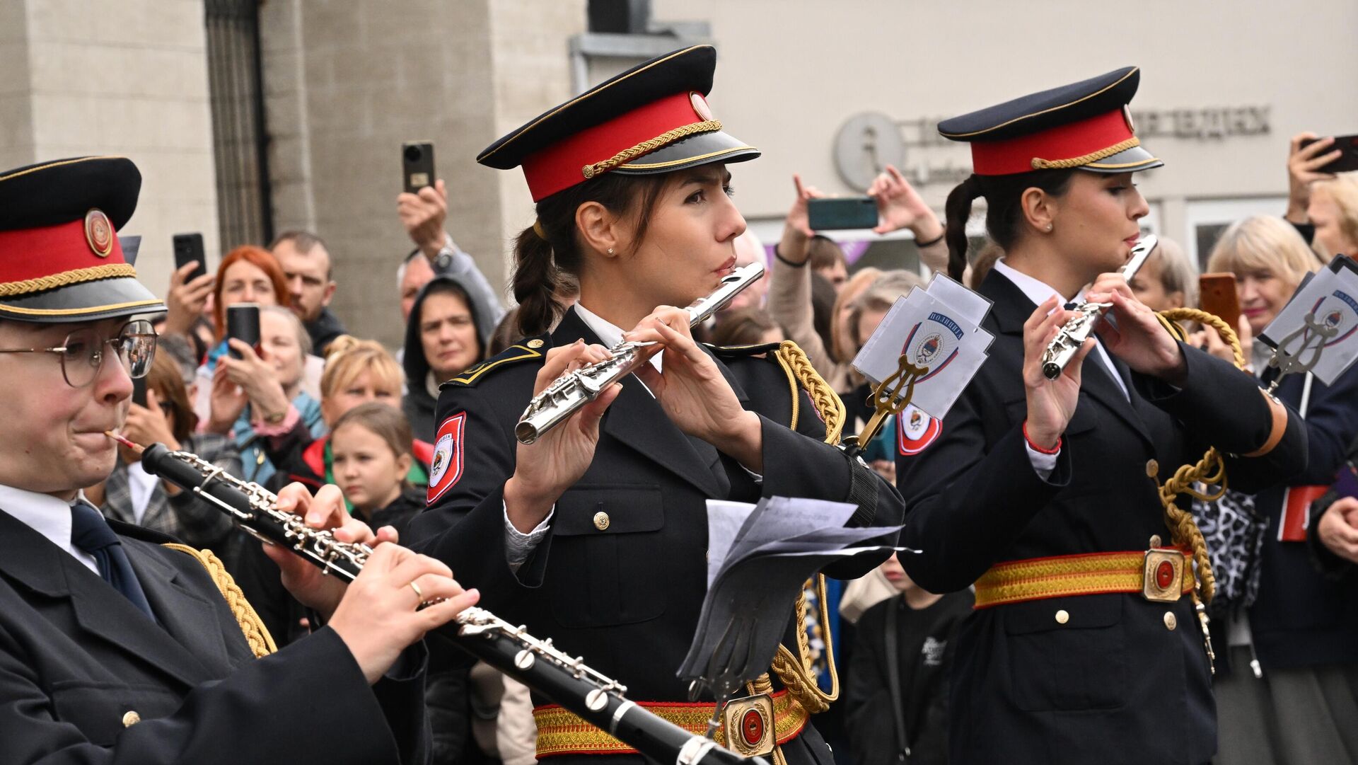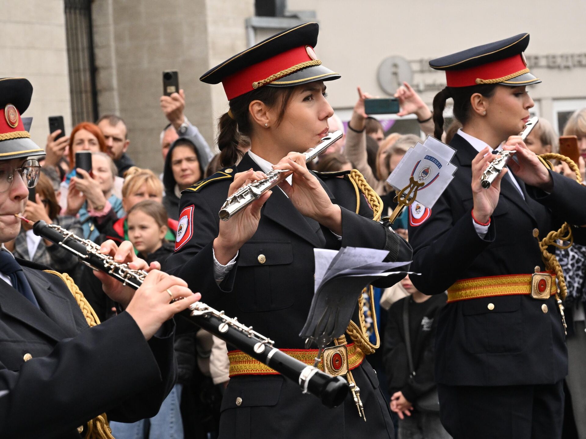 الجمهور يستمع إلى أداء أوركسترا مكتب قيادة القوات المركزية للحرس الوطني الروسي (روسغفارديا) خلال مسيرة المشاركين في المهرجان الدولي للموسيقى العسكرية "برج سباسكايا"في حديقة "فدينخا" في موسكو.