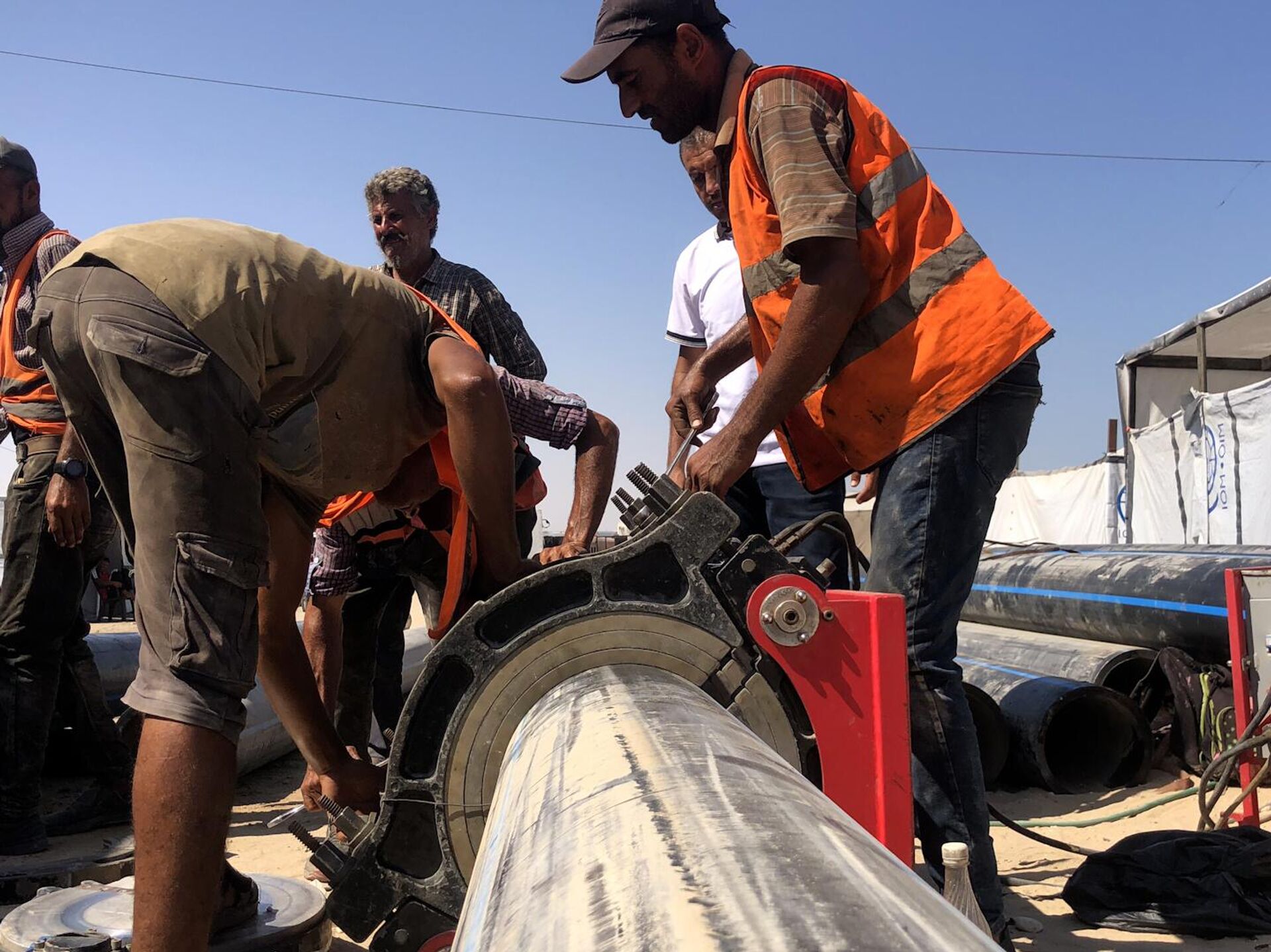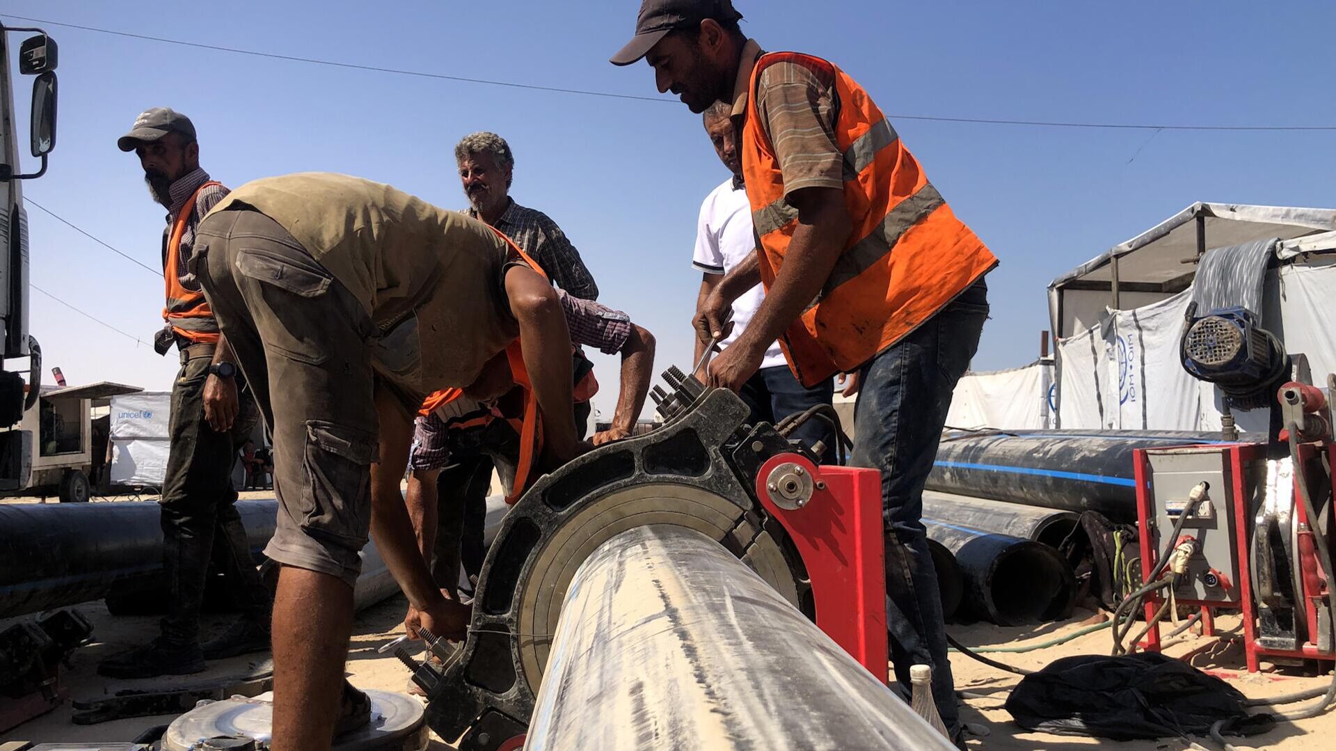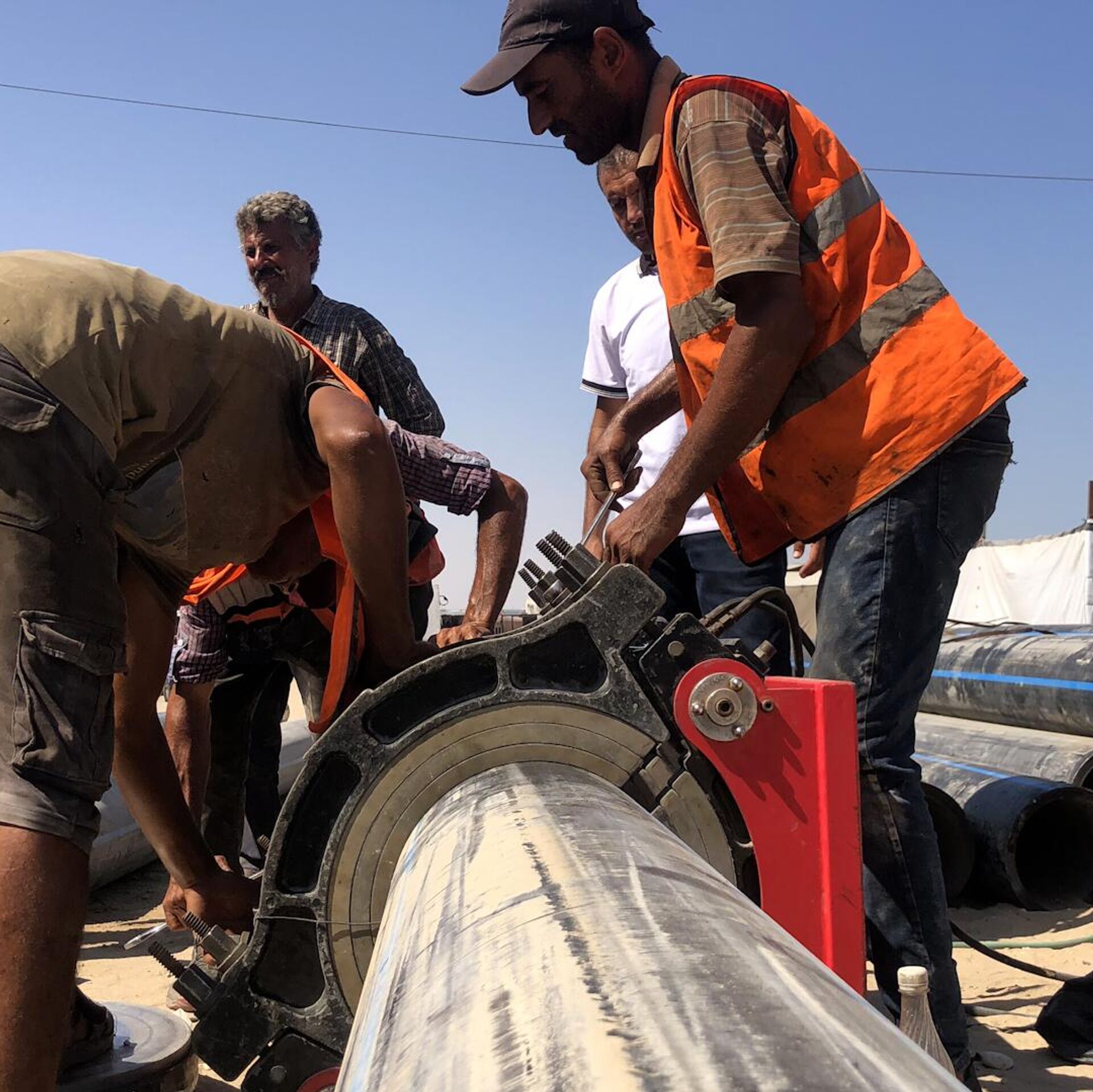 ويضيف: "قدرة الخط الإنتاجية تقدر بـ 10 آلاف متر مكعب من المياه المحلاة، ومدة المشروع شهر، ونحن نعمل منذ حوالي 20 يوما، وانجزنا أكثر من 60% من الأنابيب، وسنكمل قريبا كافة التجهيزات ليكون خط المياه جاهزا، ونقدم المياه لقرابة 600 ألف نازح بواقع 15 لتر لكل فرد، وهو الحد الأدنى لحصة الفرد من المياه المحلاة يوميا حسب المعايير الدولية".