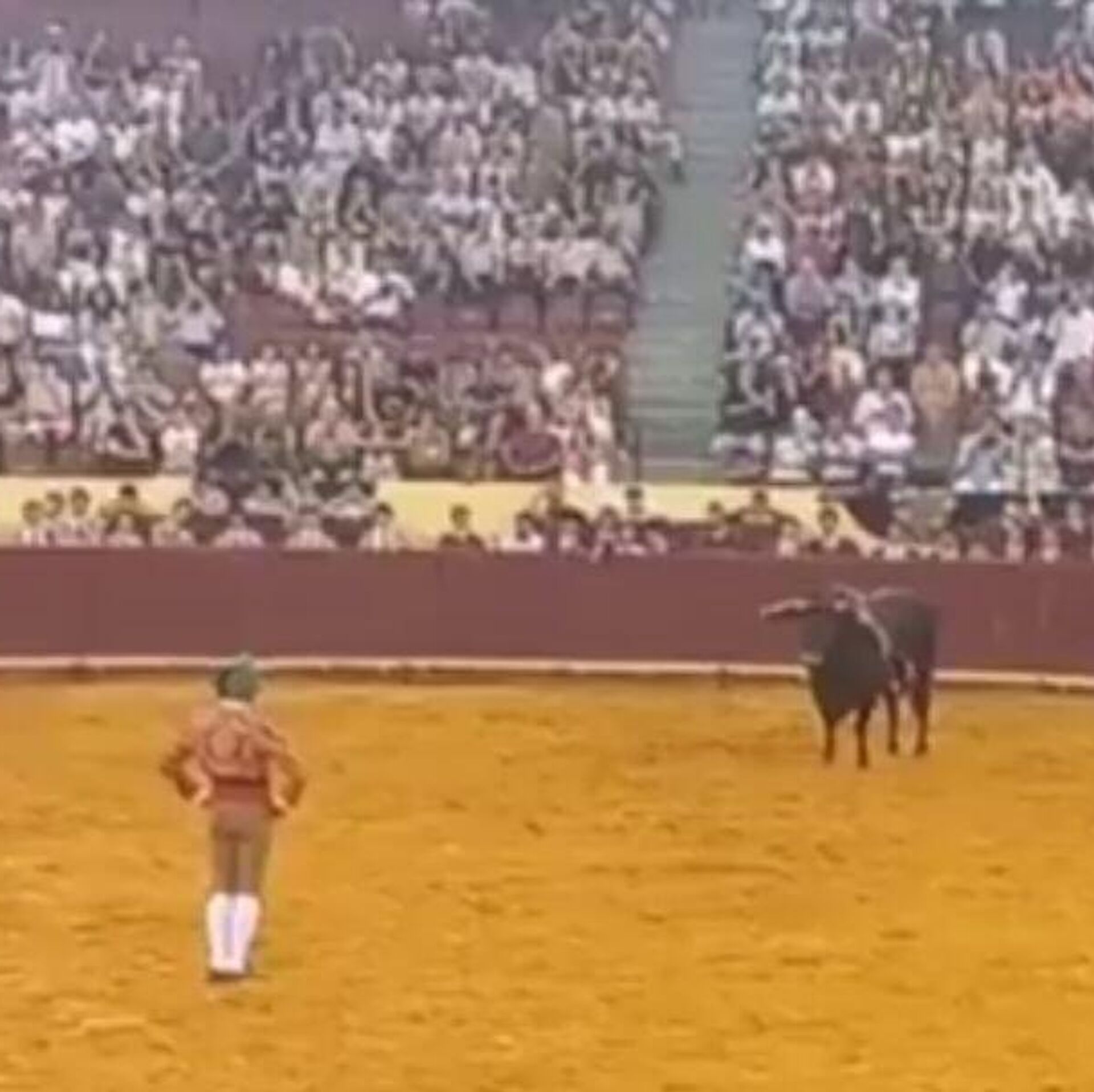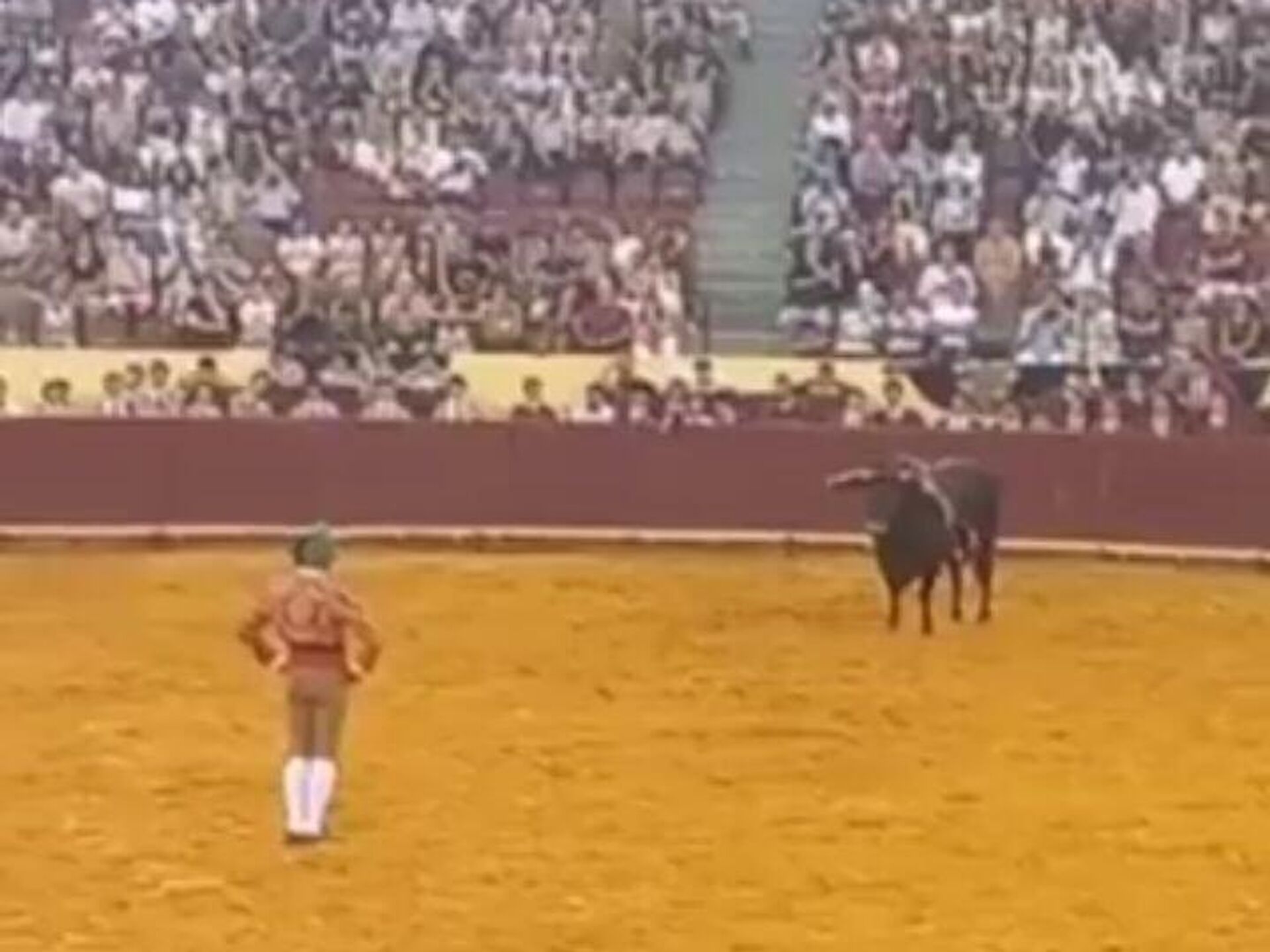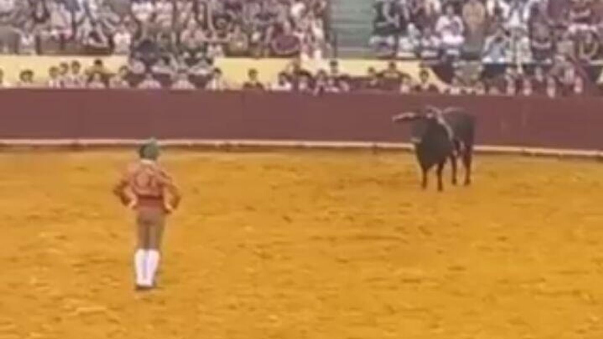 وخلال العرض، حاول المصارع الشاب الإمساك بقرن الثور لإظهار شجاعته، إلا أن الحيوان الهائج قذفه في الهواء بعنف، قبل أن يسقط بقوة على جدار الحلبة، وسط صرخات وذهول الحاضرين.