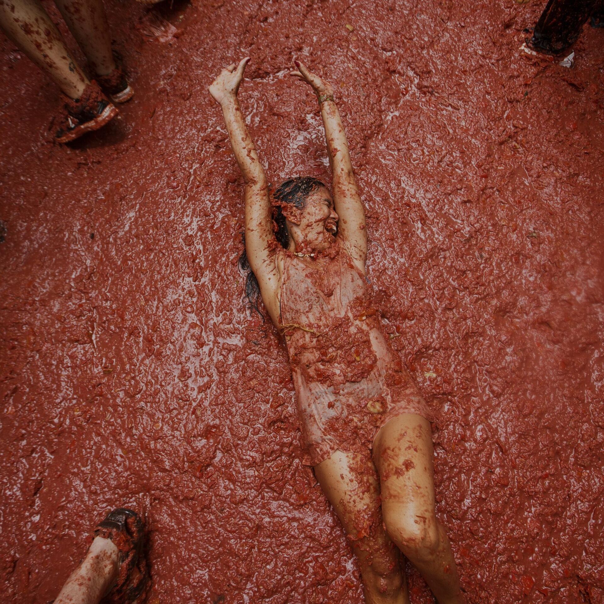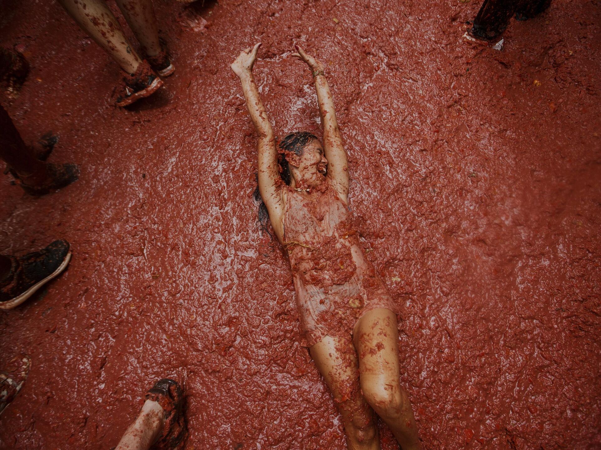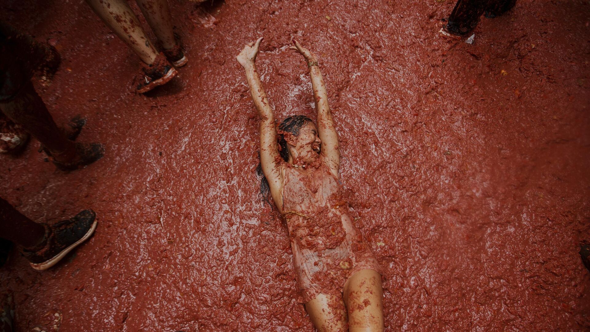 © AP Photo / Alberto Saiz امرأة تتفاعل مع المشاركين في مهرجان الطماطم السنوي "توماتينا"، الذي يتبادلون فيه رشق بعضهم بالطماطم، في قرية بونول بالقرب من فالنسيا في إسبانيا.