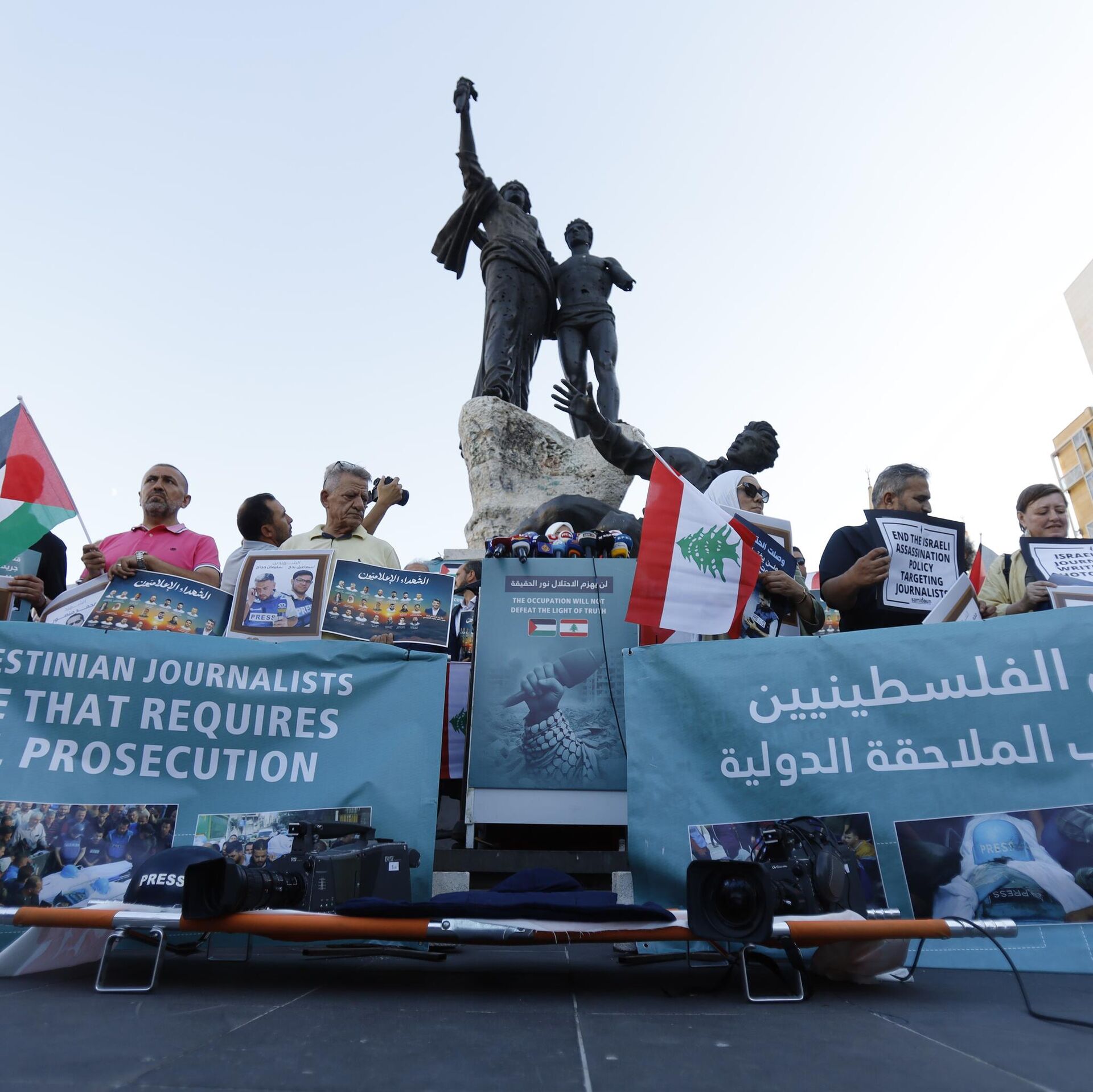 نفذ عشرات الصحافيين والإعلاميين اللبنانيين والفلسطينيين والأجانب، من مختلف الوسائل المحلية والعربية والدولية، وقفة تضامنية في ساحة "الشهداء" وسط بيروت، اليوم الاثنين، تضامنا مع الصحافيين الفلسطينيين واستنكارا للقمع الإسرائيلي الذي يستهدف المؤسسات الإعلامية.