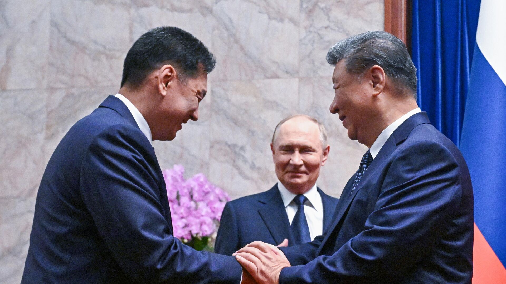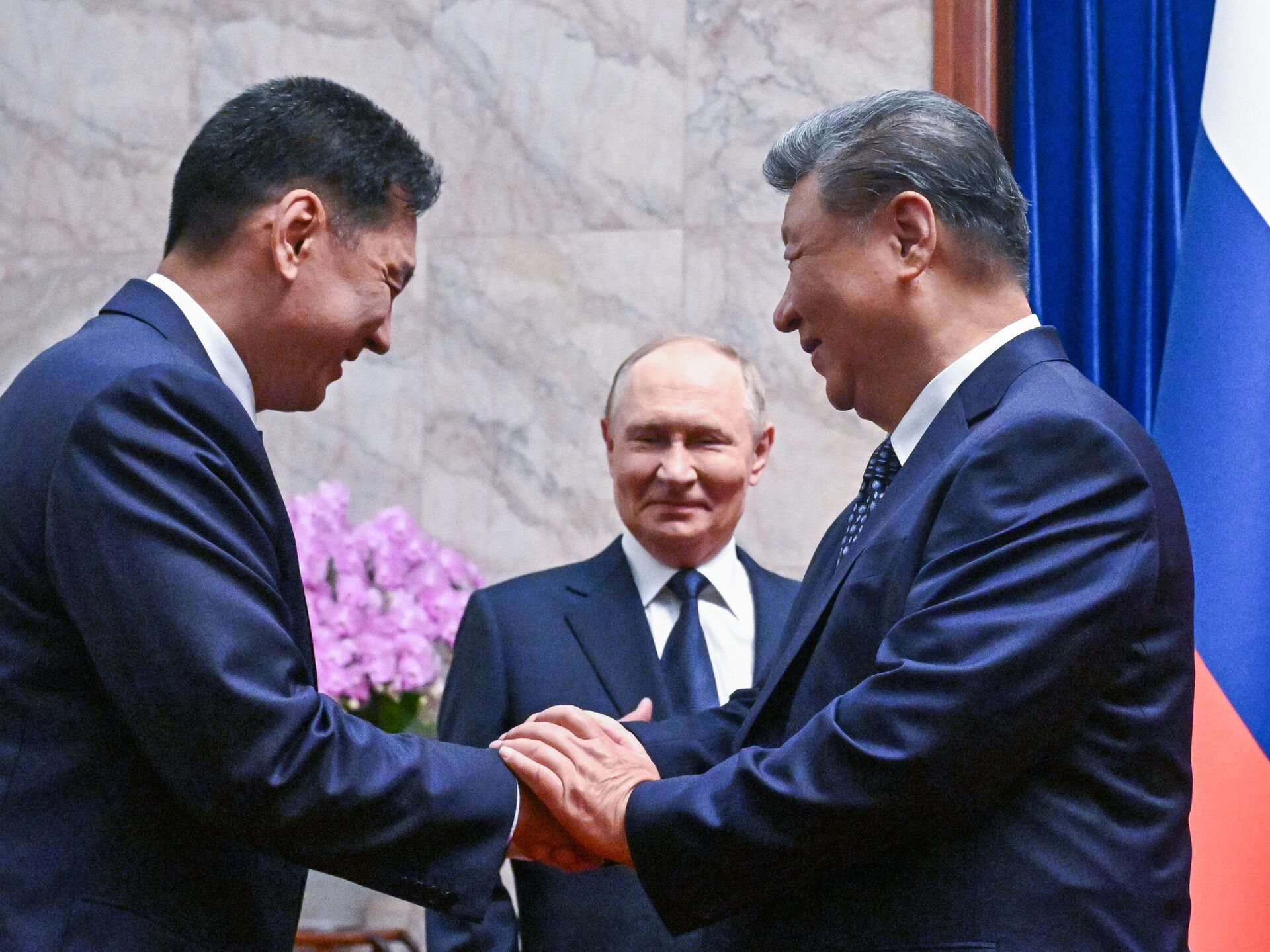 الرئيس الروسي فلاديمير بوتين، ورئيس الوزراء الهندي ناريندرا مودي، والرئيس الصيني شي جين بينغ، يتحدثون قبل قمة منظمة "شنغهاي للتعاون"، في مركز "ميجيانغ" للمؤتمرات والمعارض في تيانجين